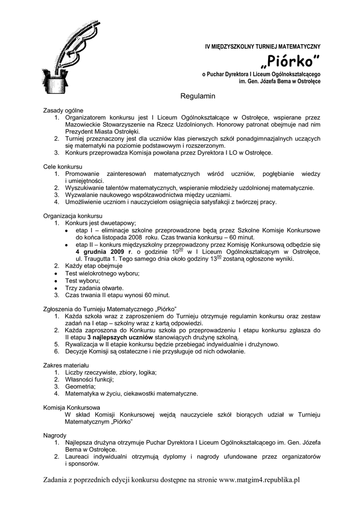 IV MIĘDZYSZKOLNY TURNIEJ MATEMATYCZNY „Piórko” o Puchar Dyrektora I Liceum Ogólnokształcącego im. Gen. Józefa Bema w Ostrołęce Regulamin Zasady ogólne 1. Organizatorem konkursu jest I Liceum Ogólnokształcące w Ostrołęce, wspierane przez Mazowieckie Stowarzyszenie na Rzecz Uzdolnionych. Honorowy patronat obejmuje nad nim Prezydent Miasta Ostrołęki. 2. Turniej przeznaczony jest dla uczniów klas pierwszych szkół ponadgimnazjalnych uczących się matematyki na poziomie podstawowym i rozszerzonym. 3. Konkurs przeprowadza Komisja powołana przez Dyrektora I LO w Ostrołęce. Cele konkursu 1. Promowanie zainteresowań matematycznych wśród uczniów, pogłębianie wiedzy i umiejętności. 2. Wyszukiwanie talentów matematycznych, wspieranie młodzieży uzdolnionej matematycznie. 3. Wyzwalanie naukowego współzawodnictwa między uczniami. 4. Umożliwienie uczniom i nauczycielom osiągnięcia satysfakcji z twórczej pracy. Organizacja konkursu 1. Konkurs jest dwuetapowy; etap I – eliminacje szkolne przeprowadzone będą przez Szkolne Komisje Konkursowe do końca listopada 2008 roku. Czas trwania konkursu – 60 minut. etap II – konkurs międzyszkolny przeprowadzony przez Komisję Konkursową odbędzie się 4 grudnia 2009 r. o godzinie 1000 w I Liceum Ogólnokształcącym w Ostrołęce, ul. Traugutta 1. Tego samego dnia około godziny 1300 zostaną ogłoszone wyniki. 2. Każdy etap obejmuje Test wielokrotnego wyboru; Test wyboru; Trzy zadania otwarte. 3. Czas trwania II etapu wynosi 60 minut. Zgłoszenia do Turnieju Matematycznego „Piórko” 1. Każda szkoła wraz z zaproszeniem do Turnieju otrzymuje regulamin konkursu oraz zestaw zadań na I etap – szkolny wraz z kartą odpowiedzi. 2. Każda zaproszona do Konkursu szkoła po przeprowadzeniu I etapu konkursu zgłasza do II etapu 3 najlepszych uczniów stanowiących drużynę szkolną. 5. Rywalizacja w II etapie konkursu będzie przebiegać indywidualnie i drużynowo. 6. Decyzje Komisji są ostateczne i nie przysługuje od nich odwołanie. Zakres materiału 1. Liczby rzeczywiste, zbiory, logika; 2. Własności funkcji; 3. Geometria; 4. Matematyka w życiu, ciekawostki matematyczne. Komisja Konkursowa W skład Komisji Konkursowej wejdą nauczyciele szkół biorących udział w Turnieju Matematycznym „Piórko” Nagrody 1. Najlepsza drużyna otrzymuje Puchar Dyrektora I Liceum Ogólnokształcącego im. Gen. Józefa Bema w Ostrołęce. 2. Laureaci indywidualni otrzymują dyplomy i nagrody ufundowane przez organizatorów i sponsorów. Zadania z poprzednich edycji konkursu dostępne na stronie www.matgim4.republika.pl