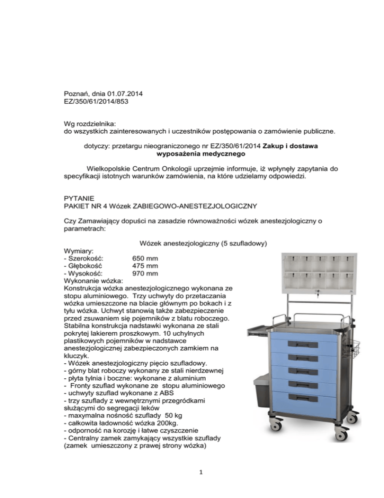Poznań, dnia 01.07.2014 EZ/350/61/2014/853 Wg rozdzielnika: do wszystkich zainteresowanych i uczestników postępowania o zamówienie publiczne. dotyczy: przetargu nieograniczonego nr EZ/350/61/2014 Zakup i dostawa wyposażenia medycznego Wielkopolskie Centrum Onkologii uprzejmie informuje, iż wpłynęły zapytania do specyfikacji istotnych warunków zamówienia, na które udzielamy odpowiedzi. PYTANIE PAKIET NR 4 Wózek ZABIEGOWO-ANESTEZJOLOGICZNY Czy Zamawiający dopuści na zasadzie równoważności wózek anestezjologiczny o parametrach: Wózek anestezjologiczny (5 szufladowy) Wymiary: - Szerokość: 650 mm - Głębokość 475 mm - Wysokość: 970 mm Wykonanie wózka: Konstrukcja wózka anestezjologicznego wykonana ze stopu aluminiowego. Trzy uchwyty do przetaczania wózka umieszczone na blacie głównym po bokach i z tyłu wózka. Uchwyt stanowią także zabezpieczenie przed zsuwaniem się pojemników z blatu roboczego. Stabilna konstrukcja nadstawki wykonana ze stali pokrytej lakierem proszkowym. 10 uchylnych plastikowych pojemników w nadstawce anestezjologicznej zabezpieczonych zamkiem na kluczyk. - Wózek anestezjologiczny pięcio szufladowy. - górny blat roboczy wykonany ze stali nierdzewnej - płyta tylnia i boczne: wykonane z aluminium - Fronty szuflad wykonane ze stopu aluminiowego - uchwyty szuflad wykonane z ABS - trzy szuflady z wewnętrznymi przegródkami służącymi do segregacji leków - maxymalna nośność szuflady 50 kg - całkowita ładowność wózka 200kg. - odporność na korozję i łatwe czyszczenie - Centralny zamek zamykający wszystkie szuflady (zamek umieszczony z prawej strony wózka) 1 - Wózek wyposażony jest w 4 cichobieżne kółka (o średnicy Φ100mm) 2 kółka z blokadą jazdy. - Wysokość szuflad: dolna 1 szt: 21,3cm, 4 szt: 11cm, Wyposażenie standardowe: - metalowa nadstawka anestezjologiczna na lekarstwa zamykana na kluczyk (Przezroczysty pojemnik), - dodatkowy wysuwany blat roboczy z boku wózka, - dwa kosze na odpady - druciany kosz a w nim pojemnik na zużyte igły ODPOWIEDŹ Zamawiający podtrzymuje zapis SIWZ. Ze względu na ograniczenia architektoniczne oraz specyfikę pracy zamawiający oczekuje pulpitu wysuwanego z przodu wózka. Zamawiający oczekuje 3 szuflad o wysokości użytkowej 80mm. oraz 1 szuflady o wysokości użytkowej 200mm. Wysokość szuflad i ich podział dostosowany jest do potrzeb i oczekiwań użytkowników w celu zapewnienia ich optymalnej funkcjonalności. Pozostałe propozycje są akceptowane przez Zamawiającego. PYTANIE PAKIET NR 4 Wózek ZABIEGOWO-ANESTEZJOLOGICZNY Czy Zamawiający dopuści na zasadzie równoważności wózek anestezjologiczny o parametrach: Wózek anestezjologiczny (5 szufladowy) Wymiary: - Szerokość: 650 mm - Głębokość 480 mm - Wysokość: 980 mm Wykonanie wózka: Konstrukcja wózka anestezjologicznego oparta na czterech kolumnach wykonanych ze stali nierdzewnej. Płyty boczne i tylnia ze stopu aluminiowego. - Wózek anestezjologiczny pięcio szufladowy. - górny blat roboczy wykonany z plyty ABS zabezpieczony z trzech stron burtami zapobiegającymi przed przelaniem płynów. - płyta tylnia i boczne: wykonane z aluminium - Fronty szuflad wykonane ze stopu aluminiowego - uchwyty szuflad metalowe - Trzy szuflady wyposażone w wyciągane podziałki służące odpowiedniej segregacji leków - maxymalna nośność szuflady 50 kg - całkowita ładowność wózka 200kg. - odporność na korozję i łatwe czyszczenie - Centralny zamek zamykający wszystkie szuflady (zamek umieszczony z prawej strony wózka) - Wózek wyposażony jest w 4 podwójne cichobieżne kółka (o średnicy Φ100mm) każde z blokadą jazdy. - Metalowy uchwyt do przetaczania wózka - Krążki odbojowe nad kołami wózka zabezpieczające przed obiciem wózka Wyposażenie standardowe (w cenie z tabelki): - metalowa nadstawka anestezjologiczna na lekarstwa zamykana na kluczyk (Przezroczysty pojemnik), 2 - dwa kosze plastikowe - druciany kosz na akcesoria medyczne, szerokość:23cm, głębokość: 11 cm, wysokość: 11 cm - pojemnik na zużyte igły - dodatkowy wysuwany blat roboczy z boku wózka - uchwyt do przetaczania wózka ODPOWIEDŹ Zamawiający podtrzymuje zapis SIWZ. Ze względu na ograniczenia architektoniczne oraz specyfikę pracy zamawiający oczekuje pulpitu wysuwanego z przodu wózka. Zamawiający oczekuje 3 szuflad o wysokości użytkowej 80mm. oraz 1 szuflady o wysokości użytkowej 200mm. Wysokość szuflad i ich podział dostosowany jest do potrzeb i oczekiwań użytkowników w celu zapewnienia ich optymalnej funkcjonalności. Pozostałe propozycje są akceptowane przez Zamawiającego. PYTANIE Dotyczy: pakiet nr 4 – Wózek zabiegowo – anestezjologiczny Czy Zamawiający dopuści wózek zabiegowo – anestezjologiczny z kontenerem 5 szufladowym; wykonany w całości z aluminium, pokrytego winylem; szuflady o wysokościach użytkowych 2x50 mm, 2x100 mm, 1x190 mm; konstrukcja kolumnowa; blat wykonany z tworzywa ABS, z czterema profilowanymi brzegami, uniemożliwiającymi spadanie drobnych przedmiotów; kontener szufladowy z zamkiem centralnym; fronty szuflad wykonane z aluminium; szuflady o konstrukcji ramowej, poruszające się na prowadnicach kulkowych o pełnym wysuwie, z mechanizmem samo dociągu; wkład do szuflady wysokiej wykonany z tworzywa ABS bez podziału wewnętrznego o wysokości użytkowej wkładu 190 mm; wkład do szuflad niskich wykonany z tworzywa ABS trzy podziałowy wewnętrzny o wysokości użytkowej wkładu 50 mm; zespół jezdny składający się z 4 kół o średnicy 120 mm (1 koło z hamulcem + 1 z funkcją jazdy kierunkowej) oraz 4 odbojnic chroniących wózek i ściany przed uszkodzeniami; wszystkie krawędzie zaokrąglone, bezpieczne; wózek konstrukcyjnie przystosowany do mocowania dużej ilości wyposażenia dodatkowego bez konieczności stosowania szyn sprzętowych, wyposażony w 2 x kosz na odpady, wieszak na płyny infuzyjne 1 sztuka, dostawiana półka z dozownikiem cztero