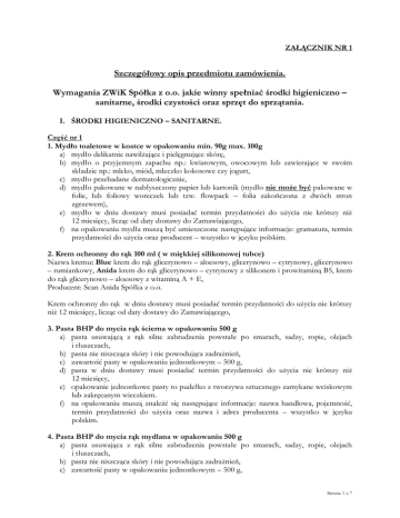 ZAŁĄCZNIK NR 1 Szczegółowy opis przedmiotu zamówienia. Wymagania ZWiK Spółka z o.o. jakie winny spełniać środki higieniczno – sanitarne, środki czystości oraz sprzęt do sprzątania. I. ŚRODKI HIGIENICZNO – SANITARNE. Część nr 1 1. Mydło toaletowe w kostce w opakowaniu min. 90g max. 100g a) mydło delikatnie nawilżające i pielęgnujące skórę, b) mydło o przyjemnym zapachu np.: kwiatowym, owocowym lub zawierające w swoim składzie np.: mleko, miód, mleczko kokosowe czy jogurt, c) mydło przebadane dermatologicznie, d) mydło pakowane w nabłyszczony papier lub kartonik (mydło nie może być pakowane w folie, lub foliowy woreczek lub tzw. flowpack – folia zakończona z dwóch stron zgrzewem), e) mydło w dniu dostawy musi posiadać termin przydatności do użycia nie krótszy niż 12 miesięcy, licząc od daty dostawy do Zamawiającego, f) na opakowaniu mydła muszą być umieszczone następujące informacje: gramatura, termin przydatności do użycia oraz producent – wszystko w języku polskim. 2. Krem ochronny do rąk 100 ml ( w miękkiej silikonowej tubce) Nazwa kremu: Blue krem do rąk glicerynowo – aloesowy, glicerynowo – cytrynowy, glicerynowo – rumiankowy, Anida krem do rąk glicerynowo – cytrynowy z silikonem i prowitaminą B5, krem do rąk glicerynowo – aloesowy z witaminą A + E, Producent: Scan Anida Spółka z o.o. Krem ochronny do rąk w dniu dostawy musi posiadać termin przydatności do użycia nie krótszy niż 12 miesięcy, licząc od daty dostawy do Zamawiającego, 3. Pasta BHP do mycia rąk ścierna w opakowaniu 500 g a) pasta usuwającą z rąk silne zabrudzenia powstałe po smarach, sadzy, ropie, olejach i tłuszczach, b) pasta nie niszcząca skóry i nie powodująca zadrażnień, c) zawartość pasty w opakowaniu jednostkowym – 500 g, d) pasta w dniu dostawy musi posiadać termin przydatności do użycia nie krótszy niż 12 miesięcy, e) opakowanie jednostkowe pasty to pudełko z tworzywa sztucznego zamykane wciskowym lub zakręcanym wieczkiem. f) na opakowaniu muszą znaleźć się następujące informacje: nazwa handlowa, pojemność, termin przydatności do użycia oraz nazwa i adres producenta – wszystko w języku polskim. 4. Pasta BHP do mycia rąk mydlana w opakowaniu 500 g a) pasta usuwająca z rąk silne zabrudzenia powstałe po smarach, sadzy, ropie, olejach i tłuszczach, b) pasta nie niszcząca skóry i nie powodująca zadrażnień, c) zawartość pasty w opakowaniu jednostkowym – 500 g, Strona 1 z 7 d) pasta w dniu dostawy musi posiadać termin przydatności do użycia nie krótszy niż 12 miesięcy, e) opakowanie jednostkowe pasty to pudełko z tworzywa sztucznego zamykane wciskowym lub zakręcanym wieczkiem. f) na opakowaniu muszą znaleźć się następujące informację: nazwa handlowa, pojemność, termin przydatności do użycia oraz nazwa i adres producenta – wszystko w języku polskim. Wyżej wymienione środki higieniczne muszą spełniać wymagania określoną ustawą z dnia 30 marca 2001r o kosmetykach (Dz. U. 42 poz. 473 z późniejszymi zmianami) oraz zgodnie z Rozporządzeniem Parlamentu Europejskiego i Rady (WE) nr 123/2009/WE z dnia 30 listopada 2009 r muszą być zgłoszone do Europejskiego Portalu Zgłaszania Produktów Kosmetycznych (CPNP). Część nr 2 1. Mydło w płynie w opakowaniu 5 litrowym a) mydło przeznaczone do dozownika, b) mydło posiadające przyjemny zapach o gęstej konsystencji np. balsamu, c) mydło musi posiadać pH 5,5, d) mydło przebadane dermatologicznie, e) mydło zawierające substancje np. na bazie oleju kokosowego, pochodne lanoliny, które nawilżają skórę i zabezpieczają ją przed pękaniem i wysuszaniem nadając skórze elastyczność, gładkość, uczucie świeżości i wygładzenie naskórka, f) mydło musi znajdować się w plastikowym kanistrze, g) mydło w płynie w dniu dostawy musi posiadać termin przydatności do użycia nie krótszy niż 12 miesięcy, h) na kanistrze powinny znajdować się następujące informacje: nazwa handlowa, skład mydła, termin przydatności do użycia, pojemność oraz nazwa producenta – wszystko w języku polskim. 2. Pasta do mycia silnie zabrudzonych rąk w opakowaniu 5 litrowym a) pasta w plastikowym kanistrze, na którym będzie można nakręcić pompkę do dozowania pasty, b) pasta przebadana dermatologicznie, c) pasta usuwająca wszelkie zabrudzenia powstałe od olejów silnikowych, smarów, ropy i tłuszczy, d) pasta zawierająca składniki, które zapobiegają pękaniu i wysuszaniu skóry nawet przy częstym myciu rąk (np. lanoline), e) skóra rąk po umyciu pastą powinna pozostać miękka i odpowiednio nawilżona, f) pasta o konsystencji płynnej, nie zatykająca kanalizacji wewnętrznej, g) pasta w dniu dostawy musi posiadać termin przydatności do użycia nie krótszy niż 12 miesięcy, h) na kanistrze powinny znajdować się następujące informacje: nazwa handlowa, skład pasty, termin przydatności do użycia, pojemność oraz nazwa producenta – wszystko w języku polskim. Wyżej wymienione środki higieniczne muszą spełniać wymagania określoną ustawą z dnia 30 marca 2001r o kosmetykach (Dz. U. 42 poz. 473 z późniejszymi zmianami) oraz zgodnie z Rozporządzeniem Parlamentu Europejskiego i Rady (WE) nr 123/2009/WE z dnia 30 listopada 2009 r muszą być zgłoszone do Europejskiego Portalu Zgłaszania Produktów Kosmetycznych (CPNP). Strona 2 z 7 Część nr 3 1. Jednorazowy wkład mydła w pianie o pojemności min.700 g, wraz z pompką dozującą - wkład pasujący do dozownika Merida Top Multiflex, symbol DF3TN Nazwa: Merida Bali Plus, symbol M12P. Producent: Merida Spółka z o.o. Wyżej wymieniony wkład z mydłem w pianie musi posiadać termin przydatności do użycia nie krótszy niż 12 miesięcy, licząc od daty dostawy do Zamawiającego. 2. Ręcznik papierowy w rolce wraz z adapterem przeznaczony do automatycznych urządzeń dozujących – wkład pasujący do dozownika Merida Top