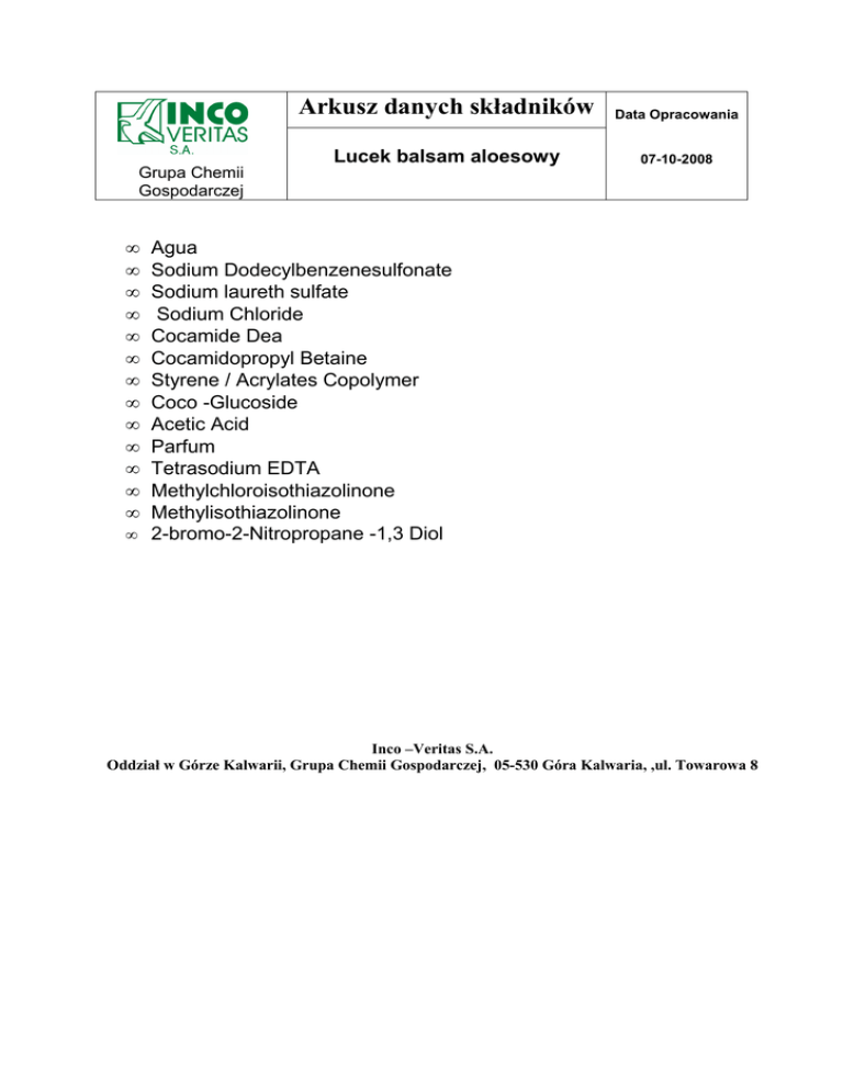 Arkusz danych składników Data Opracowania Lucek balsam aloesowy 07-10-2008 Grupa Chemii Gospodarczej • • • • • • • • • • • • • Agua Sodium Dodecylbenzenesulfonate Sodium laureth sulfate Sodium Chloride Cocamide Dea Cocamidopropyl Betaine Styrene / Acrylates Copolymer Coco -Glucoside Acetic Acid Parfum Tetrasodium EDTA Methylchloroisothiazolinone Methylisothiazolinone • 2-bromo-2-Nitropropane -1,3 Diol Inco –Veritas S.A. Oddział w Górze Kalwarii, Grupa Chemii Gospodarczej, 05-530 Góra Kalwaria, ,ul. Towarowa 8