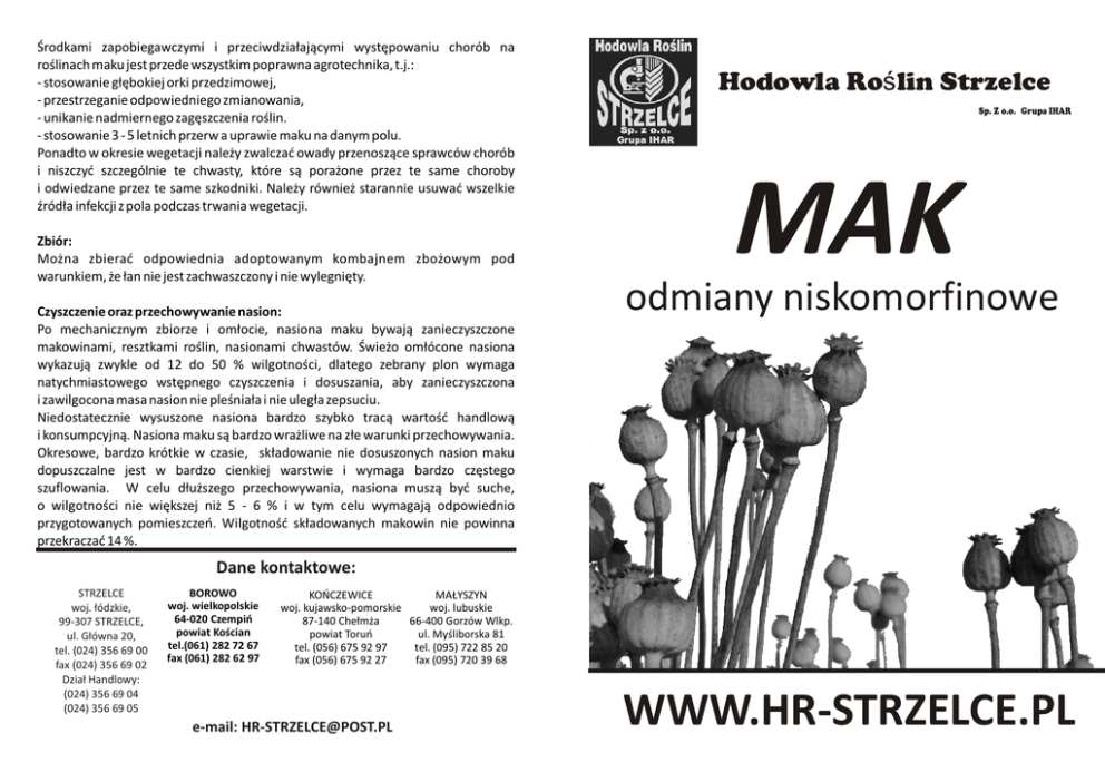 Œrodkami zapobiegawczymi i przeciwdzia³aj¹cymi wystêpowaniu chorób na roœlinach maku jest przede wszystkim poprawna agrotechnika, t.j.: - stosowanie g³êbokiej orki przedzimowej, - przestrzeganie odpowiedniego zmianowania, - unikanie nadmiernego zagêszczenia roœlin. - stosowanie 3 - 5 letnich przerw a uprawie maku na danym polu. Ponadto w okresie wegetacji nale¿y zwalczaæ owady przenosz¹ce sprawców chorób i niszczyæ szczególnie te chwasty, które s¹ pora¿one przez te same choroby i odwiedzane przez te same szkodniki. Nale¿y równie¿ starannie usuwaæ wszelkie Ÿród³a infekcji z pola podczas trwania wegetacji. Zbiór: Mo¿na zbieraæ odpowiednia adoptowanym kombajnem zbo¿owym pod warunkiem, ¿e ³an nie jest zachwaszczony i nie wylegniêty. Czyszczenie oraz przechowywanie nasion: Po mechanicznym zbiorze i om³ocie, nasiona maku bywaj¹ zanieczyszczone makowinami, resztkami roœlin, nasionami chwastów. Œwie¿o om³ócone nasiona wykazuj¹ zwykle od 12 do 50 % wilgotnoœci, dlatego zebrany plon wymaga natychmiastowego wstêpnego czyszczenia i dosuszania, aby zanieczyszczona i zawilgocona masa nasion nie pleœnia³a i nie uleg³a zepsuciu. Niedostatecznie wysuszone nasiona bardzo szybko trac¹ wartoœæ handlow¹ i konsumpcyjn¹. Nasiona maku s¹ bardzo wra¿liwe na z³e warunki przechowywania. Okresowe, bardzo krótkie w czasie, sk³adowanie nie dosuszonych nasion maku dopuszczalne jest w bardzo cienkiej warstwie i wymaga bardzo czêstego szuflowania. W celu d³u¿szego przechowywania, nasiona musz¹ byæ suche, o wilgotnoœci nie wiêkszej ni¿ 5 - 6 % i w tym celu wymagaj¹ odpowiednio przygotowanych pomieszczeñ. Wilgotnoœæ sk³adowanych makowin nie powinna przekraczaæ 14 %. Hodowla Roœlin Strzelce Sp. Z o.o. Grupa IHAR MAK odmiany niskomorfinowe Dane kontaktowe: STRZELCE woj. ³ódzkie, 99-307 STRZELCE, ul. G³ówna 20, tel. (024) 356 69 00 fax (024) 356 69 02 Dzia³ Handlowy: (024) 356 69 04 (024) 356 69 05 BOROWO woj. wielkopolskie 64-020 Czempiñ powiat Koœcian tel.(061) 282 72 67 fax (061) 282 62 97 KOÑCZEWICE MA£YSZYN woj. kujawsko-pomorskie woj. lubuskie 87-140 Che³m¿a 66-400 Gorzów Wlkp. powiat Toruñ ul. Myœliborska 81 tel. (056) 675 92 97 tel. (095) 722 85 20 fax (056) 675 92 27 fax (095) 720 39 68 e-mail: [email protected] WWW.HR-STRZELCE.PL Odmiany maku z Hodowli Roœlin Strzelce Sp. z o.o. Grupa IHAR AGAT - termin kwitnienia œredni - kwiaty ró¿owe z pe³nym jasnofioletowym oczkiem; brak wciêcia p³atka - nasiona barwy niebieskiej z szaroniebieskim odcieniem - roœlina niska, rozga³êziona - makówki d³ugie, o œredniej œrednicy, nie pêkaj¹ce - zawartoœæ morfiny w makowinach: 0,04 % - 0,06 % RUBIN - termin kwitnienia œredni - kwiaty ciemnoczerwone, z pe³nym œrednio intensywnym fioletowym oczkiem; brak wciêcia p³atka - nasiona barwy niebieskiej z szaroniebieskim odcieniem - roœlina niska, rozga³êziona - makówki d³ugie, o ma³ej œrednicy, nie pêkaj¹ce - zawartoœæ morfiny w makowinach: 0,05 % - 0,06 % MIESZKO - nagrodzony w 2000 r. Z³oty Medalem POLAGRA FARM - termin kwitnienia póŸny - kwiaty ciemnoró¿owe, z jasnofioletowym oczkiem, g³adkie - nasiona barwy niebieskiej z szaroniebieskim odcieniem - roœlina wysoka o ma³ej liczbie rozga³êzieñ - makówki œredniej wielkoœci, wyd³u¿one - zawartoœæ morfiny w makowinach: 0,04 % Produktami uzyskiwanymi w wyniku uprawy maku s¹ przede wszystkim ca³e nasiona u¿ywane zarówno w gospodarstwach domowych do wypieku ciast jak i w przemyœle spo¿ywczym. G³ównie w przemyœle piekarniczym i cukierniczym. Nasiona cenione s¹ równie¿ ze wzglêdu na wysoki poziom zawartoœci t³uszczu. Oprócz oleju jadalnego oraz technicznego wytwarzanego w procesie odolejenia powstaje œruta poekstrakcyjna, która jest bardzo dobr¹ pasz¹ treœciw¹ dla zwierz¹t, szczególnie krów dojnych. Zawiera oko³o 32 % strawnego bia³ka, oraz wyt³oki makowe makuchy zawieraj¹ce ponad 26 % strawnego bia³ka i ponad 11 % surowego t³uszczu. Wymagania glebowe: Mak ma doœæ du¿e wymagania glebowe. Pod uprawê maku odpowiednie s¹ gleby ¿yzne, próchniczne, œrednio ciê¿kie, o odczynie obojêtnym do s³abo zasadowego, znajduj¹ce siê bardzo dobrej kulturze. Najbardziej przydatne s¹ gleby kompleksów pszennego bardzo dobrego, pszennego dobrego i ¿ytniego bardzo dobrego. Przedplon: Najlepszymi przedplonami dla maku s¹ roœliny dobrze odchwaszczaj¹ce pole, do których przede wszystkim nale¿¹: burak cukrowy lub pastewny na oborniku, kukurydza, rzepak, roœliny str¹czkowe. Nie powinno siê uprawiaæ maku po ziemniakach, ze wzglêdu na wystêpuj¹ce po nich zaburzenia kie³kowania nasion i gorsze wschody. Mo¿liwymi przedplonami dla maku s¹ roœliny motylkowe i nie zachwaszczone zbo¿a, np. pszenica ozima. Nawo¿enie: Uprawê maku zaleca siê w drugim lub trzecim roku po zastosowaniu pe³nej dawki obornika. Nawo¿enie fosforowo - potasowe najlepiej jest zastosowaæ jesieni¹ pod orkê zimow¹, albo wiosn¹ pod kultywator lecz nie póŸniej ni¿ dwa tygodnie przed wysiewem maku w zale¿noœci od przedplonu od 30 - 80 kg P2O5 oraz od 60 - 100 K2O. Bardzo istotne jest dostarczenie odpowiedniej iloœci boru od 0,5 do 1 kg B/ha. Nawo¿enie azotem stosuje siê przedsiewnie pod agregat uprawowy w postaci nawozów amonowych w iloœci 20 - 40 kg N/ha oraz jednorazowo po przerywce roœlin maku w iloœci 40 - 50 kg N/ha w postaci nawozów saletrzanych lub dziel¹c je na dwie mniejsze czêœci i stosuj¹c 20 - 30 kg N/ha po przerywce i 20 kg N/ha bezpoœrednio przed zakryciem miêdzyrzêdzi. Siew: Termin siewu - pocz¹tek siewu zbó¿ jarych ( na glebach l¿ejszych nale¿y go siaæ tu¿ po owsie i pszenicy, na glebach zwiêŸlejszych i zimnych siew przeprowadziæ 10-14 dni póŸniej, w ogrzan¹ glebê). W celu uzyskania optymalnego zagêszczenia roœlin maku na polu wysiewa siê od 0,7 do 1,5 kg nasion na hektar co daje zagêszczenie od 25 do 2 45 roœlin na m . Zbyt ma³a liczba roœlin sprzyja