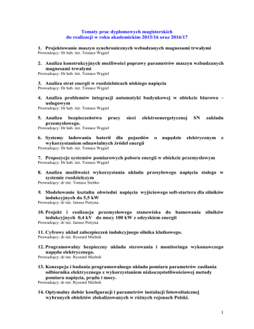 Tematy prac dyplomowych magisterskich do realizacji w roku akademickim 2015/16 oraz 2016/17 1. Projektowanie maszyn synchronicznych wzbudzanych magnesami trwałymi Prowadzący: Dr hab. inż. Tomasz Węgiel 2. Analiza konstrukcyjnych możliwości poprawy parametrów maszyn wzbudzanych magnesami trwałymi Prowadzący: Dr hab. inż. Tomasz Węgiel 3. Analiza strat energii w rozdzielnicach niskiego napięcia Prowadzący: Dr hab. inż. Tomasz Węgiel 4. Analiza problemów integracji automatyki budynkowej w obiekcie biurowo – usługowym Prowadzący: Dr hab. inż. Tomasz Węgiel 5. Analiza bezpieczeństwa przemysłowego. pracy sieci elektroenergetycznej SN zakładu Prowadzący: Dr hab. inż. Tomasz Węgiel 6. Systemy ładowania baterii dla pojazdów wykorzystaniem odnawialnych źródeł energii o napędzie elektrycznym z Prowadzący: Dr hab. inż. Tomasz Węgiel 7. Propozycje systemów pomiarowych poboru energii w obiekcie przemysłowym Prowadzący: Dr hab. inż. Tomasz Węgiel 8. Analiza możliwości wykorzystania układu przesyłowego napięcia stałego w systemie rozdzielczym Prowadzący: dr inż. Tomasz Sieńko 9. Modelowanie kształtu obwiedni napięcia wyjściowego soft-startera dla silników indukcyjnych do 5,5 kW Prowadzący: dr inż. Janusz Petryna. 10. Projekt i realizacja przemysłowego stanowiska do hamowania silników indukcyjnych 0,4 kV do mocy 100 kW z odzyskiem energii Prowadzący: dr inż. Janusz Petryna 11. Cyfrowy układ zabezpieczeń indukcyjnego silnika klatkowego. Prowadzący: dr inż. Ryszard Mielnik 12. Programowalny bezpieczny układu sterowania i monitoringu wykonawczego napędu elektrycznego. Prowadzący: dr inż. Ryszard Mielnik 13. Koncepcja i badania programowalnego układu pomiaru parametrów zasilania odbiornika elektrycznego z wykorzystaniem niskoczęstotliwościowej metody pomiaru napięcia, prądu i mocy. Prowadzący: dr inż. Ryszard Mielnik 14. Optymalny dobór konfiguracji i parametrów instalacji fotowoltaicznej wybranych obiektów zlokalizowanych w różnych rejonach Polski. 1 Prowadzący: dr inż. Ryszard Mielnik 15. Wpływ struktury i parametrów układu zasilania elektroenergetycznego budynku na wartości przepięć łączeniowych w wewnętrznych instalacjach elektrycznych . Prowadzący: dr inż. Marek Rejmer 16. Sieciowe filtry wejściowe urządzeń elektrycznych i elektronicznych a ochrona przeciwporażeniowa przy użyciu wyłączników różnicowoprądowych. Prowadzący: dr inż. Marek Rejmer 17. Opracowanie rozwiązania kompensacji mocy biernej w obiekcie użyteczności publicznej. Prowadzący: dr inż. Maciej Sułowicz 18. Monitoring i diagnostyka układów napędowych wagonów tramwajowych. Prowadzący: dr inż. Maciej Sułowicz 19. Analiza i optymalizacja kryteriów projektowania instalacji elektrycznych w obiektach przemysłowych z zagrożeniem pożaru i wybuchu Prowadzący: dr inż. Maciej Sułowicz 20. Systemy sygnalizacji pożaru w obiektach przemysłowych i budynkach ogólnego przeznaczenia Prowadzący: dr inż. Maciej Sułowicz 21. Bezinwazyjny pomiar prędkości obrotowej maszyn elektrycznych Prowadzący: dr inż. Maciej Sułowicz 22. Badania i pomiary diagnostyczne generatorów synchronicznych bloków energetycznych Prowadzący: dr inż. Maciej Sułowicz 23. Trójfazowy falownik napięcia ze wspomaganiem przełączania. Prowadzący: dr hab. inż. Witold Mazgaj 24. Układ sterownia trójfazowego falownika napięcia ze wspomaganiem przełączania elementów. Prowadzący: dr hab. inż. Witold Mazgaj 25. Układ sterownia 12-pulsowego prostownika tyrystorowego. Prowadzący: dr hab. inż. Witold Mazgaj 26. Program do wizualizacji pracy prostowników nawrotnych. Prowadzący: dr hab. inż. Witold Mazgaj 27. Program do wizualizacji pracy układów wspomagających przełączanie w układach energoelektronicznych. Prowadzący: dr hab. inż. Witold Mazgaj 28. Stanowisko laboratoryjne elektrotechnicznych. wybranych pomiarów magnetycznych blach Prowadzący: dr hab. inż. Witold Mazgaj 29. Modelowanie kształtu obwiedni napięcia wyjściowego soft-startera dla silników indukcyjnych do 5,5 kW 2 Prowadzący: dr inż. Janusz Petryna 30. Projekt i realizacja przemysłowego stanowiska do hamowania silników indukcyjnych 0,4 kV do mocy 100 kW z odzyskiem energii. Prowadzący: dr inż. Janusz Petryna 31. Projekt transformatora separującego dla odbiorników niesymetrycznych Prowadzący: dr hab. inż. Adam Warzecha – prof. PK 32. Porównanie stanów zwarciowych różnych typów generatorów synchronicznych Prowadzący: dr hab. inż. Adam Warzecha – prof. PK 33. Badania modelowe właściwości ruchowych wirującego układu UPS Prowadzący: dr hab. inż. Adam Warzecha – prof. PK 34. Badania porównawcze jakości napięcia generatorów synchronicznych z uzwojeniami różnego typu Prowadzący: dr hab. inż. Adam Warzecha – prof. PK 35. Programy do symulacji stanów nieustalonych w energetycznych liniach przesyłowych. Prowadzący: dr hab. inż. Adam Warzecha – prof. PK 36. Efekty wywoływane anizotropią magnetyczną rdzeni maszyn elektrycznych Prowadzący: dr hab. inż. Adam Warzecha – prof. PK 37. Modernizacja sieci zasilającej dużego zakładu pracy Prowadzący: dr inż. Jerzy Szczepanik 38. Wyprowadzenie energii z elektrowni węglowej po planowanej rozbudowie Prowadzący: dr inż. Jerzy Szczepanik 39. Systemy o wysokiej niezawodności zasilania Prowadzący: dr inż. Jerzy Szczepanik 40. Analiza sieci elektroenergetycznych niskich napięć nN wraz z procedurą optymalizacji położenia stacji Prowadzący: dr inż. Jerzy Szczepanik 41. Analiza skuteczności działania zabezpieczeń w obwodach rezerwowanych Prowadzący: dr inż. Jerzy Szczepanik 42. Analiza obwodów oświetleniowych ze szczególnym uwzględnieniem źródeł LED Prowadzący: dr inż. Jerzy Szczepanik 43. Analiza dynamiki sieci o układzie wielogeneratorowym generatorowym Prowadzący: dr inż. Jerzy Szczepanik 44. Lokalizacja oraz analiza pracy stacji 15 kV na terenach podmiejskich