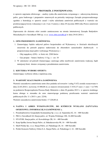 Nr sprawy : 08 / D / 2016 PROTOKÓŁ Z POSTĘPOWANIA w sprawie zapytania ofertowego – analizy rynku dla zamówienia związanego z sukcesywną dostawą paliw, gazu butlowego i preparatów smarowych na potrzeby tutejszego Zarządu przeprowadzonego zgodnie z Instrukcją w sprawie zasad i trybu udzielania zamówień publicznych o wartości nie przekraczającej kwoty wskazanej w art. 4 ust. 8 ustawy z dnia 29 stycznia 2004 roku Prawo zamówień publicznych. Zaproszenie do złożenia ofert zostało zamieszczone na stronie internetowej Zarządu Budynków Mieszkalnych w Suwałkach TBS sp. z o.o. www.zbm.suwalki.pl w dniu 29.03.2016 r. 1. OPIS PRZEDMIOTU ZAMÓWIENIA 1. Zamawiający będzie nabywał paliwo bezpośrednio od Wykonawcy w ilościach określonych stosownie do potrzeb poprzez tankowanie do zbiorników samochodów służbowych w proponowanej stacji paliw wybranego Wykonawcy : − Olej napędowy (ON) - w ilości ok. 2500 litrów − Gaz propan – butan ( butlowy 11 kg ) – szt. 10 2. W zależności od potrzeb Zamawiający zastrzega sobie możliwość zamówienia większej, bądź mniejszej ilości dostaw związanej z przedmiotem zamówienia. 2. KRYTERIA WYBORU OFERTY: Zamawiający wybierze ofertę z najniższą ceną. 3. WARTOŚĆ SZACUNKOWA ZAMÓWIENIA Wartość szacunkowa zamówienia netto (bez podatku od towarów i usług VAT) została oszacowana w dniu 22.03.2016 r. na kwotę 14 000,00 zł, co stanowi równowartość 3 3535,37 euro ( 1 euro = 4,1749) na podstawie Rozporządzenia Prezesa Rady Ministrów z dnia 28 grudnia 2015 r. w sprawie średniego kursu złotego w stosunku do euro stanowiącego podstawę przeliczania wartości zamówień publicznych (Dz. U z 2015 r. poz. 2254). Wartość szacunkowa zamówienia brutto: 17 220,00 zł. 4. NAZWA I ADRES WYKONAWCÓW, DO KTÓRYCH WYSŁANO ZAPYTANIA OFERTOWE ( INFORMACJĘ O ZAMÓWIENIU ). 1. Przedsiębiorstwo Gospodarki Komunalnej Sp. z o.o. ul. Sejneńska 82, 16 – 400 Suwałki 2. PKS w Suwałkach SA Stacja paliw, ul. Wojska Polskiego 100, 16-400 Suwałki 3. STATOIL Stacja paliw, ul. Kowalskiego 2B, 16 – 400 Suwałki 4. Karp Spółka Jawna Stacja Paliw, ul. Bakałarzewska 90, 16 – 400 Suwałki 5. Shell Polska Sp. z o.o. Stacja Paliw, ul. Pułaskiego 28, 16 – 400 Suwałki 6. Polski Koncern Naftowy Orlen S.A. Stacja Paliw, ul. Pułaskiego 2, 16 - 400 Suwałki 1 Nr sprawy : 08 / D / 2016 7. Oil Transfer Development Sp. z o. o., ul. Piękna 15 lok. 28, 00 – 539 Warszawa – adres do korespondencji : ul. Pułaskiego 107, 16 – 400 Suwałki. 5. OTRZYMANE OFERTY: W terminie do dnia 04.04.2016 r. do godz. 09:00 wpłynęły oferty jn.: 1. OFERTA NR 1 : PKS w Suwałkach Spółka Jawna, ul. Wojska Polskiego 100, 16-400 Suwałki 1. Cena paliwa 1 l – Olej napędowy z dnia zapytania 3,86 zł ( słownie złotych : trzy 86/100.- ). W tym podatek VAT 23%. Do oferowanej ceny paliwa za 1l - 0,06 zł upustu w ciągu całego okresu trwania umowy. Cena paliwa 1 l z zastosowanym upustem 3,80 zł ( słownie złotych : trzy 80/100.- ). W tym podatek VAT 23%. 3. Dostawa gazu propan – butan szt. 1 ( butlowy 11 kg ) za kwotę brutto : 47,00 zł Słownie złotych : czterdzieści siedem.W tym podatek VAT 23%. 4. Dostawa preparatów smarowych zgodnie z formularzem cenowym za kwotę brutto : 583,47 zł Termin realizacji : od dnia podpisania umowy do dnia 31.03.2017 roku. 2. OFERTA NR 2 : Przedsiębiorstwo Transportowo – Sprzętowe Budownictwa ”TRANSBUDEŁK” Sp. z o.o. Oddział Suwałki, ul. Północna 27, 16-400 Suwałki. 1. Cena paliwa 1 l – Olej napędowy z dnia zapytania 3,91 zł ( słownie złotych : trzy 91/100.- ). W tym podatek VAT 23%. Do oferowanej ceny paliwa za 1l - 0,07 zł upustu w ciągu całego okresu trwania umowy. Cena paliwa 1 l z zastosowanym upustem 3,84 zł ( słownie złotych : trzy 84/100.- ). W tym podatek VAT 23%. 3. Dostawa gazu propan – butan szt. 1 ( butlowy 11 kg ) za kwotę brutto : 48,00 zł Słownie złotych : czterdzieści osiem.W tym podatek VAT 23%. 4. Dostawa preparatów smarowych zgodnie z formularzem cenowym za kwotę brutto : 781,05 zł Termin realizacji : od dnia podpisania umowy do dnia 31.03.2017 roku. 6. OCENA OFERT I WYBÓR NAJKORZYSTNIEJSZEJ OFERTY. OFERTA Nr 1 : PKS w Suwałkach Spółka Jawna, ul. Wojska Polskiego 100, 16-400 Suwałki. Termin realizacji : od dnia podpisania do dnia 31.03.2017 r. Powyższa oferta obejmuje pełny zakres dostaw określony przez Zamawiającego. 2 Nr sprawy : 08 / D / 2016 W związku z powyższym komisja wnioskuje o zawarcie umowy z Wykonawcą jak na warunkach przedstawionych w ofercie. Komisja powołana Zarządzeniem Prezesa Zarządu Budynków Mieszkalnych w Suwałkach TBS sp. z o.o. Nr 43/2016 z dnia 01.04.2016 r. 1. Jacek Koniaszewski 2. Michał Kopyra 3. Henryk Śliwiński Akceptuję : KIEROWNIK DZIAŁU INWESTYCJI I REMONTÓW Bożena Hrynaszkiewicz /-/ podpis nieczytelny Zatwierdzam: DYREKTOR ds. EKSPLOATACJI Wiesław Lange /-/ podpis nieczytelny Suwałki dnia 05.04.2016 r. 3