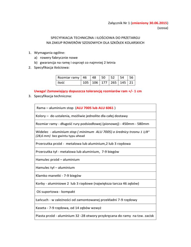 Załącznik Nr 1 (zmieniony 30.06.2015) (szosa) SPECYFIKACJA TECHNICZNA i ILOŚCIOWA DO PRZETARGU NA ZAKUP ROWERÓW SZOSOWYCH DLA SZKÓŁEK KOLARSKICH 1. Wymagania ogólne: a) rowery fabrycznie nowe b) gwarancja na ramę i osprzęt co najmniej 2 letnia 2. Specyfikacja ilościowa: Rozmiar ramy 46 48 50 52 54 56 ilość 105 106 177 265 145 21 Uwaga! Zamawiający dopuszcza tolerancję rozmiarów ram +/- 1 cm 3. Specyfikacja techniczna: Rama – aluminium stop (ALU 7005 lub ALU 6061 ) Kolory – do ustalenia, możliwie jednolite dla całej dostawy Rozmiar ramy - długość rury podsiodłowej (pionowej) - 450mm - 580mm Widelec - aluminium stop ( minimum ALU 7005) o średnicy trzonu 1 1/8" (28,6 mm) bez gwintu typu ahead Przerzutka przód - metalowa lub aluminium,2 lub 3 rzędowa Przerzutka tył - metalowa lub aluminium, 7-9 biegów Hamulec przód – aluminium Hamulec tył – aluminium Klamko manetki - 7-9 biegów Korby - aluminiowe 2 lub 3 rzędowe (największa tarcza 46 zębów) Oś suportowa - kompakt Łańcuch - w zależności od zamontowanej przekładni 7-9 rzędowy Kaseta - 7-9 rzędowa, od 14 zębów wzwyż Piasta przód - aluminium 32 -28 otwory przykręcana do ramy na tzw. zacisk Piasta tył - aluminium bęben na kasetę 32 - 28 otwory przykręcana do ramy na tzw. zacisk Opony – zwijane lub drutowe (od 622 x25 do 622 x 27) Obręcze - rozmiar 622 minimum dwu komorowe „stożek” Szprychy - niklowane Kierownica - aluminiowa kolarska typu baranek średnica 31.8 mm lub 25,4 , szerokość od 38cm do 42 cm (w zależności od wielkości ramy) Wspornik kierownicy – aluminium systemu ahead 28,6 mm długość od 60mm do 110 mm średnica do kierownicy 31,8mm lub 25,4mm Wspornik siodła aluminium – grubość odpowiednia do ramy Stery - łożyska kierownicy aluminiowe lub stalowe Siodło kolor czarny długość 230-300 mm szerokość 120-135mm Owijka kierownicy - kolor czarny (obligatoryjnie) Pedały zatrzaskowe w komplecie z blokami