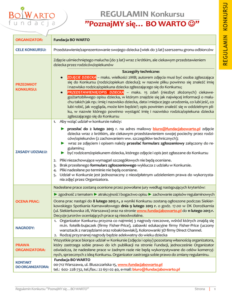REGULAMIN KONKURSU REGULAMIN Konkursu ”PoznajMY się… BO WARTO ” ORGANIZATOR: Fundacja BO WARTO CELE KONKURSU: Przedstawienie/zaprezentowanie swojego dziecka (wiek do 3 lat) szerszemu gronu odbiorców Zdjęcie uśmiechniętego malucha (do 3 lat) wraz z krótkim, ale ciekawym przedstawieniem dziecka przez rodziców/opiekunów PRZEDMIOT KONKURSU: Szczegóły techniczne: ZDJĘCIE DZIECKA – maks. wielkości 2MB; autorem zdjęcia musi być osoba zgłaszająca się do Konkursu (rodzic/opiekun dziecka); w nazwie pliku powinno się znaleźć imię i nazwisko rodzica/opiekuna dziecka zgłaszającego się do Konkursu; PRZEDSTAWIENIE/OPIS DZIECKA – maks. 15 zdań (niezbyt złożonych) ciekawego/żartobliwego opisu dziecka, w którym znajdzie się jak najwięcej informacji o maluchu takich jak np.: imię i nazwisko dziecka, data i miejsce jego urodzenia, co lubi jeść, co lubi robić, jak wygląda, może kim będzie?; opis powinien znaleźć się w oddzielnym pliku, w nazwie którego powinno wystąpić imię i nazwisko rodzica/opiekuna dziecka zgłaszającego się do Konkursu 1. Aby wziąć udział w konkursie należy: ► przesłać do 2 lutego 2013 r. na adres mailowy [email protected] zdjęcie dziecka wraz z krótkim, ale ciekawym przedstawieniem swojej pociechy przez rodziców/opiekunów (z zachowaniem ww. szczegółów technicznych); ► wraz ze zdjęciem i opisem należy przesłać formularz zgłoszeniowy załączony do regulaminu; ► być rodzicem/opiekunem dziecka, którego zdjęcie i opis jest zgłaszane do Konkursu ZASADY UDZIAŁU: 2. 3. 4. 5. Pliki niezachowujące wymagań szczegółowych nie będą oceniane. Brak przesłanego formularz zgłoszeniowego wyklucza z udziału w Konkursie. Pliki nadesłane po terminie nie będą oceniane. Udział w Konkursie jest jednoznaczny z nieodpłatnym udzieleniem prawa do wykorzystania zdjęć przez Organizatora. Nadesłane prace zostaną ocenione przez powołane jury według następujących kryteriów: ► zgodność z tematem ► atrakcyjność i bogactwo opisu ► zachowanie zapisów regulaminowych OCENA PRAC: NAGRODY: PRAWA ORGANIZATORA: KONTAKT DO ORGANIZATORA: Ocena prac nastąpi do 8 lutego 2013 r., a wyniki Konkursu zostaną ogłoszone podczas Siekierkowskiego Spotkania Karnawałowego dnia 9 lutego 2013 r. o godz. 17.00 w DK Dorożkarnia (ul. Siekierkowska 28, Warszawa) oraz na stronie www.fundacjabowarto.pl do 11 lutego 2013 r. Decyzje jurorów oceniających prace są nieodwołalne. 1. Organizator Konkursu przyzna co najmniej 3 nagrody rzeczowe, wśród których znajdą się m.in. fotelik-bujaczek (firmy Fisher-Price), zabawki edukacyjne firmy Fisher-Price (uczony warsztacik z narzędziami oraz robaki-bawiaki), Kolorowanki 3D firmy Direct Channel. 2. Rodzaj przyznanej nagrody będzie adekwatny do wieku dziecka Wszystkie prace biorące udział w Konkursie (zdjęcia i opisy) pozostaną własnością organizatora, który zastrzega sobie prawo do ich publikacji na stronie Fundacji, jednocześnie Organizator oświadcza, że nadesłane prace w żadnym razie nie będą wykorzystywane do celów komercyjnych, sprzecznych z ideą Konkursu. Organizator zastrzega sobie prawo do zmiany regulaminu. Fundacja BO WARTO 00-712 Warszawa, ul. Bluszczańska 15, www.fundacjabowarto.pl tel.: 602- 228-732, tel./fax.: 22 651 02 40, e-mail: [email protected] Regulamin Konkursu ”PoznajMY się…BO WARTO” Strona | 1
