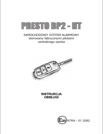 PRESTO BP2 - HT SAMOCHODOWY SYSTEM ALARMOWY sterowany fabrycznymi pilotami centralnego zamka INSTRUKCJA OBS£UGI E20 97RA - 01 2082 INSTRUKCJA OBS£UGI PRESTO BP2 - HT W³¹czenie autoalarmu w stan czuwania Zamkniêcie systemu centralnego zamka przy pomocy oryginalnego pilota bêdzie powodowa³o automatyczne w³¹czenie systemu alarmowego w stan czuwania. Wy³¹czenie autoalarmu ze stanu czuwania Otwarcie systemu centralnego zamka przy pomocy oryginalnego pilota bêdzie powodowa³o automatyczne wy³¹czenie systemu alarmowego ze stanu czuwania. Sygnalizacja optyczna w³¹czenia i wy³¹czenia autoalarmu W³¹czenie i wy³¹czenie systemu alarmowego mo¿e byæ sygnalizowane optycznie przy pomocy œwiate³ kierunkowskazów ( funkcja 2 programowana ): w³¹czenie - 1 migniêcie œwiate³ kierunkowskazów wy³¹czenie - 2 migniêcia œwiate³ kierunkowskazów W przypadku gdy samochód posiada w³asn¹ sygnalizacjê zamkniêcia i otwarcia centralnego zamka, zaleca siê wy³¹czenie sygnalizacji optycznej z autoalarmu. Stan neutralny Jest to stan gotowoœci do w³¹czenia systemu alarmowego w stan czuwania, który wystêpuje po wy³¹czeniu zap³onu, wy³¹czeniu stanu samoczynnego uzbrajania oraz po wy³¹czeniu stanu serwisowego. Stan uzbrajania linii alarmowych Po w³¹czeniu alarmu dioda LED zacznie migaæ szybkim cyklem przez 10 sek. sygnalizuj¹c uzbrajanie wszystkich linii alarmowych. W tym czasie linie autoalarmu s¹ jeszcze nie aktywne. Zakoñczenie uzbrajania i przejœcie do stanu czuwania zasygnalizowane jest dodatkowo 1 migniêciem œwiate³ kierunkowskazów. Stan czuwania Po 10 sek. od momentu w³¹czenia alarmu dioda LED zacznie migaæ cyklem 1 raz i przerwa sygnalizuj¹c stan czuwania oraz gotowoœæ wszystkich linii do pracy. Stan samouzbrojenia Po wy³¹czeniu autoalarmu ze stanu czuwania dioda LED zacznie migaæ bardzo szybkim cyklem sygnalizuj¹c stan samoczynnego uzbrojenia. Czas trwania samoczynnego uzbrojenia sk³ada siê z dwóch cykli : cykl 1 programowany - (0 - 35) sek. cykl 2 sta³y - 10 sek. Otwarcie klap, naruszenie linii czujnika dodatkowego, b¹dŸ w³¹czenie stacyjki w pozycje zap³onu w czasie trwania obu cykli spowoduje zgaœniêcie diody LED oraz wy³¹czenie samouzbrojenia, otwarcie drzwi wy³¹czy samoczynne uzbrojenie tylko podczas 10 sek. cyklu sta³ego. W przypadku kiedy w trakcie samoczynnego uzbrojenia nie zaistnieje ¿adna z wy¿ej wymienionych okolicznoœci system alarmowy samoczynnie za³¹czy siê w stan czuwania. str. 2 INSTRUKCJA OBS£UGI PRESTO BP2 - HT Stan alarmowania Aktywacja w stanie czuwania czujników drzwi, klap, stacyjki lub czujnika dodatkowego powoduje wyzwolenie 30 sek. stanu alarmowania oraz uniemo¿liwia uruchomienie samochodu. Stan ten mo¿e byæ przerwany w dowolnym momencie przez otwarcie centralnego zamka przy pomocy oryginalnego pilota. Stan programowania Jest to stan sygnalizowany pulsowaniem diody LED umo¿liwiaj¹cy programowanie wszystkich funkcji systemu alarmowego. Stan blokady uruchomienia silnika Jest to stan uniemo¿liwiaj¹cy uruchomienie silnika wystêpuj¹cy podczas: w stanu czuwania w stanu alarmowania w zadzia³ania funkcji 10 - antynapadowej w zadzia³ania funkcji 11 - antyporwaniowej w zadzia³ania funkcji 12 - samouzbrojenia blokady zap³onu W przypadku aktywnej funkcji 10, 11 lub 12 na czas w³¹czenia zap³onu w stanie blokady rozruchu, uruchomiona zostanie sygnalizacja dŸwiêkowa w postaci krótkich sygna³ów syreny trwaj¹cych nie d³u¿ej ni¿ 10 sek. Stan serwisowy Stan ten s³u¿y do zablokowania systemu alarmowego do celów serwisowych pojazdu lub do awaryjnego wy³¹czenia stanu czuwania b¹dŸ alarmowania. Wejœcie w stan serwisowy nastêpuje po wprowadzeniu kodu PIN u¿ytkownika. Wejœcie w stan serwisowy przy pomocy kodu PIN u¿ytkownika Fabrycznie PIN u¿ytkownika jest liczb¹ 22, któr¹ w trybie programowania mo¿emy zmieniæ na inn¹ liczbê dwucyfrow¹. w w³¹czyæ zap³on w nacisn¹æ przycisk serwisowy i puœciæ go po, tylu migniêciach diody LED ile wynosi 1 cyfra kodu w ponownie nacisn¹æ przycisk serwisowy i puœciæ go po, tylu migniêciach diody LED ile wynosi 2 cyfra kodu ------------------------------------------------------------------------------------------------------------- wybranie prawid³owego PIN u¿ytkownika i wejœcie w stan serwisowy zasygnalizowane jest 1 krótkim sygna³em syreny oraz zapaleniem siê na sta³e diody LED - wybranie z³ego PIN u¿ytkownika zasygnalizowane jest 5 migniêciami diody LED Wyjœcie ze stanu serwisowego Wyjœcie z tego stanu odbywa siê przez ponowne w³¹czenie zap³onu i przyciœniêcie przycisku serwisowego na czas 5 sek. co sygnalizowane jest zgaœniêciem diody LED. Po wyjœciu ze stanu serwisowego alarm przechodzi do stanu neutralnego. str. 3 INSTRUKCJA OBS£UGI PRESTO BP2 - HT Przycisk serwisowy Przycisk ten instalator systemu powinien umieœciæ w miejscu niewidocznym, a jednoczeœnie dostêpnym dla w³aœciciela pojazdu. S³u¿y on do nastêpuj¹cych celów: w w w w w w wprowadzenia systemu w stan serwisowy wprowadzenia systemu w stan programowania programowania funkcji alarmu potwierdzania przy wprogramowanej funkcji antynapadowej potwierdzania przy wprogramowanej funkcji antyporwaniowej wy³¹czenia linii czujnika dodatkowego Automatyczna kontrola linii czujników alarmu Alarm posiada funkcjê, która eliminuje liniê powoduj¹c¹ niepotrzebne, samoczynne wzbudzenia. Je¿eli w trakcie cyklu czuwania którakolwiek z linii zostanie 5-krotnie uaktywniona to zostanie ona potraktowana jako wadliwa i system przestanie reagowaæ na dochodz¹ce z niej sygna³y. Pozosta³e linie systemu w danym cyklu czuwania bêd¹ dzia³aæ bez zmian. Czujnik otwarcia drzwi Czujnik wykrywa otwarcie drzwi w stanie czuwania i uaktywnia stan alarmowania. Rolê czujników pe³ni¹ w³¹czniki krañcowe zainstalowane w drzwiach. W przypadku trudnoœci w pod³¹czeniu siê do w³¹czników drzwiowych istnieje mo¿liwoœæ pod³¹czenia siê do lampki oœwiet