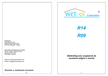 R Generator Producent: EGM Benisch e.U. Rudolf-Diesel-Strasse 26 2700 Wr. Neustadt Austria Generalny przedstawiciel na Polskę Wet ex Polska Robert Fremel Abt Karl Gasse 23/3 1180 Wien Austria Elektrofizyczne urządzenie do usuwania wilgoci z murów Internet: www.tanieosuszanie.com E-Mail: [email protected] Koniec z mokrymi murami -8- -1- Oświadczenie o zgodności Importer: Wet ex Polska Robert Fremel R Generator Abt Karl Gasse 23/3, 1180 Wien, Austria Rodzaj produktu: Elektrofizyczne urządzenie do usuwania wilgoci z murów Nazwa produktu: Typ: R09 R14 Adres: Wet-ex generator R09 / R14 Oświadcza że przetestowane urządzenia spełniają wymagania Europejskich przepisów 2006/95/EG dotyczących bezpieczeństwa produktów elektrycznych i przepisów 2004/108/EG o nieszkodliwości elektromagnetycznej i spełniaja Normy zawarte w poniższych dokumentach Dokument: D Test report EMV-E 57/07 vom 14. 08. 2007 Seibersdorf Labor GmbH EMC-Test Laboratory Standarty: C E Emission EN 61000-6-3:2001 Electromagnetic compatibility (EMC) Emission standard for residential, commercial and light-industrial environments Immunity EN 61000-6-1:2001 Electromagnetic compatibility (EMC) Immunity for for residential, commercial and light-industrial enviroments Safety A F B EN 60335-1 : 2002 Electric safety Safety for domestic or similar use Wystawiający zaswiadczenie: Robert Frmel Miejscowość, data: Wieden 01/06/2010 Prawnie zobowiązujacy podpis: -2- -7- :_ _ _ _ _ _ _ _ _ instalacja wet ex Generator R14 + R14 Gratulacje, zdecydowali sie Państwo na innowacyjną technike Generatora Wet ex. Dziękujemy............................................. ................................................................. Opis urządzenia: 672m² A - Licznik dni B - Lampka kontrolna LED C - Gniazdko D - Kabel E - Dane techniczne F – Pląba gwarancyjna Wskazówki: Przed podłączeniem generatora Wet ex należy upewnic sie, czy napiecie w sieci miesci sie w granicach 220 – 240 Wolt........................ Przed wprowadzeniem wtyczki do gniazdka, nalezy zwrócic uwage na to, czy gniazdko jest uziemione................................... Generator wet ex chroniony jest przed kurzem i woda. Manipulacja lub uszkodzenie pieczeci gwarancyjnej prowadzi do straty praw do gwarancji i naprawy............................................. 5m instalacja wet ex Generator R14 + R09 10m 9m Gwarancja: 385m² -6- Nie zuzywajacy sie, nie wymagajacy serwisowania i precyzyjnie wykonany generator wet ex umozliwia:...................................... Wet ex zapewnia 3 letnia gwarancje od daty zakupu. Gwarancja obejmuje defekty materialu i bledne wykonanie urzadzenia. W przypadku uszkodzenia urzadzenie, zostaje ono wymieniane na nowe.................................................................. Przesylki za pobraniem nie beda przyjmowane.,,,,,,,,,,,.... -3- Generator Wet ex jest nowej generacji bezprzewodowym elektrofizycznym urządzeniem usuwającym wilgoć z murów................................ Generator Wet ex wysyla dokładnie dopasowane, nisko frekwencyjne impulsy, przez które zostaje przerwany elektromagnetyczny transport cieczy w góre, wilgoć opada i ulatnia sie bokami w sposób naturalny. Aby zapewnić utrzymywanie suchego stanu murów po zakończeniu procesu osuszania, należy pozostawic działajacy Generator na jego miejscu. 1- 2- 3 montaż generatora wet ex 1. Ustal zabudowaną powierzchnię objektu. 2. Wybierz miejsce Generatora Wet ex, które może znajdować się zarówno w piwnicy, jak i na poddaszu. Należy zwrócić uwagę, aby zasięg działania generatora wet ex obejmował wszystkie mury zewnętrzne budynku. Dane techniczne R14: Wymiary: 245 x 175 x 50 mm Zużycie prądu w ciągu roku 10 KWh Napięcie prądu: 230V AC Moc nadawania: max 1.5 mW Napięcie pracy: 24V Serwisowanie: żadne Zasięg: promień działania 14 metrów Kontrolka dzialania LED (Impuls świetlny co 7 sek.) Licznik dni LCD Obudowa chroniąca urządzenie przed kurzem i wodą Przyklady: wet ex generator R09 wet-ex generator R14 Dane techniczne R09 Wymiary: 245 x 175 x 50 mm Zużycie prądu w ciągu roku 7 KWh Napięcie prądu: 230V AC Moc nadawania: max 1.3 mW Napięcie pracy: 18V Serwisowanie: żadne Zasięg: promień działania 9 metrów Kontrolka dzialania LED (Impuls świetlny co 7 sek.) Licznik dni LCD Obudowa chroniąca urządzenie przed kurzem i wodą Zastosowanie: wyłącznie wewnątrz pomieszczeń W przedziale temperatur od -5 do +40 stopni celsjusza................................ Wilgotność: do 90% nie skraplającej się wilgotności powietrza. ....... -4- 3. Ustaw Generator Wet ex na wybranym przez siebie miejscu i podłącz do prądu. Położenie Generatora Wet ex powinno znajdowac sie wyżej najwyższego punktu występowania wilgoci. Rozprzestrzeniająca się wilgoć zostaje zatrzymana już od chwili uruchomienia urządzenia i rozpoczyna się naturalny proces osuszania. Poprzez kombinacje kilku generatorów można osuszać wszelkie budynki niezależnie od ich powierzchni i zarysu. -5-