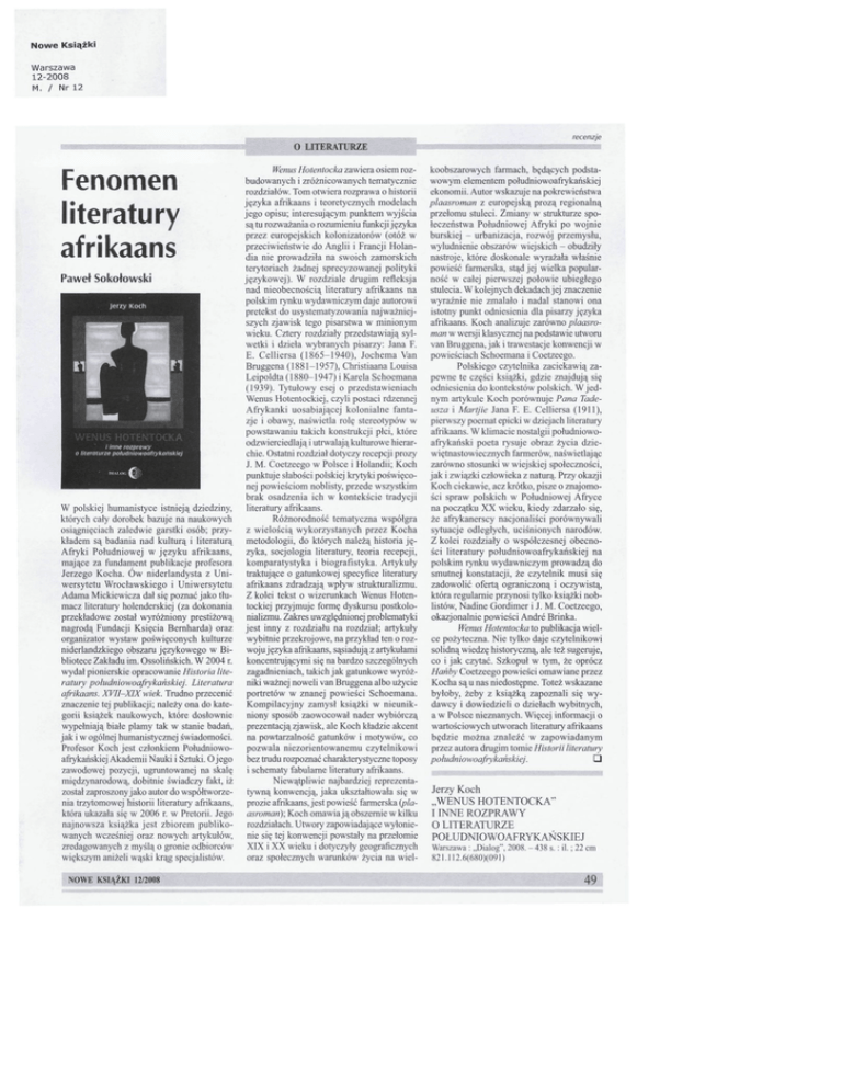 Nowe Książki Warszawa 12-2008 M. / Nr 12 O LITERATURZE Fenomen literatury afrikaans Paweł Sokołowski W polskiej humanistyce istnieją dziedziny, których cały dorobek bazuje na naukowych osiągnięciach zaledwie garstki osób; przykładem są badania nad kulturą i literaturą Afryki Południowej w języku afrikaans, mające za fundament publikacje profesora Jerzego Kocha. Ów niderlandysta z Uniwersytetu Wrocławskiego i Uniwersytetu Adama Mickiewicza dał się poznać jako tłumacz literatury holenderskiej (za dokonania przekładowe został wyróżniony prestiżową nagrodą Fundacji Księcia Bernharda) oraz organizator wystaw poświęconych kulturze niderlandzkiego obszaru językowego w Bibliotece Zakładu im. Ossolińskich. W 2004 r. wydał pionierskie opracowanie Historia literatury południowoafrykańskiej. Literatura afrikaans. XVII-XIX wiek. Trudno przecenić znaczenie tej publikacji; należy ona do kategorii książek naukowych, które dosłownie wypełniają białe plamy tak w stanie badań, jak i w ogólnej humanistycznej świadomości. Profesor Koch jest członkiem Południowoafrykańskiej Akademii Nauki i Sztuki. O jego zawodowej pozycji, ugruntowanej na skalę międzynarodową, dobitnie świadczy fakt, iż został zaproszony jako autor do współtworzenia trzytomowej historii literatury afrikaans, która ukazała się w 2006 r. w Pretorii. Jego najnowsza książka jest zbiorem publikowanych wcześniej oraz nowych artykułów, zredagowanych z myślą o gronie odbiorców większym aniżeli wąski krąg specjalistów. NOWE KSIĄŻKI 12/2008 Wenus Hotentocka zawiera osiem rozbudowanych i zróżnicowanych tematycznie rozdziałów. Tom otwiera rozprawa o historii języka afrikaans i teoretycznych modelach jego opisu; interesującym punktem wyjścia są tu rozważania o rozumieniu funkcji języka przez europejskich kolonizatorów (otóż w przeciwieństwie do Anglii i Francji Holandia nie prowadziła na swoich zamorskich terytoriach żadnej sprecyzowanej polityki językowej). W rozdziale drugim refleksja nad nieobecnością literatury afrikaans na polskim rynku wydawniczym daje autorowi pretekst do usystematyzowania najważniejszych zjawisk tego pisarstwa w minionym wieku. Cztery rozdziały przedstawiają sylwetki i dzieła wybranych pisarzy: Jana F. E. Celliersa (1865-1940), Jochema Van Bruggena (1881-1957), Christiaana Louisa Leipoldta (1880-1947) i Karela Schoemana (1939). Tytułowy esej o przedstawieniach Wenus Hotentockiej, czyli postaci rdzennej Afrykanki uosabiającej kolonialne fantazje i obawy, naświetla rolę stereotypów w powstawaniu takich konstrukcji płci, które odzwierciedlają i utrwalają kulturowe hierarchie. Ostatni rozdział dotyczy recepcji prozy J. M. Coetzeego w Polsce i Holandii; Koch punktuje słabości polskiej krytyki poświęconej powieściom noblisty, przede wszystkim brak osadzenia ich w kontekście tradycji literatury afrikaans. Różnorodność tematyczna współgra z wielością wykorzystanych przez Kocha metodologii, do których należą historia języka, socjologia literatury, teoria recepcji, komparatystyka i biografistyka. Artykuły traktujące o gatunkowej specyfice literatury afrikaans zdradzają wpływ strukturalizmu. Z kolei tekst o wizerunkach Wenus Hotentockiej przyjmuje formę dyskursu postkolonializmu. Zakres uwzględnionej problematyki jest inny z rozdziału na rozdział; artykuły wybitnie przekrojowe, na przykład ten o rozwojujęzyka afrikaans, sąsiadują z artykułami koncentrującymi się na bardzo szczególnych zagadnieniach, takich jak gatunkowe wyróżniki ważnej noweli van Bruggena albo użycie portretów w znanej powieści Schoemana. Kompilacyjny zamysł książki w nieunikniony sposób zaowocował nader wybiórczą prezentacją zjawisk, ale Koch kładzie akcent na powtarzalność gatunków i motywów, co pozwala niezorientowanemu czytelnikowi bez trudu rozpoznać charakterystyczne toposy i schematy fabularne literatury afrikaans. Niewątpliwie najbardziej reprezentatywną konwencją, jaka ukształtowała się w prozie afrikaans, jest powieść farmerska (plaasmman); Koch omawiają obszernie w kilku rozdziałach. Utwory zapowiadające wyłonienie się tej konwencji powstały na przełomie XIX i XX wieku i dotyczyły geograficznych oraz społecznych warunków życia na wiel- recenzje koobszarowych farmach, będących podstawowym elementem południowoafrykańskiej ekonomii. Autor wskazuje na pokrewieństwa plaasroman z europejską prozą regionalną przełomu stuleci. Zmiany w strukturze społeczeństwa Południowej Afryki po wojnie burskiej - urbanizacja, rozwój przemysłu, wyludnienie obszarów wiejskich - obudziły nastroje, które doskonale wyrażała właśnie powieść farmerska, stąd jej wielka popularność w całej pierwszej połowie ubiegłego stulecia. W kolejnych dekadach jej znaczenie wyraźnie nie zmalało i nadal stanowi ona istotny punkt odniesienia dla pisarzy języka afrikaans. Koch analizuje zarówno plaasroman w wersji klasycznej na podstawie utworu van Bruggena, jak i trawestacje konwencji w powieściach Schoemana i Coetzeego. Polskiego czytelnika zaciekawią zapewne te części książki, gdzie znajdują się odniesienia do kontekstów polskich. W jednym artykule Koch porównuje Pana Tadeusza i Martjie Jana F. E. Celliersa (1911), pierwszy poemat epicki w dziejach literatury afrikaans. W klimacie nostalgii południowoafrykański poeta rysuje obraz życia dziewiętnastowiecznych farmerów, naświetlając zarówno stosunki w wiejskiej społeczności, jak i związki człowieka z naturą. Przy okazji Koch ciekawie, acz krótko, pisze o znajomości spraw polskich w Południowej Afryce na początku XX wieku, kiedy zdarzało się, że afrykanerscy nacjonaliści porównywali sytuacje odległych, uciśnionych narodów. Z kolei rozdziały o współczesnej obecności literatury południowoafrykańskiej na polskim rynku wydawniczym prowadzą do smutnej konstatacji, że czytelnik musi się zadowolić ofert