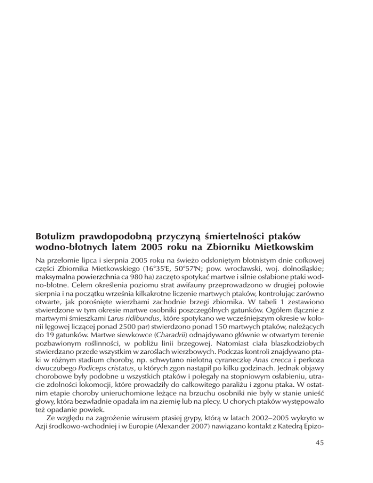 Botulizm prawdopodobną przyczyną śmiertelności ptaków wodno-błotnych latem 2005 roku na Zbiorniku Mietkowskim Na przełomie lipca i sierpnia 2005 roku na świeżo odsłoniętym błotnistym dnie cofkowej części Zbiornika Mietkowskiego (16°35'E, 50°57'N; pow. wrocławski, woj. dolnośląskie; maksymalna powierzchnia ca 980 ha) zaczęto spotykać martwe i silnie osłabione ptaki wodno-błotne. Celem określenia poziomu strat awifauny przeprowadzono w drugiej połowie sierpnia i na początku września kilkakrotne liczenie martwych ptaków, kontrolując zarówno otwarte, jak porośnięte wierzbami zachodnie brzegi zbiornika. W tabeli 1 zestawiono stwierdzone w tym okresie martwe osobniki poszczególnych gatunków. Ogółem (łącznie z martwymi śmieszkami Larus ridibundus, które spotykano we wcześniejszym okresie w kolonii lęgowej liczącej ponad 2500 par) stwierdzono ponad 150 martwych ptaków, należących do 19 gatunków. Martwe siewkowce (Charadrii) odnajdywano głównie w otwartym terenie pozbawionym roślinności, w pobliżu linii brzegowej. Natomiast ciała blaszkodziobych stwierdzano przede wszystkim w zaroślach wierzbowych. Podczas kontroli znajdywano ptaki w różnym stadium choroby, np. schwytano nielotną cyraneczkę Anas crecca i perkoza dwuczubego Podiceps cristatus, u których zgon nastąpił po kilku godzinach. Jednak objawy chorobowe były podobne u wszystkich ptaków i polegały na stopniowym osłabieniu, utracie zdolności lokomocji, które prowadziły do całkowitego paraliżu i zgonu ptaka. W ostatnim etapie choroby unieruchomione leżące na brzuchu osobniki nie były w stanie unieść głowy, która bezwładnie opadała im na ziemię lub na plecy. U chorych ptaków występowało też opadanie powiek. Ze względu na zagrożenie wirusem ptasiej grypy, którą w latach 2002–2005 wykryto w Azji środkowo-wchodniej i w Europie (Alexander 2007) nawiązano kontakt z Katedrą Epizo45 tiologii i Chorób Ptaków Wydziału Medycyny Weterynaryjnej we Wrocławiu i Powiatowym Lekarzem Weterynarii celem zdiagnozowania przyczyny choroby ptaków. Część martwych osobników (co najmniej jednego z przedstawicieli poszczególnych rzędów, patrz tab. 1) przekazano do pierwszej wymienionej placówki, gdzie pobrano wycinki wątroby. Następnie próbki te wysłano do Państwowego Instytutu Weterynaryjnego w Puławach, gdzie przeprowadzono testy na obecność wirusa ptasiej grypy, którą w ostateczności wykluczono jako przyczynę śmiertelności. Pomimo, iż nie przeprowadzono odpowiednich testów mikrobiologicznych i toksykologicznych, objawy kliniczne u chorych ptaków wskazują, że przyczyną śmiertelności najprawdopodobniej był botulizm. Choroba ta wywoływana jest przez beztlenowe bakterie Clostridium botulinum powszechnie określane mianem laseczek jadu kiełbasianego. Do intoksykacji dochodzi w wyniku uwolnienia silnej neurotoksyny (botulina) podczas rozkładu C. botulinum w układzie pokarmowym ptaków, po wcześniejszym połknięciu pokarmu zawierającego tę bakterię w stanie wegetatywnego wzrostu. Spory C. botulinum występują powszechnie w osadach powierzchniowych zbiorników wodnych i najprawdopodobniej są regularnie połykane przez ptaki, lecz dopiero przy sprzyjających anarebowych (beztlenowych) warunkach (pojawienie się błota w wysychających zbiornikach) może dojść do ich a Tabela 1. Martwe ptaki stwierdzone na Zbiorniku Mietkowskim w lecie 2005 roku. – gatunki, które badano pod kątem obecności wirusa ptasiej grypy. B – gatunki gniazdujące na zbiorniku, M – gatunki pojawiające się w okresie przelotu Table 1. Dead birds found on Mietkowski Reservoir in summer 2005. a – species, which were examinated for the presence of avian influenza, (1) – species (2) – status on the reservoir: B – breeding, M – appear only during migration, (3) – number of dead individuals, (4) – number of breeding pairs/maximal number of species on the reservoir during the infection Gatunek (1) Podiceps cristatusa Ardea cinerea Cygnus olor Anas platyrhynchos Anas querquedula Anas strepera Anas creccaa Aythya fuligula Fulica atraa Larus ridibundusa Larus cachinnansa Tringa totanus Tringa erythropus Tringa glareola Calidris alpina Calidris ferrugineaa Philomachus pugnax Charadrius dubiusa Charadrius hiaticula Status na zbiorniku (2) B/M M B/M B/M M B/M M B/M B/M B/M B/M M M M M M M B/M M Liczba martwych osobników (3) 1 1 6 3 3 4 ca 10 1 8 >(100)* >5 1 3 2 2 2 4 3 2 * – martwe śmieszki stwierdzono już w czerwcu w kolonii lęgowej 46 Liczba par lęgowych/maksymalna liczba os. podczas infekcji (4) ca 50/50 0/50 1/10 <20/300 0/10 <10/<30 0/<50 <20/<100 <20/<50 <2500/<2000 ca 80/ca 500 0/5 0/10 0/<100 0/50 0/20 0/30 >10/20 0/>20 wegetatywnego wzrostu. Do tej pory na świecie opisano siedem różnych szczepów C. botulinum, określanych kolejnymi literami od A do G, a u ptaków najczęściej dochodzi do zatrucia szczepem C (Rocke 2006). Według Rocka (2006) w 20. wieku na skutek botulizmu zginęło wiele milionów ptaków, na wszystkich kontynentach poza Antarktydą, a największe epidemie wydarzyły się głównie w Ameryce Północnej i pochłonęły (np. w stanie Utah i Kalifornii w roku 1910) kilka milionów ptaków. Ostatnio duża epidemia wydarzyła się w roku 1997 w Kanadzie w prowincji Saskatchewan, gdzie zginęło około miliona ptaków (Rocke 2006). Blisko granic Polski udokumentowane przypadki botulizmu miały miejsce w Czechach na zbiorniku Nove Mlyny (Morawy), gdzie w latach 1988 i 1989 zginęło ponad 3000 ptaków (Hubalek et al. 1991), a latem 2003 na odstojnikach cukrowniczych w okręgu Znojmo zarejestrowano kilkadziesiąt martwych ptaków siewkowych (Hubalek et al. 2005). Rozwój C. botulinum przebiega w rozkładającym się ciele martwych zwierząt (np. padłych ptaków lub ryb). U ptaków zakażenie następuje w wyniku zjedzenia odpornych na toksyny padlinożernych larw much lub innych bezkręgowców (wodne ślimaki, stawonogi lub 