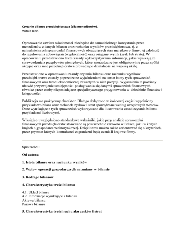 Czytanie bilansu przedsiębiorstwa (dla menedżerów). Witold Bień Opracowanie zawiera wiadomości niezbędne do samodzielnego korzystania przez menedżerów z danych bilansu oraz rachunku wyników przedsiębiorstwa, tj. z najważniejszych sprawozdań finansowych obrazujących stan majątkowy firmy, jej zdolność do regulowania zobowiązań (wypłacalność) oraz osiągany wynik (zysk lub stratę). W opracowaniu przedstawiono także zasady wykorzystywania informacji, jakie wynikają ze sprawozdania z przepływów pieniężnych, które sporządzane jest obligatoryjnie przez spółki akcyjne oraz inne przedsiębiorstwa prowadzące działalność na większą skalę. Przedstawione w opracowaniu zasady czytania bilansu oraz rachunku wyników przedsiębiorstwa zostały poprzedzone wyjaśnieniami na temat istoty tych sprawozdań finansowych oraz treści ekonomicznej zawartych w nich pozycji. Wyjaśnienia te powinny ułatwić przyswojenie umiejętności posługiwania się danymi sprawozdań finansowych również przez osoby nieposiadające specjalistycznego przygotowania w dziedzinie finansów i księgowości. Publikacja ma praktyczny charakter. Dlatego dołączono w końcowej części wypełniony przykładowo bilans oraz rachunek zysków i strat sporządzone według urzędowych wzorów. Dane wynikające z tych sprawozdań wykorzystano dla ilustrowania zasad czytania bilansu przykładami liczbowymi. W książce uwzględniono standardowe wskaźniki, jakie przy analizie sprawozdań finansowych przedsiębiorstw stosowane są powszechnie zarówno w Polsce, jak i w innych krajach o gospodarce wolnorynkowej. Dzięki temu można także zorientować się o kryteriach, przez pryzmat których kontrahenci zagraniczni będą oceniali krajowe firmy. Spis treści: Od autora 1. Istota bilansu oraz rachunku wyników 2. Wpływ operacji gospodarczych na zmiany w bilansie 3. Rodzaje bilansów 4. Charakterystyka treści bilansu 4.1. Układ bilansu 4.2. Informacje wynikające z bilansu Aktywa bilansu Pasywa bilansu 5. Charakterystyka treści rachunku zysków i strat 5.1. Układ rachunku 5.2. Informacje uzyskiwane z rachunku zysków i strat 6. Pozioma i pionowa analiza sprawozdań finansowych 6.1. Założenia ogólne 6.2. Analiza wyniku finansowego 6.3. Analiza sytuacji majątkowej 6.4. Analiza przepływów pieniężnych 7. Wskaźnikowa analiza sprawozdań finansowych 7.1. Charakterystyka ogólna 7.2. Wskaźniki rentowności 7.3. Wskaźniki płynności finansowej 7.4. Wskaźniki wypłacalności 7.5. Wskaźniki rynku kapitałowego 7.6. Podsumowanie analizy 8. Załączniki 1. Bilans 2. Rachunek zysków i strat (wariant porównawczy) 3. Rachunek zysków i strat (wariant kalkulacyjny) Zobacz także: Książka zawiera wiadomości niezbędne dla samodzielnego korzystania przez menedżerów z bilansu rachunków wyniku przedsiębiorstwa. Przedstawia także zasady wykorzystania Informacji zawartych w sprawozdaniu z przepływów pieniężnych. Autor zaprezentował typowe wskaźniki, które są wykorzystywane w analizie sprawozdań finansowych. Najwięcej uwagi poświęcił wskaźnikom rentowności. Czytelnicy dowiedzą się m.in.: jak obliczyć zyskowność: sprzedaży, majątku albo kapitału zakładowego. Omówiona została również dźwignia finansowa. Autor wskazuje, kiedy firma odnosi z niej korzyści, a w jakich sytuacjach korzystanie z zewnętrznego finansowania nie jest opłacalne. W czasie oceny przedsiębiorstwa konieczne jest także obliczenie wskaźników płynności finansowej, np. pokrycia bieżących zobowiązań(odpowiedź na to pytanie, czy firma będzie mogłaby je spłacić za pomocą środków obrotowych). Przedstawione są również wskaźniki wykorzystywane zwykle przez inwestorów giełdowych(zysk na jedną akcję, stop dywidendy). Do książki dołączone jest przykładowo wypełnione sprawozdanie finansowe. Dane w nim zawarte wykorzystano dla zaprezentowania zasad jego analizy. Prawo i praktyka”, Rzeczpospolita, 31..03.2011, autor kpt Lektura do poduszki…. menedżera Czytanie ze zrozumieniem to wyższy poziom umiejętności składania literek. Umiejętność czytania bilansu przedsiębiorstwa to najwyższy poziom – przynajmniej dla menedżerów i biznesmenów – składania literek i cyferek. Dużo mówi się o świadomym inwestowaniu, ale już niewiele o tym, jak tę świadomość posiąść. Skąd zdobyć wiedzę niezbędną do podejmowania racjonalnych decyzji. Z „dokumentów”- brzmi podpowiedź. Wiedza o firmie jest łatwa do zdobycia, trzeba tylko wiedzieć gdzie jej szukać. A jak już znajdziemy – to jak z pogodą, gdy na podstawie kształtu chmur, lotu ptaków można przewidzieć jaka będzie za kilka dni – tak przyszłe losy firmy możemy odczytać, tyle że znaki te ukryte są tabelkach bilansu. Książka prof. Witolda Bienia „Czytanie bilansu przedsiębiorstwa” jest zwięzłym poradnikiem przybliżającym zasady czytania bilansu oraz rachunku wyników przedsiębiorstwa. Autor do minimum zredukował rozważania teoretyczne – ograniczył się do wyjaśnienia istoty i znaczenia sprawozdań finansowych. Całą uwagę skupił na praktycznych przykładach analizując przepływy, tabelki i wskaźniki. Do książki dołączono wypełniony przykładowo bilans oraz rachunek zysków i strat sporządzone według urzędowych wzorów. Umożliwia to praktyczną weryfikację przytoczonych przykładów. Każdy menedżer ma wielu doradców, prawników, księgowych, ale podstawową wiedzą musi się wykazać na co dzień. Samodzielnie, bez podpowiadaczy. Na podstawie bilansu przedsiębiorstwa można ocenić stan firmy, którą kieruje, jej wypłacalność i zyskowność. Znajdują się w nim także dane umożliwiające wykrywanie nieprawidłowości. Analiza przepływów pieniężnych umożliwia ocenę płynności finansowej i ewentualnego zagrożenia płynności. Pozwala na ocenę stanu bieżącego wyciągania wniosków co do koniecznych przyszłych działań. Sprawozdania finansowe są