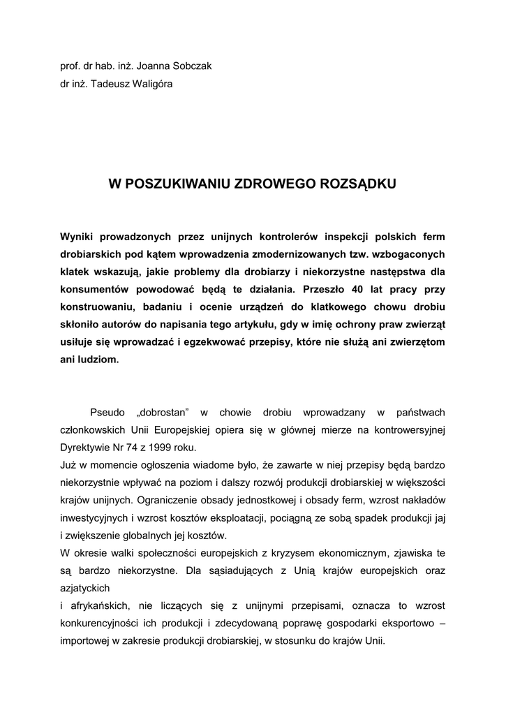 prof. dr hab. inż. Joanna Sobczak dr inż. Tadeusz Waligóra W POSZUKIWANIU ZDROWEGO ROZSĄDKU Wyniki prowadzonych przez unijnych kontrolerów inspekcji polskich ferm drobiarskich pod kątem wprowadzenia zmodernizowanych tzw. wzbogaconych klatek wskazują, jakie problemy dla drobiarzy i niekorzystne następstwa dla konsumentów powodować będą te działania. Przeszło 40 lat pracy przy konstruowaniu, badaniu i ocenie urządzeń do klatkowego chowu drobiu skłoniło autorów do napisania tego artykułu, gdy w imię ochrony praw zwierząt usiłuje się wprowadzać i egzekwować przepisy, które nie służą ani zwierzętom ani ludziom. Pseudo „dobrostan” w chowie drobiu wprowadzany w państwach członkowskich Unii Europejskiej opiera się w głównej mierze na kontrowersyjnej Dyrektywie Nr 74 z 1999 roku. Już w momencie ogłoszenia wiadome było, że zawarte w niej przepisy będą bardzo niekorzystnie wpływać na poziom i dalszy rozwój produkcji drobiarskiej w większości krajów unijnych. Ograniczenie obsady jednostkowej i obsady ferm, wzrost nakładów inwestycyjnych i wzrost kosztów eksploatacji, pociągną ze sobą spadek produkcji jaj i zwiększenie globalnych jej kosztów. W okresie walki społeczności europejskich z kryzysem ekonomicznym, zjawiska te są bardzo niekorzystne. Dla sąsiadujących z Unią krajów europejskich oraz azjatyckich i afrykańskich, nie liczących się z unijnymi przepisami, oznacza to wzrost konkurencyjności ich produkcji i zdecydowaną poprawę gospodarki eksportowo – importowej w zakresie produkcji drobiarskiej, w stosunku do krajów Unii. Trudno negować pozytywny wpływ niektórych przepisów zawartych w omawianej Dyrektywie na warunki bytowania ptaków, co jednak nie może zmienić opinii o całości tego aktu. Warto też pamiętać, że wymuszona Dyrektywą wymiana względnie modernizacja wyposażenia ferm przyniosła koniunkturę niektórym jego producentom i handlowcom. Sytuacja polskich drobiarzy znacznie odbiegała od warunków, w jakich zmiany wprowadzano w „starych” krajach Unii i była niekorzystna. Wejście Polski do UE w roku 2004 i stopniowe dostosowywanie przepisów polskiego prawa do wzorców unijnych, w naturalny sposób opóźniło wprowadzenie zmian w polskim drobiarstwie. Mimo starań ze strony władz i publikatorów (m.in. „Polskie Drobiarstwo”) powstał w tym okresie dość znaczny chaos informacyjny. Był on wykorzystany przez niektórych producentów sprzętu lub pośredników na wpychanie do Polski urządzeń, które w świetle cytowanej Dyrektywy Nr 74/1999 miały w niedługim czasie podlegać wymianie, a w krajach zachodnich nie znajdowały nabywców. Oferowane przy tym korzystne warunki zakupu i różnorakie udogodnienia kredytowe skłaniały rolników do zadłużania się i kupowania rzekomo nowoczesnego sprzętu. Trudno się dziwić, że w tych warunkach krytyczne uwagi i ostrzeżenia, m.in. autorów niniejszego artykułu, wygłaszane w czasie MTP Polagra, na szkoleniach w ODR-ach i w publikacjach budziły raczej niechęć i niedowierzanie niż zrozumienie. Efekty negatywne tych zaszłości już są, a te najbardziej niekorzystne jeszcze przed nami. Kończy się okres karencji na przestarzałe urządzenia i będziemy się zaopatrywać w „klatki wzbogacone”. Zanim jednak do tego dojdzie warto byłoby rzetelnie przeanalizować raz jeszcze, jakie są efekty wprowadzenia Dyrektywy 74/1999 zarówno dla ptaków jak i ludzi. Obyśmy za lat pięć nie wprowadzali w miejsce „wzbogaconych”, klatek „kryzysowych” czy „upadłościowych”. Z uwagi na fakt, że wspomniana Dyrektywa doskwiera rolnikom w wielu krajach, jest jeszcze czas, by wspólnym wysiłkiem w Parlamencie Europejskim doprowadzić do jej korekty tak, by faktycznie stymulowała dobrostan, a nie jego pozorację. Poniżej omówiono pokrótce wymagania wspomnianej Dyrektywy, z rozdziałem na przynoszące efekty pozytywne oraz te, których realizacja budzi zastrzeżenia bądź stymuluje działania obojętne względnie niekorzystne dla ptaków względnie ludzi. 2 Ustalenie powierzchni podłogi klatki przypadającej na jedną kurę na poziomie 750 cm2 a tzw. „powierzchni użytkowej” na 600 cm2 jest niekorzystne z punktu widzenia ekonomicznego, nie mniej spełnia wytyczony cel poprawy warunków bytowania ptaków. Stosowane niekiedy wcześniej wielkości rzędu 300 (i nieco więcej) cm2/szt. były nie do przyjęcia i słusznie wywoływały sprzeciwy obrońców praw zwierząt. Wysokość klatki nad „powierzchnią użytkową” określona na 45 cm zapewnia ptakom utrzymanie pozycji wyprostowanej i swobodę poruszania. Zapewnienie wysokości min. 20 cm w pozostałej części klatki nie budzi zastrzeżeń, lecz ma się nijak do praktycznej możliwości wykorzystania takiej przestrzeni przez kury. Pochylenie podłogi klatki w obszarze powierzchni użytkowej pod kątem 14 % odpowiada tejże wielkości w większości klatek tradycyjnych. Problem ten przy omawianiu klatek wzbogaconych dyskretnie pominięto, nie mniej wynika on z samej definicji powierzchni użytkowej. Prawdopodobnie założono, że kury niekoniecznie będą korzystać z dobrostanu, jaki ma im zapewnić wstawione do klatki gniazdo i będą znosić jaja zarówno w gnieździe jak i na podłogę klatki, skąd przy odpowiednim jej nachyleniu samoistnie się wytoczą. Wymagania dotyczące dostępu do karmideł (12 cm/szt.) i poideł (minimum do 2 kroplowych) nie budzą żadnych zastrzeżeń. Wielkości te są zupełnie wystarczające i zapewniają ptakom dobre warunki do korzystania oraz pełne bezpieczeństwo. Wprowadzenie do klatek grzęd to jeden z przepisów, który budzi wątpliwości co do celowości i możliwości wykonawczych oraz skutków realizacji. Jedną z funkcji, jaką spełniają grzędy w chowie drobiu, jest tworzenie hierarchii stada. Wymaga to usytuowania grzęd na różnych wysokościach, co w klatce o ograniczonych gabarytach jest niemożliwe. I znów w Dyrektywie dy