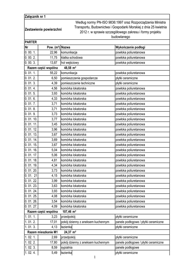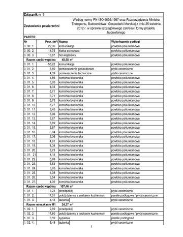 Załącznik nr 1 Zestawienie powierzchni PARTER Pow. (m²) Nr 0. 00. 1. 22,96 0. 00. 2. 11,75 0. 00. 3. 13,87 Razem część wspólna 0. 01. 1. 55,22 0. 01. 2. 6,50 0. 01. 3. 4,39 0. 01. 4. 4,56 0. 01. 5. 3,93 0. 01. 6. 4,33 0. 01. 7. 3,71 0. 01. 8. 3,71 0. 01. 9. 3,73 0. 01. 10. 3,77 0. 01. 11. 3,45 0. 01. 12. 3,96 0. 01. 13. 3,67 0. 01. 14. 3,69 0. 01. 15. 3,67 0. 01. 16. 5,04 0. 01. 17. 5,06 0. 01. 18. 4,81 0. 01. 19. 4,34 0. 01. 20. 3,73 0. 01. 21 4,15 0. 01. 22. 3,99 0. 01. 23. 3,63 0. 01. 24. 3,93 0. 01. 25. 4,08 0. 01. 26. 3,54 0. 01. 27. 4,09 Razem część wspólna 1. 01. 1. 3,23 1. 01. 2. 17,01 1. 01. 3. 4,13 Razem mieszkanie M1 1. 02. 1. 2,69 1. 02. 2. 17,80 1. 02. 3. 8,59 1. 02. 4. 5,49 Według normy PN-ISO 9836:1997 oraz Rozporządzenia Ministra Transportu, Budownictwa i Gospodarki Morskiej z dnia 25 kwietnia 2012 r. w sprawie szczegółowego zakresu i formy projektu budowlanego Nazwa komunikacja klatka schodowa hol wejściowy 48,58 m² komunikacja pomieszczenie gospodarcze pomieszczenie techniczne komórka lokatorska komórka lokatorska komórka lokatorska komórka lokatorska komórka lokatorska komórka lokatorska komórka lokatorska komórka lokatorska komórka lokatorska komórka lokatorska komórka lokatorska komórka lokatorska komórka lokatorska komórka lokatorska komórka lokatorska komórka lokatorska komórka lokatorska komórka lokatorska komórka lokatorska komórka lokatorska komórka lokatorska komórka lokatorska komórka lokatorska komórka lokatorska 107,46 m² przedpokój pokój dzienny z aneksem kuchennym łazienka 24,37 m² przedpokój pokój dzienny z aneksem kuchennym sypialnia łazienka 1 Wykończenie podłogi powłoka poliuretanowa powłoka poliuretanowa powłoka poliuretanowa powłoka poliuretanowa płytki ceramiczne płytki ceramiczne powłoka poliuretanowa powłoka poliuretanowa powłoka poliuretanowa powłoka poliuretanowa powłoka poliuretanowa powłoka poliuretanowa powłoka poliuretanowa powłoka poliuretanowa powłoka poliuretanowa powłoka poliuretanowa powłoka poliuretanowa powłoka poliuretanowa powłoka poliuretanowa powłoka poliuretanowa powłoka poliuretanowa powłoka poliuretanowa powłoka poliuretanowa powłoka poliuretanowa powłoka poliuretanowa powłoka poliuretanowa powłoka poliuretanowa powłoka poliuretanowa powłoka poliuretanowa powłoka poliuretanowa płytki ceramiczne panele podłogowe / płytki ceramiczne płytki ceramiczne płytki ceramiczne panele podłogowe / płytki ceramiczne panele podłogowe płytki ceramiczne Razem mieszkanie M2 1. 03. 1. 2.69 1. 03. 2. 17,80 1. 03. 3. 8,59 1. 03. 4. 6,54 Razem mieszkanie M3 1. 04. 1. 3,23 1. 04. 3. 17,01 1. 04. 4. 4,13 Razem mieszkanie M4 RAZEM 327,50 34,57 m² przedpokój pokój dzienny z aneksem kuchennym sypialnia łazienka 32,93 m² przedpokój sypialnia łazienka 24,37 m² m² 1. PIĘTRO Nr Pow. (m²) 2. 01. 1. 17,43 2. 01. 2. 14,82 2. 01. 3. 28,80 Razem część wspólna 2. 05. 1. 3,23 2. 05. 2. 17,01 2. 05. 2. 4,13 Razem mieszkanie M5 2. 06.01. 2,47 2. 06. 2. 18,12 2. 06. 3. 9,96 2. 06. 4. 4,20 Razem mieszkanie M6 2. 07. 1. 2,47 2. 07. 2. 18,12 2. 07. 3. 9,96 2. 07. 4. 4,20 Razem mieszkanie M7 2. 08. 1. 3,23 2. 08. 2. 17,01 2. 08. 3. 4,13 Razem mieszkanie M8 2. 09. 1. 3,23 2. 09. 2. 17,17 2. 09. 3. 4,13 Razem mieszkanie M9 2. 10. 1. 3,23 2. 10. 2. 17,17 2. 10. 3. 4,13 Razem mieszkanie M10 2. 11. 1. 2,47 2. 11. 2. 18,42 2. 11. 3. 9,96 Nazwa komunikacja klatka schodowa komunikacja 61,05 m² przedpokój pokój dzienny z aneksem kuchennym łazienka 24,37 m² przedpokój pokój dzienny z aneksem kuchennym sypialnia łazienka 34,75 m² przedpokój pokój dzienny z aneksem kuchennym sypialnia łazienka 34,75 m² przedpokój pokój dzienny z aneksem kuchennym łazienka 24,37 m² przedpokój pokój dzienny z aneksem kuchennym łazienka 24,53 m² przedpokój pokój dzienny z aneksem kuchennym łazienka 24,53 m² przedpokój pokój dzienny z aneksem kuchennym sypialnia 2 płytki ceramiczne panele podłogowe / płytki ceramiczne panele podłogowe płytki ceramiczne płytki ceramiczne panele podłogowe / płytki ceramiczne płytki ceramiczne Wykończenie podłogi powłoka poliuretanowa powłoka poliuretanowa powłoka poliuretanowa płytki ceramiczne panele podłogowe / płytki ceramiczne płytki ceramiczne płytki ceramiczne panele podłogowe / płytki ceramiczne panele podłogowe płytki ceramiczne płytki ceramiczne panele podłogowe / płytki ceramiczne panele podłogowe płytki ceramiczne płytki ceramiczne panele podłogowe / płytki ceramiczne płytki ceramiczne płytki ceramiczne panele podłogowe / płytki ceramiczne płytki ceramiczne płytki ceramiczne panele podłogowe / płytki ceramiczne płytki ceramiczne płytki ceramiczne panele podłogowe / płytki ceramiczne panele podłogowe 2. 11. 4. 4,20 Razem mieszkanie M11 2. 12. 1. 3,23 2. 12 2. 17,17 2. 12. 3. 4,13 Razem mieszkanie M12 2. 13. 1. 3,23 2. 13. 2. 17,17 2. 13 3. 4,13 Razem mieszkanie M13 2. 14. 1. 3,23 2. 14 2. 16,63 2. 14 3. 4,48 Razem mieszkanie M14 336,80 RAZEM łazienka 35,05 m² przedpokój pokój dzienny z aneksem kuchennym łazienka 24,53 m² przedpokój pokój dzienny z aneksem kuchennym łazienka 24,53 m² przedpokój pokój dzienny z aneksem kuchennym łazienka 24,34 m² m² 2. PIĘTRO Pow. (m²) Nr 3. 01. 1. 17,43 3. 01. 2. 14,82 3. 01. 3. 28,80 Razem część wspólna 3. 15. 1. 3,23 3. 15. 2. 17,01 3. 15 3. 4,13 Razem mieszkanie M15 3. 16. 1. 2,47 3. 16. 2. 18,12 3. 16. 3. 9,96 3. 16. 4. 4,20 Razem mieszkanie M16 3. 17. 1. 2,47 3. 17. 2. 18,12 3. 17. 3. 9,96 3. 17. 4. 4,20 Razem mieszkanie M17 3. 18. 1. 3,23 3. 18. 2. 17,01 3. 18. 3. 4,13 Razem mieszkanie M18 3. 19. 1. 3,23 3. 19. 2. 17,17 3. 19. 3. 4,13 Razem mieszkanie M19 3. 20. 1. 3,23 3. 20 2. 17,17 3. 20. 3. 4,13 Nazwa komunikacja klatka schodowa komunikacja 61,05 m² przedpokój pokój dzienny z aneksem kuchennym łazienka 24,37 m² przedpokój pokój dzienny z aneksem kuchennym sypialnia łazienka 34,75 m² przedpokój pokój dzienny z aneksem