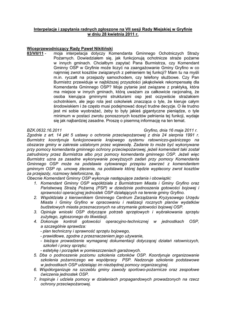 Interpelacje i zapytania radnych zgłoszone na VII sesji Rady Miejskiej w Gryfinie w dniu 28 kwietnia 2011 r. Wiceprzewodniczący Rady Paweł Nikitiński 83/VII/11 moja interpelacja dotyczy Komendanta Gminnego Ochotniczych Straży Pożarnych. Dowiedziałem się, jak funkcjonują ochotnicze straże pożarne w innych gminach. Chciałbym zapytać Pana Burmistrza, czy Komendant Gminny OSP w Gryfinie może liczyć na zaangażowanie Gminy Gryfino w co najmniej zwrot kosztów związanych z pełnieniem tej funkcji? Mam tu na myśli m.in. ryczałt na przejazdy samochodem, czy telefony służbowe. Czy Pan Burmistrz przewiduje w najbliższej przyszłości jakąkolwiek rekompensatę dla Komendanta Gminnego OSP? Moje pytanie jest związane z praktyką, która ma miejsce w innych gminach, którą uważam za całkowicie racjonalną, że osoba kierująca gminnymi strukturami osp jest oczywiście strażakiem ochotnikiem, ale jego rola jest cokolwiek znacząca o tyle, że kieruje całym środowiskiem i że często musi podejmować dosyć trudne decyzje. O ile trudno jest mi sobie wyobrażać, żeby to były jakieś gigantyczne pieniądze, o tyle minimum w postaci zwrotu ponoszonych kosztów pełnienia tej funkcji, wydaje się jak najbardziej zasadne. Proszę o pisemną informację na ten temat. BZK.0632.16.2011 Gryfino, dnia 16 maja 2011 r. Zgodnie z art. 14 pkt 5 ustawy o ochronie przeciwpożarowej z dnia 24 sierpnia 1991 r. Burmistrz koordynuje funkcjonowanie krajowego systemu ratowniczo-gaśniczego na obszarze gminy w zakresie ustalonym przez wojewodę. Zadanie to może być wykonywane przy pomocy komendanta gminnego ochrony przeciwpożarowej, jeżeli komendant taki został zatrudniony przez Burmistrza albo pryz pomocy komendanta gminnego OSP. Jeżeli więc Burmistrz uzna za zasadne wykonywanie powyższych zadań przy pomocy Komendanta Gminnego OSP może na podstawie cytowanego przepisu zawrzeć z komendantem gminnym OSP np. umowę zlecenie, na podstawie której będzie wypłacony zwrot kosztów za przejazdy, rozmowy telefoniczne, itp. Obecnie Komendant Gminny OSP wykonuje następujące zadania i obowiązki: 1. Komendant Gminny OSP współdziała z Burmistrzem Miasta i Gminy Gryfino oraz Państwową Strażą Pożarną (PSP) w dziedzinie podnoszenia gotowości bojowej i sprawności operacyjnej jednostek OSP działających na terenie gminy Gryfino. 2. Współdziała z kierownikiem Gminnego Centrum Zarządzania Kryzysowego Urzędu Miasta i Gminy Gryfino w opracowaniu i realizacji rocznych planów wydatków budżetowych miasta przeznaczonych na utrzymanie gotowości bojowej OSP. 3. Opiniuje wnioski OSP dotyczące potrzeb sprzętowych i wybrakowania sprzętu zużytego, zgłoszonego do likwidacji. 4. Dokonuje kontroli gotowości operacyjno-technicznej w jednostkach OSP, a szczególnie sprawdza: - plan techniczny i sprawność sprzętu bojowego, - prawidłowe, zgodne z przeznaczeniem jego używanie, - bieżące prowadzenie wymaganej dokumentacji dotyczącej działań ratowniczych, szkoleń i pracy sprzętu; - estetykę i porządek w pomieszczeniach garażowych. 5. Dba o podnoszenie poziomu szkolenia członków OSP. Koordynuje organizowanie szkolenia pożarniczego we współpracy PSP. Nadzoruje szkolenie podstawowe w jednostkach OSP udzielając im niezbędnej pomocy organizacyjnej. 6. Współorganizuje na szczeblu gminy zawody sportowo-pożarnicze oraz zespołowe ćwiczenia jednostek OSP. 7. Inspiruje i udziela pomocy w działaniach propagandowych prowadzonych na rzecz ochrony przeciwpożarowej. 8. Służy radą i nadzoruje stosowanie przepisów oraz zasad bph w jednostkach OSP. Czuwa nad realizacją przez jednostki OSP wymogów odnośnie posiadania przez kierowców-mechaników uprawnień do prowadzenia uprzywilejowanych samochodów pożarniczych oraz odbywania okresowych badań lekarskich przez członków OSP biorących udział w działaniach ratowniczych. 9. Komendant Gminny wydaje jednostkom OSP z terenu gminy zalecenia w sprawach należących do jego kompetencji. O swoich działaniach i stanie jednostek OSP informuje Burmistrza w sprawozdaniu rocznym, a Kierownika Gminnego Centrum Zarządzania Kryzysowego na bieżąco. 10. Nadzoruje pracę konserwatorów pojazdów OSP zatrudnionych przez Gminę. 11. Prowadzenie dokumentacji eksploatacyjnej samochodów pożarniczych, rozliczanie kart drogowych. W związku z ww zadaniami możliwe jest zawarcie umowy zlecenia, na podstawie której będzie wypłacony zwrot kosztów. W planie wydatków Gminnego Centrum Zarządzania Kryzysowego w dziale 754, rozdziale 75412, paragrafie 4170 wynagrodzenia bezosobowe obecnie nie ma zaplanowanych środków na wynagrodzenie dla Komendanta Gminnego OSP. Środki takie mogą być zaplanowane w budżecie na 2012 r. BURMISTRZ Miasta i Gminy Gryfino Henryk Piłat Wiceprzewodniczący Rady Paweł Nikitiński moja interpelacja dotyczy osób niepełnosprawnych i ich korzystania z basenu 84/VII/11 w Centrum Wodnego Laguna. Czy Pan Burmistrz rozważa, albo ma alternatywny pomysł dla bezpłatnego korzystania z CW Laguna, będącego naszą własnością przez osoby niepełnosprawne? Czy ma Pan jakieś rozwiązanie, pomysł, względnie hierarchie decyzji, co do tego, które osoby będą mogły korzystać bezpłatnie? Mam tu na myśli kryterium dochodowe, jeśli bierze je Pan pod uwagę lub też przywrócenie stanu, w którym osoby niepełnosprawne mogą bezpłatnie korzystać z basenu. CW/JG/341/2010 Gryfino, dnia 27.05.2010 r. W odpowiedzi na ww interpelację informujemy dla uściślenia tematu, że dofinansowanie inwestycji na obiekcie CW Laguna udzielone przez Państwowy Fundusz Rehabilitacji Osób Niepełnosprawnych realizowane było w ramach umowy podpisanej przez Fundację na Rzecz Budowy Obiektów Sportowych w Mieście i Gminie Gryfino, która weszła w życie z dniem 18.10.2000 r. Warunkiem dofinansowania przez PFRON była możliwość korzystania z zasobów CW Laguna przez osoby niepełnosprawne bezpłatnie raz w tygodniu. Zgodnie z post