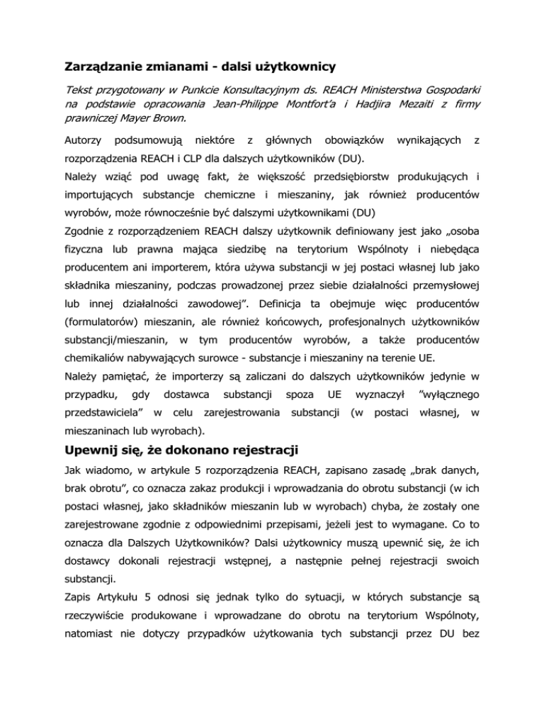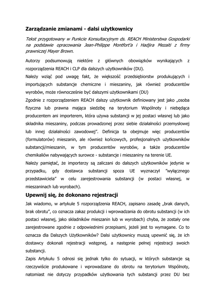 Zarządzanie zmianami - dalsi użytkownicy Tekst przygotowany w Punkcie Konsultacyjnym ds. REACH Ministerstwa Gospodarki na podstawie opracowania Jean-Philippe Montfort’a i Hadjira Mezaiti z firmy prawniczej Mayer Brown. Autorzy podsumowują niektóre z głównych obowiązków wynikających z rozporządzenia REACH i CLP dla dalszych użytkowników (DU). Należy wziąć pod uwagę fakt, że większość przedsiębiorstw produkujących i importujących substancje chemiczne i mieszaniny, jak również producentów wyrobów, może równocześnie być dalszymi użytkownikami (DU) Zgodnie z rozporządzeniem REACH dalszy użytkownik definiowany jest jako „osoba fizyczna lub prawna mająca siedzibę na terytorium Wspólnoty i niebędąca producentem ani importerem, która używa substancji w jej postaci własnej lub jako składnika mieszaniny, podczas prowadzonej przez siebie działalności przemysłowej lub innej działalności zawodowej”. Definicja ta obejmuje więc producentów (formulatorów) mieszanin, ale również końcowych, profesjonalnych użytkowników substancji/mieszanin, w tym producentów wyrobów, a także producentów chemikaliów nabywających surowce - substancje i mieszaniny na terenie UE. Należy pamiętać, że importerzy są zaliczani do dalszych użytkowników jedynie w przypadku, gdy przedstawiciela” dostawca w celu substancji zarejestrowania spoza UE substancji wyznaczył (w postaci ”wyłącznego własnej, w mieszaninach lub wyrobach). Upewnij się, że dokonano rejestracji Jak wiadomo, w artykule 5 rozporządzenia REACH, zapisano zasadę „brak danych, brak obrotu”, co oznacza zakaz produkcji i wprowadzania do obrotu substancji (w ich postaci własnej, jako składników mieszanin lub w wyrobach) chyba, że zostały one zarejestrowane zgodnie z odpowiednimi przepisami, jeżeli jest to wymagane. Co to oznacza dla Dalszych Użytkowników? Dalsi użytkownicy muszą upewnić się, że ich dostawcy dokonali rejestracji wstępnej, a następnie pełnej rejestracji swoich substancji. Zapis Artykułu 5 odnosi się jednak tylko do sytuacji, w których substancje są rzeczywiście produkowane i wprowadzane do obrotu na terytorium Wspólnoty, natomiast nie dotyczy przypadków użytkowania tych substancji przez DU bez wprowadzania do obrotu. Jednocześnie, co było kwestią sporną, ustalono że zasada ta nie odnosi się do „substancji składowanych”, zakupionych przez DU przed upływem terminu rejestracji, nawet jeśli dostawca ostatecznie nie zarejestrował substancji. Wreszcie, zasada ta nie odnosi się do substancji, które zostały zarejestrowane, ale sposób wykorzystania przez DU nie jest objęty scenariuszami narażenia opracowanymi przez dostawcę. Zapisy rozporządzenia REACH odnoszące się do DU stanowią, aby scenariusze narażenia powinny zostać uwzględnione w dokumentacji rejestracyjnej przez dostawcę, albo powinny być sporządzone samodzielnie przez DU. Dalsi użytkownicy którzy chcą zapewnić ciągłość dostaw od dostawców, powinni zadbać, aby być w posiadaniu aktualnych informacji o statusie substancji, które kupują i w miarę możliwości gwarancji w formie umowy, że będą wspierani przez dostawców w przyszłości. Upewnij się, że Twoje zastosowania zostały uwzględnione REACH wymaga od rejestrujących uwzględnienia „zastosowań zidentyfikowanych” definiowanych jako „zastosowanie substancji w jej postaci własnej lub jako składnika mieszaniny lub też zastosowanie mieszaniny, które jest zamierzone przez uczestnika łańcucha dostaw, włączając w to jego użytek własny, lub też zastosowanie, o którym jest on powiadomiony na piśmie przez bezpośredniego dalszego użytkownika”. Zasadniczo obejmuje to dwie kategorie zastosowań: • własne zastosowanie producenta lub importera i • zastosowania określone przez bezpośrednich odbiorców - dalszych użytkowników. Informacja dotycząca zastosowania jest niezbędna dla rejestrującego do przeprowadzenia analizy ryzyka i opracowania scenariusza narażenia, jeśli jest on wymagany. REACH przyznaje dalszemu użytkownikowi prawo do pisemnego poinformowania dostawcy o zastosowaniu substancji, tak aby stało się ono zastosowaniem zidentyfikowanym. W tym celu DU muszą dostarczyć informacje wystarczające do sporządzenia przez dostawcę scenariusza narażenia (lub określenia kategorii stosowania i narażenia) w odpowiednim czasie. Musi to nastąpić na minimum rok przed upływem terminu rejestracji dla substancji wprowadzonych w przypadku zastosowań, które mają być uwzględnione w dokumentacji rejestracyjnej. Dalsi użytkownicy nie mają obowiązku określenia zastosowania. Mogą oni, w szczególności ze względu na kwestię poufności, wziąć odpowiedzialność za określenie czy scenariusz narażenia obejmuje ich konkretne zastosowanie/a. Mogą również wykonać własną analizę ryzyka i przygotować własny raport bezpieczeństwa chemicznego, jeśli jest on wymagany. Po otrzymaniu od dalszego użytkownika opisu zastosowania, dostawca może stwierdzić, że: • ryzyko tego zastosowania jest możliwe do kontrolowania. W takim przypadku opracowuje scenariusz narażenia • stanowi ono takie zagrożenie dla człowieka/środowiska, którego nie może zaakceptować i je odradza • podejmuje decyzję, że nie będzie dłużej dostarczał substancji do tego zastosowania. W pierwszym przypadku istnieje problem w przypadku gdy substancja została już zarejestrowana, ponieważ dostawcy powinni uwzględnić zastosowanie zidentyfikowane w przeciągu miesiąca od otrzymania prośby, bądź też przed następną dostawą, co może być trudne do wykonania. Oczywiście mogą oni stwierdzić, że nie otrzymali od DU wystarczających informacji do opracowania scenariusza narażenia, co może dać im więcej czasu na uwzględnienie zastosowania. W drugim przypadku, gdy dostawca odradza zastosowanie, musi się on liczyć z obowiązkiem uzasadnienia podjętej decyzji na piśm