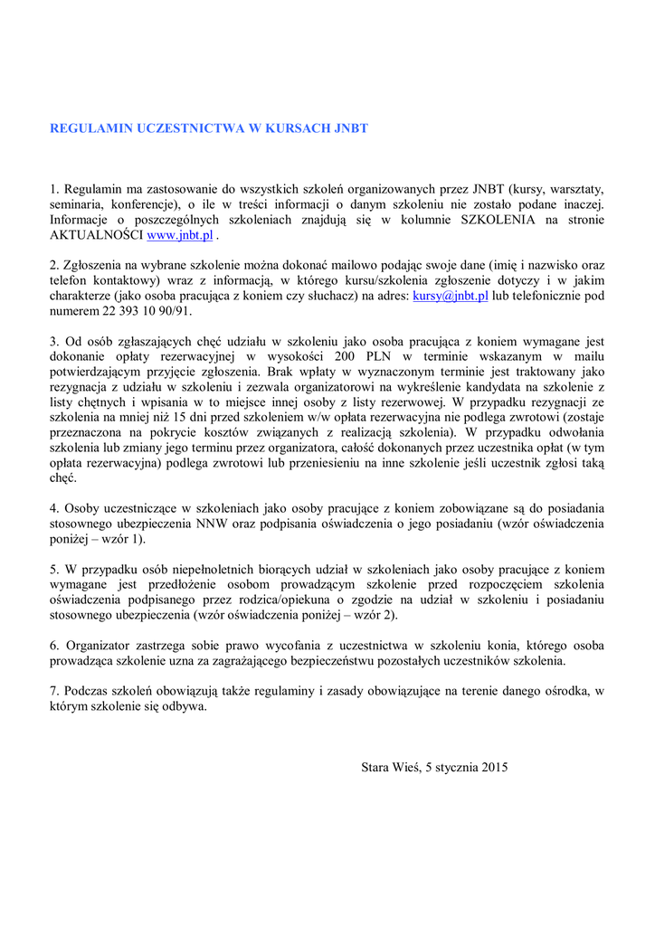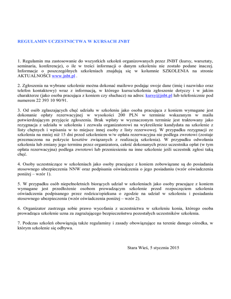 REGULAMIN UCZESTNICTWA W KURSACH JNBT 1. Regulamin ma zastosowanie do wszystkich szkoleń organizowanych przez JNBT (kursy, warsztaty, seminaria, konferencje), o ile w treści informacji o danym szkoleniu nie zostało podane inaczej. Informacje o poszczególnych szkoleniach znajdują się w kolumnie SZKOLENIA na stronie AKTUALNOŚCI www.jnbt.pl . 2. Zgłoszenia na wybrane szkolenie można dokonać mailowo podając swoje dane (imię i nazwisko oraz telefon kontaktowy) wraz z informacją, w którego kursu/szkolenia zgłoszenie dotyczy i w jakim charakterze (jako osoba pracująca z koniem czy słuchacz) na adres: [email protected] lub telefonicznie pod numerem 22 393 10 90/91. 3. Od osób zgłaszających chęć udziału w szkoleniu jako osoba pracująca z koniem wymagane jest dokonanie opłaty rezerwacyjnej w wysokości 200 PLN w terminie wskazanym w mailu potwierdzającym przyjęcie zgłoszenia. Brak wpłaty w wyznaczonym terminie jest traktowany jako rezygnacja z udziału w szkoleniu i zezwala organizatorowi na wykreślenie kandydata na szkolenie z listy chętnych i wpisania w to miejsce innej osoby z listy rezerwowej. W przypadku rezygnacji ze szkolenia na mniej niż 15 dni przed szkoleniem w/w opłata rezerwacyjna nie podlega zwrotowi (zostaje przeznaczona na pokrycie kosztów związanych z realizacją szkolenia). W przypadku odwołania szkolenia lub zmiany jego terminu przez organizatora, całość dokonanych przez uczestnika opłat (w tym opłata rezerwacyjna) podlega zwrotowi lub przeniesieniu na inne szkolenie jeśli uczestnik zgłosi taką chęć. 4. Osoby uczestniczące w szkoleniach jako osoby pracujące z koniem zobowiązane są do posiadania stosownego ubezpieczenia NNW oraz podpisania oświadczenia o jego posiadaniu (wzór oświadczenia poniżej – wzór 1). 5. W przypadku osób niepełnoletnich biorących udział w szkoleniach jako osoby pracujące z koniem wymagane jest przedłożenie osobom prowadzącym szkolenie przed rozpoczęciem szkolenia oświadczenia podpisanego przez rodzica/opiekuna o zgodzie na udział w szkoleniu i posiadaniu stosownego ubezpieczenia (wzór oświadczenia poniżej – wzór 2). 6. Organizator zastrzega sobie prawo wycofania z uczestnictwa w szkoleniu konia, którego osoba prowadząca szkolenie uzna za zagrażającego bezpieczeństwu pozostałych uczestników szkolenia. 7. Podczas szkoleń obowiązują także regulaminy i zasady obowiązujące na terenie danego ośrodka, w którym szkolenie się odbywa. Stara Wieś, 5 stycznia 2015 Wzór 1 …………………………………………………….. miejscowość i data OŚWIADCZENIE Ja, …………………………………………………………, niżej podpisana/y oświadczam: imię i nazwisko Jestem świadoma/świadomy, że jazda konna jest sportem niebezpiecznym, rozumiem specyfikę jazdy konnej i naturę końskich zachowań i biorę udział w kursie JNBT w dniach …………………..………… w ośrodku …………………………………………. na własną odpowiedzialność. Jednocześnie oświadczam, iż posiadam stosowne ubezpieczenie NNW i w przypadku nieszczęśliwego wypadku nie będę wnosić roszczeń o odszkodowanie od właściciela konia, właściciela ośrodka ani osób prowadzących szkolenie. ………………………………………………………….. podpis Wzór 2 …………………………………………………….. miejscowość i data OŚWIADCZENIE Ja, …………………………………………………………, niżej podpisana/y oświadczam: imię i nazwisko Jestem świadoma/świadomy, że jazda konna jest sportem niebezpiecznym, rozumiem specyfikę jazdy konnej i naturę końskich zachowań. Wyrażam zgodę na udział mojego dziecka/podopiecznego ……………………………………. .......................................... , które jest niepełnoletnie, w kursie JNBT w dniach ………………………..………… w ośrodku ……………………………………… …… Jednocześnie oświadczam, iż dziecko posiada stosowne ubezpieczenie NNW i tym samym biorę za nie pełną odpowiedzialność podczas jego pobytu na terenie ośrodka, w którym prowadzony jest kurs oraz za ewentualne kontuzje jakie może ponieść związane ze specyfiką jazdy konnej i obchodzenia się z koniem. W przypadku nieszczęśliwego wypadku nie będę wnosić roszczeń o odszkodowanie od właściciela konia, właściciela ośrodka oraz osób prowadzących szkolenie. ………………………………………………………….. podpis rodzica / opiekuna prawnego