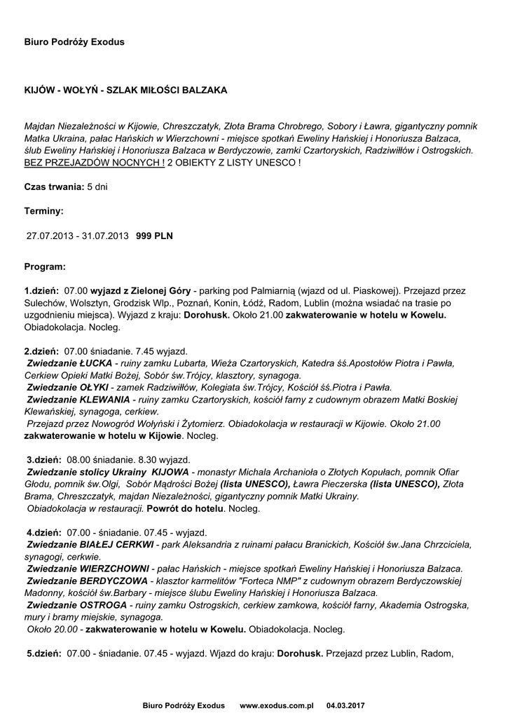 Biuro Podróży Exodus KIJÓW - WOŁYŃ - SZLAK MIŁOŚCI BALZAKA Majdan Niezależności w Kijowie, Chreszczatyk, Złota Brama Chrobrego, Sobory i Ławra, gigantyczny pomnik Matka Ukraina, pałac Hańskich w Wierzchowni - miejsce spotkań Eweliny Hańskiej i Honoriusza Balzaca, ślub Eweliny Hańskiej i Honoriusza Balzaca w Berdyczowie, zamki Czartoryskich, Radziwiłłów i Ostrogskich. BEZ PRZEJAZDÓW NOCNYCH ! 2 OBIEKTY Z LISTY UNESCO ! Czas trwania: 5 dni Terminy: 27.07.2013 - 31.07.2013 999 PLN Program: 1.dzień: 07.00 wyjazd z Zielonej Góry - parking pod Palmiarnią (wjazd od ul. Piaskowej). Przejazd przez Sulechów, Wolsztyn, Grodzisk Wlp., Poznań, Konin, Łódź, Radom, Lublin (można wsiadać na trasie po uzgodnieniu miejsca). Wyjazd z kraju: Dorohusk. Około 21.00 zakwaterowanie w hotelu w Kowelu. Obiadokolacja. Nocleg. 2.dzień: 07.00 śniadanie. 7.45 wyjazd. Zwiedzanie ŁUCKA - ruiny zamku Lubarta, Wieża Czartoryskich, Katedra śś.Apostołów Piotra i Pawła, Cerkiew Opieki Matki Bożej, Sobór św.Trójcy, klasztory, synagoga. Zwiedzanie OŁYKI - zamek Radziwiłłów, Kolegiata św.Trójcy, Kościół śś.Piotra i Pawła. Zwiedzanie KLEWANIA - ruiny zamku Czartoryskich, kościół farny z cudownym obrazem Matki Boskiej Klewańskiej, synagoga, cerkiew. Przejazd przez Nowogród Wołyński i Żytomierz. Obiadokolacja w restauracji w Kijowie. Około 21.00 zakwaterowanie w hotelu w Kijowie. Nocleg. 3.dzień: 08.00 śniadanie. 8.30 wyjazd. Zwiedzanie stolicy Ukrainy KIJOWA - monastyr Michala Archanioła o Złotych Kopułach, pomnik Ofiar Głodu, pomnik św.Olgi, Sobór Mądrości Bożej (lista UNESCO), Ławra Pieczerska (lista UNESCO), Złota Brama, Chreszczatyk, majdan Niezależności, gigantyczny pomnik Matki Ukrainy. Obiadokolacja w restauracji. Powrót do hotelu. Nocleg. 4.dzień: 07.00 - śniadanie. 07.45 - wyjazd. Zwiedzanie BIAŁEJ CERKWI - park Aleksandria z ruinami pałacu Branickich, Kościół św.Jana Chrzciciela, synagogi, cerkwie. Zwiedzanie WIERZCHOWNI - pałac Hańskich - miejsce spotkań Eweliny Hańskiej i Honoriusza Balzaca. Zwiedzanie BERDYCZOWA - klasztor karmelitów "Forteca NMP" z cudownym obrazem Berdyczowskiej Madonny, kościół św.Barbary - miejsce ślubu Eweliny Hańskiej i Honoriusza Balzaca. Zwiedzanie OSTROGA - ruiny zamku Ostrogskich, cerkiew zamkowa, kościół farny, Akademia Ostrogska, mury i bramy miejskie, synagoga. Około 20.00 - zakwaterowanie w hotelu w Kowelu. Obiadokolacja. Nocleg. 5.dzień: 07.00 - śniadanie. 07.45 - wyjazd. Wjazd do kraju: Dorohusk. Przejazd przez Lublin, Radom, Biuro Podróży Exodus www.exodus.com.pl 04.03.2017 Łódź, Poznań, Grodzisk Wlp., Wolsztyn, Sulechów. Około 22.00 - rozwiązanie imprezy w Zielonej Górze parking pod Palmiarnią. W cenie: autokar: wysokopokładowy, klimatyzacja, WC, video, napoje zimne i gorące (płatne) około 2600 km. noclegi: 4 x hotele kategorii turystycznej, pokoje 2,3-osob. z łaz/WC. wyżywienie: 4 śniadania + 4 obiadokolacje. pilot BP EXODUS ubezpieczenie NW, KL, bagaż. podatek VAT Dodatkowe opłaty: wejściówki do obiektów turystycznych około 30 Eur Uwaga: przy długich przejazdach autokar zatrzymuje się na 15-minutowe postoje każdorazowo po około 4-godzinnej jeździe. Nie bierzemy odpowiedzialności za punkty programu niezrealizowane z przyczyn od nas niezależnych. Wymagany jest paszport ważny w terminie min. do pół roku od dnia zakończenia imprezy. Biuro Podróży Exodus www.exodus.com.pl 04.03.2017