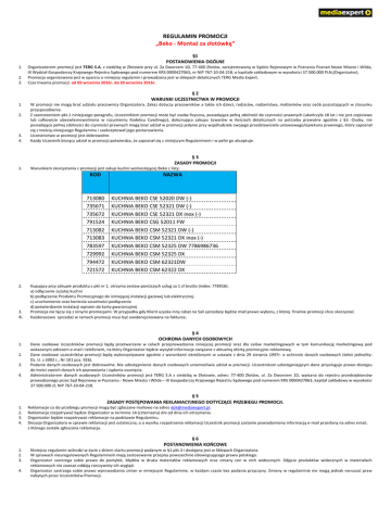REGULAMIN PROMOCJI „Beko - Montaż za złotówkę” 1. 2. 3. 1. 2. 3. 4. 1. §1 POSTANOWIENIA OGÓLNE Organizatorem promocji jest TERG S.A. z siedzibą w Złotowie przy ul. Za Dworcem 1D, 77-400 Złotów, zarejestrowaną w Sądzie Rejonowym w Poznaniu Poznań Nowe Miasto i Wilda, IX Wydział Gospodarczy Krajowego Rejestru Sądowego pod numerem KRS 0000427063, nr NIP 767-10-04-218, o kapitale zakładowym w wysokości 37.500.000 PLN,(Organizator). Promocja organizowana jest w oparciu o niniejszy regulamin i prowadzona jest w sklepach detalicznych TERG Media Expert. Czas trwania promocji: od 09 września 2016r. do 30 września 2016r. §2 WARUNKI UCZESTNICTWA W PROMOCJI W promocji nie mogą brać udziału pracownicy Organizatora. Zakaz dotyczy pracowników a także ich dzieci, rodziców, rodzeństwa, małżonków oraz osób pozostających w stosunku przysposobienia. Z zastrzeżeniem pkt.1 niniejszego paragrafu, Uczestnikiem promocji może być osoba fizyczna, posiadająca pełną zdolność do czynności prawnych (ukończyła 18 lat i nie jest częściowo lub całkowicie ubezwłasnowolniona w rozumieniu Kodeksu Cywilnego), dokonująca zakupu towarów w ilościach detalicznych na potrzeby prywatne zgodnie z §3. Osoby, nie posiadające pełnej zdolności do czynności prawnych mogą brać udział w promocji jedynie przy współudziale swojego przedstawiciela ustawowego/opiekuna prawnego, który zapoznał się z treścią niniejszego Regulaminu i zaakceptował jego postanowienia. Uczestnictwo w promocji jest dobrowolne. Każdy Uczestnik biorący udział w promocji potwierdza, że zapoznał się z niniejszym Regulaminem i w pełni go akceptuje. §3 ZASADY PROMOCJI Warunkiem skorzystania z promocji jest zakup kuchni wolnostojącej Beko z listy: KOD 713080 735671 735672 791524 713082 713083 783597 729992 794472 721572 2. 3. 4. 1. 2. 3. 4. 1. 2. 3. 4. 1. 2. 3. 4. NAZWA KUCHNIA BEKO CSE 52020 DW (-) KUCHNIA BEKO CSE 52321 DW (-) KUCHNIA BEKO CSE 52321 DX inox (-) KUCHNIA BEKO CSG 52011 FW KUCHNIA BEKO CSM 52321 DW (-) KUCHNIA BEKO CSM 52321 DX inox (-) KUCHNIA BEKO CSM 52325 DW 7786986736 KUCHNIA BEKO CSM 52325 DX KUCHNIA BEKO CSM 62321DW KUCHNIA BEKO CSM 62322 DX Kupujący przy zakupie produktu z pkt nr 1. otrzyma zestaw poniższych usług za 1 zł brutto (index: 778916): a) odłączenie zużytej kuchni b) podłączenie Produktu Promocyjnego do istniejącej instalacji gazowej lub elektrycznej c) uruchomienie oraz kontrola szczelności podłączenia d) potwierdzenie instalacji wpisem do karty gwarancyjnej Promocja nie łączy się z innymi promocjami. W przypadku gdy Klient uzyska inny rabat na Sali sprzedaży będzie miał prawo wyboru, z której finalnie promocji chce skorzystać. Każdorazowo sprzedaż w ramach promocji musi być ewidencjonowana na fakturze. §4 OCHRONA DANYCH OSOBOWYCH Dane osobowe Uczestników promocji będą przetwarzane w celach przeprowadzenia niniejszej promocji oraz dla celów marketingowych w tym komunikację marketingową pod wskazanym adresem e-mail i telefonem, na który Organizator będzie wysyłał informacje związane z aktualną ofertą promocyjno-reklamową. Dane osobowe uczestników promocji będą wykorzystywane zgodnie z warunkami określonymi w ustawie z dnia 29 sierpnia 1997r. o ochronie danych osobowych (tekst jednolity: Dz. U. z 2002 r., Nr 101 poz. 926). Podanie danych osobowych jest dobrowolne. Nie udostępnienie danych osobowych uniemożliwia udział w promocji. Uczestnikom udostępniającym dane przysługuje prawo dostępu do treści swoich danych ich poprawiania i żądania usunięcia. Administratorem danych osobowych Uczestników promocji jest TERG S.A z siedzibą w Złotowie, adres: 77-400 Złotów, ul. Za Dworcem 1D, wpisana do rejestru przedsiębiorców prowadzonego przez Sąd Rejonowy w Poznaniu - Nowe Miasto i Wilda – IX Gospodarczy Krajowego Rejestru Sądowego pod numerem KRS 0000427063, kapitał zakładowy w wysokości 37 500.000 zł, NIP 767-10-04-218. §5 ZASADY POSTĘPOWANIA REKLAMACYJNEGO DOTYCZĄCE PRZEBIEGU PROMOCJI. Reklamacje co do przebiegu promocji mogą być zgłaszane mailowo na adres [email protected]. Reklamacje rozpatrywać będzie Organizator w terminie 14 (czternastu) dni od dnia ich otrzymania. Organizator będzie rozpatrywać reklamacje na podstawie Regulaminu. Decyzja Organizatora w sprawie reklamacji jest ostateczna, a o wyniku rozpatrzenia reklamacji Uczestnik promocji zostanie powiadomiony informacją e-mail przesłaną na adres email, z którego została zgłoszona reklamacja. §6 POSTANOWIENIA KOŃCOWE Niniejszy regulamin wchodzi w życie z dniem startu promocji podanym w §1 pkt.3 i dostępny jest w Sklepach Organizatora. W sprawach nieuregulowanych Regulaminem mają zastosowanie przepisy powszechnie obowiązującego prawa polskiego. Organizator zastrzega sobie prawo do pomyłek, błędów w druku materiałów reklamowych oraz zmiany cen w nich widocznych. Zdjęcia produktów widocznych w materiałach reklamowych nie zawsze oddają rzeczywisty ich wygląd. Organizator zastrzega sobie prawo wprowadzenia zmian w niniejszym Regulaminie, w każdym czasie bez podania przyczyny. Zmiany w regulaminie nie mogą jednak naruszać praw nabytych przez Uczestników Promocji. 5. 6. Niniejsza promocja nie jest grą losową ani zakładem wzajemnym, których wynik zależy od przypadku (przeprowadzenie losowania) w rozumieniu art. 2 ustawy z dnia 19 listopada 2009 roku o grach hazardowych (Dz. U. Nr 201 poz. 1540). Materiały reklamowe wyeksponowane na sklepie podczas promocji nie stanowią oferty w rozumieniu art.66§ 1K.C.