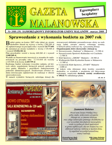 . Egzemplarz bezpłatny Nr 3/08 (19) SAMORZĄDOWY INFORMATOR GMINY MALANÓW marzec 2008 Sprawozdanie z wykonania budżetu za 2007 rok B udżet gminy na koniec 2007 roku (plan) po stronie dochodów okazał się wyższy o kwotę 1.289.309 zł od zaplanowanego na początek roku i wynosił 14.777.601 zł., natomiast po stronie wydatków o kwotę 1.729.569 zł i wynosił 15.026.361 zł. Plan przychodów wzrósł o kwotę 440.260 zł i wynosił 1.040.260 zł. Wydatki na finansowanie inwestycji w stosunku do zaplanowanych na początku roku (1.733.810 zł) wzrosły o 435.949 zł do kwoty 2.169.759 zł. Realizując budżet wykonano wszystkie zadania, od których zależy zaspokojenie bieżących potrzeb społeczeństwa gminy Malanów i prawidłowe funkcjonowanie jednostek administracyjnych. Zrealizowano również zadania inwestycyjne zaplanowane do realizacji w okresie sprawozdawczym. W ramach wydatków bieżących, udzielając dotacji dla stowarzyszeń dokładnie przeanalizowano oferty na realizację zadań, zawarto umowy wskazując terminy, w których należy rozliczyć się z przyznanej dotacji. Organizacjami, które skorzystały z dotacji są: • Stowarzyszenie ,,Nadzieja” w Malanowie – 12.500 zł. • Stowarzyszenie Sportowo-Kulturalne wsi Czachulec – 2.700 zł. • Klub Sportowy ,,GROM’’ Malanów – 28.500 zł. • Wielkopolski Klub Kyokushin Karate w Malanowie – 11.500 zł. • Uczniowski Klub Sportowy ,,START” Malanów – 2.000 zł. W trakcie roku dokonano także korekty szacunków dochodów, co wynikało z urealnienia ich faktycznego wykonania, ostatecznie dochody zostały zrealizowane w 100,42 % zakładanego planu. cd. str. 6 Szanowni Państwo Przed nami Święta Wielkiej Nocy pełne ciepła, serdeczności, przyjaźni. Dlatego też, w imieniu własnym oraz całego Samorządu Gminnego chcielibyśmy życzyć wszystkim mieszkańcom naszej gminy wielu szczęśliwych chwil spędzonych w gronie najbliższych, aby ten świąteczny czas obfitował radością i miłością w każdym domu, by napełniał wszystkich prawdziwą wiarą i nadzieją. Przewodniczący Rady Ireneusz Augustyniak Wójt Gminy Malanów Gerard Krzeszewski Konkurs plastyczny „Nasza Planeta Ziemia” W związku z ogłoszeniem roku 2008 „Światowym Rokiem Planety Ziemia” Gminna Biblioteka Publiczna zorganizowała konkurs plastyczny nawiązujący do tej tematyki i skierowany do uczniów klas IV-VI szkół podstawowych z naszej gminy. Celem konkursu było m.in. zainteresowanie dzieci naszą planetą, zarówno korzyściami, jakie z niej czerpiemy, jak i zagrożeniami stworzonymi przez człowieka. Uczestnicy mieli do wyboru dwie formy artystycznego wyrazu: tradycyjną formę malarską za pomocą farb oraz formę przestrzenną, wykonaną techniką dowolną. Zdecydowana większość uczniów wybrała formę pierwszą, ponieważ tak wykonanych prac wpłynęło łącznie 30 (ze szkół w Kotwasicach, Malanowie i Miłaczewie), a w formie przestrzennej tylko jedna. Wystawione w bibliotece prace, przy zachowaniu pełnej anonimowości, zostały przedstawione do oceny naszych czytelników, co pozwoliło na uzyskanie bardziej obiektywnej oceny. Według oceny czytelników najładniejszą i najciekawszą pracę wykonała Aleksandra Rabiega z klasy V Szkoły Podstawowej w Kotwasicach, a jej opiekunem była Teresa Klimt. Miejsce drugie zajęła Justyna Nowicka z kl. VI SP w Miłaczewie, pod opieką Beaty Górskiej , a trzecie Anna Stefaniak z klasy V SP w Malanowie, pod opieką Agnieszki Raszewskiej, a w kategorii form przestrzennych Karina Zając z Miłaczewa, również pod opieką Beaty Górskiej. Podsumowanie konkursu i wręczenie nagród odbyło się we wtorek 11 marca w siedzibie biblioteki, a nagrodzone prace zostały zakwalifikowane do etapu powiatowego, organizowanego przez Miejską i Powiatową Bibliotekę Publiczną w Turku, który zostanie rozstrzygnięty 3 kwietnia. Po rozstrzygnięciu konkursu powiatowego wybrane prace zostaną zaprezentowane na wystawie pokonkursowej. Eugeniusz Żebruń pracownik GBP w Malanowie Laureaci konkursu uroczystości było możliwe dzięki pozyskaniu przez Zarząd Koła środków w ramach konkursu dla organizacji pożytku dniu 8 marca 2008 roku w restauracji „Domal” publicznego ogłoszonego przez wójta Gminy Malanów. odbyła się uroczystość z okazji Dnia Kobiet, Karolina Jasnowska zorganizowana przez Koło Emerytów Rencistów i Inwalipracownik GCKiS dów w Malanowie. Wśród zaproszonych gości byli m.in.: Gerard Krzeszewski – wójt Gminy Malanów, Ireneusz Augustyniak – przewodniczący Rady Gminy, Krystyna Sobczak – prezes Stowarzyszenia „Nadzieja”, Grażyna Świerk – kierownik ŚDS w Miłaczewie, Marzena Kornacka oraz Małgorzata Przygońska. Uroczystość rozpoczęła się od życzeń złożonych przez przedstawicieli władz samorządowych wszystkim paniom z okazji ich święta, a następnie każda z nich została obdarowana kwiatkiem. Przyjęcie uświetnił występ dzieci z kółka teatralnego działającego przy Gminnym Centrum Kultury i Sportu w Malanowie, które przedstawiły inscenizację baśni księdza Mieczysława Malińskiego pt. „Jest taki kwiat”. Zorganizowanie tej Podczas świętowania Dzień Kobiet w kole emerytów Gazeta Malanowska W 2 Redakcja: ul. Kaliska 2 62-709 Malanów tel. 063-2883322 e-mail [email protected] Wydawca: Urząd Gminy w Malanowie oraz Gminne Centrum Kultury i Sportu w Malanowie Redaguje zespół pod kierownictwem Małgorzaty Przygońskiej Redakcja zastrzega sobie prawo dokonywania skrótów i poprawek w nadesłanych materiałach. Za treść reklam i ogłoszeń nie odpowiadamy. Dystrybucja Gazety Malanowskiej w placówkach handlowych na terenie Gminy Malanów oraz w Gminnym Centrum Kultury i Sportu w Malanowie (biblioteka). Nakład: 1000 egz. Gazeta Malanowska marzec 2008 Jak skutecznie się promować ? Na to pytanie mogliśmy sobie odpowiedzieć uczestnicząc w dniach 29 luty – 2 marca br., jako Gmina Malanów w Międzyn