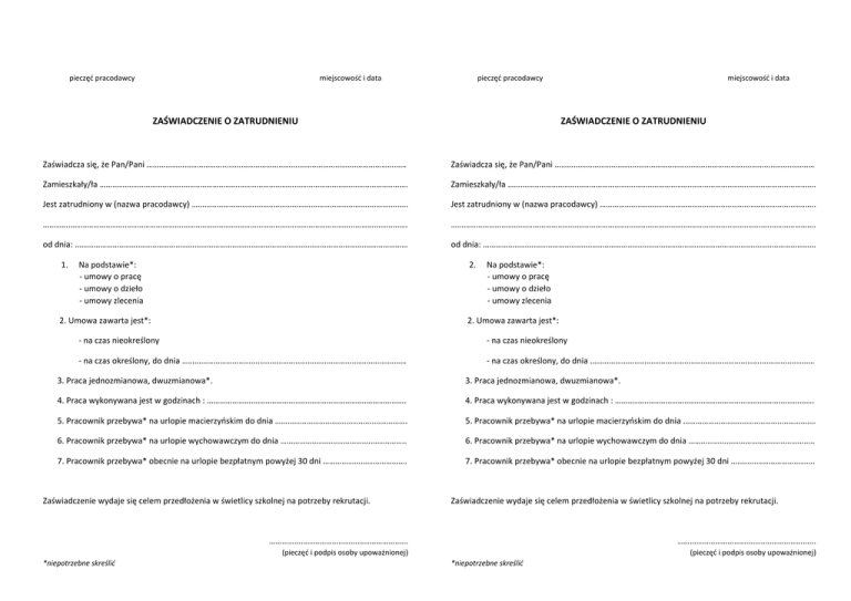 pieczęć pracodawcy miejscowość i data pieczęć pracodawcy miejscowość i data ZAŚWIADCZENIE O ZATRUDNIENIU ZAŚWIADCZENIE O ZATRUDNIENIU Zaświadcza się, że Pan/Pani ……………………………………………………………………………………….…………………… Zaświadcza się, że Pan/Pani ……………………………………………………………………………………….…………………… Zamieszkały/ła ………………………………………………………………………………………………………………………..………. Zamieszkały/ła ………………………………………………………………………………………………………………………..………. Jest zatrudniony w (nazwa pracodawcy) ………………………………………………………………………………..……….. Jest zatrudniony w (nazwa pracodawcy) ………………………………………………………………………………..……….. …………………………………………………………………………………………………………………………………..……………………. …………………………………………………………………………………………………………………………………..……………………. od dnia: …………………………………………………………………………………………………………………………………………… od dnia: …………………………………………………………………………………………………………………………………………… 1. Na podstawie*: - umowy o pracę - umowy o dzieło - umowy zlecenia 2. 2. Umowa zawarta jest*: Na podstawie*: - umowy o pracę - umowy o dzieło - umowy zlecenia 2. Umowa zawarta jest*: - na czas nieokreślony - na czas nieokreślony - na czas określony, do dnia ……………………………………………………………………….………….………… - na czas określony, do dnia ……………………………………………………………………….………….………… 3. Praca jednozmianowa, dwuzmianowa*. 3. Praca jednozmianowa, dwuzmianowa*. 4. Praca wykonywana jest w godzinach : …………………………………………………………………….……………. 4. Praca wykonywana jest w godzinach : …………………………………………………………………….……………. 5. Pracownik przebywa* na urlopie macierzyńskim do dnia ………………………………………..……………. 5. Pracownik przebywa* na urlopie macierzyńskim do dnia ………………………………………..……………. 6. Pracownik przebywa* na urlopie wychowawczym do dnia ………………………………….……………….. 6. Pracownik przebywa* na urlopie wychowawczym do dnia ………………………………….……………….. 7. Pracownik przebywa* obecnie na urlopie bezpłatnym powyżej 30 dni …………………………………. 7. Pracownik przebywa* obecnie na urlopie bezpłatnym powyżej 30 dni …………………………………. Zaświadczenie wydaje się celem przedłożenia w świetlicy szkolnej na potrzeby rekrutacji. Zaświadczenie wydaje się celem przedłożenia w świetlicy szkolnej na potrzeby rekrutacji. ………………………………………………………... ………………………………………………………... (pieczęć i podpis osoby upoważnionej) *niepotrzebne skreślić (pieczęć i podpis osoby upoważnionej) *niepotrzebne skreślić
