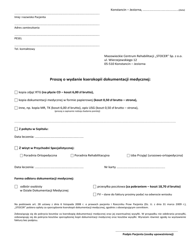 Konstancin – Jeziorna, …………………….……………………(data) ………………………………………………………………..…………………..…………..….. Imię i nazwisko Pacjenta ………………………………………………………………..…………………..…………..….. Adres zamieszkania ………………………………………………………………..…………………..…………..….. PESEL ………………………………………………………………..…………………..…………..….. Tel. kontaktowy Mazowieckie Centrum Rehabilitacji „STOCER” Sp. z o.o. ul. Wierzejewskiego 12 05-510 Konstancin – Jeziorna Proszę o wydanie kserokopii dokumentacji medycznej: ⎕ kopia zdjęć RTG (na płycie CD – koszt 6,00 zł brutto), ⎕ kopia dokumentacji medycznej w formie papierowej (koszt 0,50 zł brutto – strona), ⎕ inne, np. kopia MR, TK (koszt 6,00 zł brutto), opis USG (koszt 0,50 zł brutto – strona), (proszę o zapisanie rodzaju badania poniżej) ............................................................................................................................................................................................................................................................ ⎕ Z pobytu w Szpitalu: Data leczenia: ……………………………………………..……..….. ⎕ Z wizyt w Przychodni Specjalistycznej: ⎕ Poradnia Ortopedyczna ⎕ Poradnia Rehabilitacyjna Data leczenia: ……………………………………………..……..….. ⎕ Izba Przyjęć (urazowo-ortopedyczna) Nr karty ……………………………………………..……..….. Forma odbioru dokumentacji medycznej: ⎕ odbiór osobisty w Dziale Dokumentacji Medycznej ⎕ przesyłka pocztowa (za pobraniem – koszt 18,70 zł brutto) ⎕ FV – dane do faktury prosimy podać na odwrocie wniosku Na podstawie art. 28 ustawy z dnia 6 listopada 2008 r. o prawach pacjenta i Rzeczniku Praw Pacjenta (Dz. U. z dnia 31 marca 2009 r.), „STOCER” pobiera opłaty za sporządzenie kserokopii dokumentacji medycznej, zgodnie z obowiązującym cennikiem. Zobowiązuję się do pokrycia kosztów za kserokopię dokumentacji medycznej oraz jej ewentualnej wysyłki. W przypadku nie odebrania przesyłki, zobowiązuję się do pokrycia kosztów sporządzonej kopii dokumentacji medycznej oraz kosztów wysyłki. Wyrażam również zgodę na wystawienie faktury bez podpisu. ……………………………………………………………………….... Podpis Pacjenta (osoby upoważnionej)
