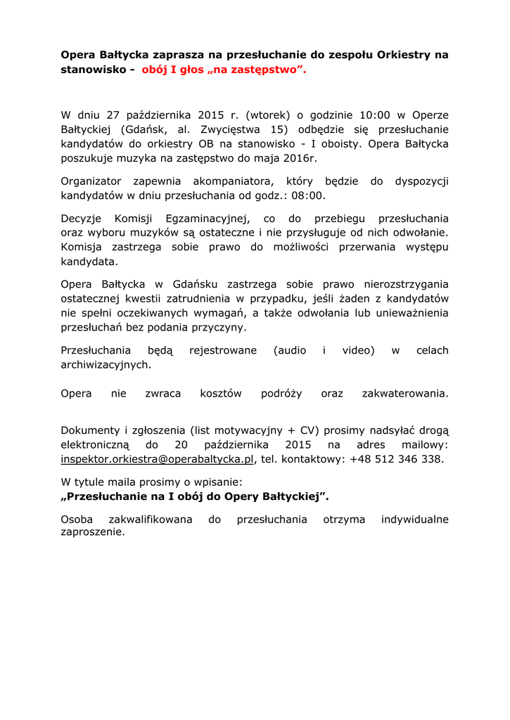 Opera Bałtycka zaprasza na przesłuchanie do zespołu Orkiestry na stanowisko - obój I głos „na zastępstwo”. W dniu 27 października 2015 r. (wtorek) o godzinie 10:00 w Operze Bałtyckiej (Gdańsk, al. Zwycięstwa 15) odbędzie się przesłuchanie kandydatów do orkiestry OB na stanowisko - I oboisty. Opera Bałtycka poszukuje muzyka na zastępstwo do maja 2016r. Organizator zapewnia akompaniatora, który będzie kandydatów w dniu przesłuchania od godz.: 08:00. do dyspozycji Decyzje Komisji Egzaminacyjnej, co do przebiegu przesłuchania oraz wyboru muzyków są ostateczne i nie przysługuje od nich odwołanie. Komisja zastrzega sobie prawo do możliwości przerwania występu kandydata. Opera Bałtycka w Gdańsku zastrzega sobie prawo nierozstrzygania ostatecznej kwestii zatrudnienia w przypadku, jeśli żaden z kandydatów nie spełni oczekiwanych wymagań, a także odwołania lub unieważnienia przesłuchań bez podania przyczyny. Przesłuchania będą archiwizacyjnych. Opera nie rejestrowane zwraca kosztów (audio podróży i video) oraz w celach zakwaterowania. Dokumenty i zgłoszenia (list motywacyjny + CV) prosimy nadsyłać drogą elektroniczną do 20 października 2015 na adres mailowy: [email protected], tel. kontaktowy: +48 512 346 338. W tytule maila prosimy o wpisanie: „Przesłuchanie na I obój do Opery Bałtyckiej”. Osoba zakwalifikowana zaproszenie. do przesłuchania otrzyma indywidualne Program przesłuchań na I obój: ETAP I (za kotarą): W. A. Mozart – Koncert na obój C-dur (KV285d) – część I i II z dowolnie wybranymi kadencjami w obu częściach; ETAP II: Studia orkiestrowe – fragmenty do przygotowania: G. Verdi – Rigoletto - Akt II nr 10. SCENA E DUETTO; G. Verdi – Otello – Akt I (od Z do 9 taktu po AA); G. Puccini – Madama Butterfly – Akt I (od początku do nr 13, nr 55); Studia orkiestrowe dla zainteresowanych osób w formacie PDF dostępne są tutaj. Przy dużej liczbie kandydatów czas trwania przesłuchań może zostać skrócony. W przypadku wyrównanego poziomu finalistów ETAPU II dopuszcza się ETAP III, czyli czynne uczestnictwo w próbie orkiestry do aktualnego repertuaru Opery Bałtyckiej. Terminy Etapu III będą ustalane indywidualnie.