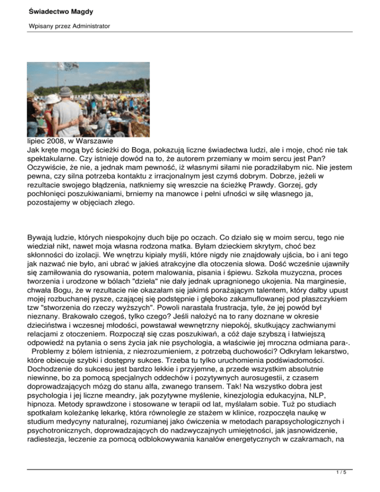 Świadectwo Magdy Wpisany przez Administrator lipiec 2008, w Warszawie Jak kręte mogą być ścieżki do Boga, pokazują liczne świadectwa ludzi, ale i moje, choć nie tak spektakularne. Czy istnieje dowód na to, że autorem przemiany w moim sercu jest Pan? Oczywiście, że nie, a jednak mam pewność, iż własnymi siłami nie poradziłabym nic. Nie jestem pewna, czy silna potrzeba kontaktu z irracjonalnym jest czymś dobrym. Dobrze, jeżeli w rezultacie swojego błądzenia, natkniemy się wreszcie na ścieżkę Prawdy. Gorzej, gdy pochłonięci poszukiwaniami, brniemy na manowce i pełni ufności w siłę własnego ja, pozostajemy w objęciach złego. Bywają ludzie, których niespokojny duch bije po oczach. Co działo się w moim sercu, tego nie wiedział nikt, nawet moja własna rodzona matka. Byłam dzieckiem skrytym, choć bez skłonności do izolacji. We wnętrzu kipiały myśli, które nigdy nie znajdowały ujścia, bo i ani tego jak nazwać nie było, ani ubrać w jakieś atrakcyjne dla otoczenia słowa. Dość wcześnie ujawniły się zamiłowania do rysowania, potem malowania, pisania i śpiewu. Szkoła muzyczna, proces tworzenia i urodzone w bólach "dzieła" nie dały jednak upragnionego ukojenia. Na marginesie, chwała Bogu, że w rezultacie nie okazałam się jakimś porażającym talentem, który dałby upust mojej rozbuchanej pysze, czającej się podstępnie i głęboko zakamuflowanej pod płaszczykiem tzw "stworzenia do rzeczy wyższych". Powoli narastała frustracja, tyle, że jej powód był nieznany. Brakowało czegoś, tylko czego? Jeśli nałożyć na to rany doznane w okresie dzieciństwa i wczesnej młodości, powstawał wewnętrzny niepokój, skutkujący zachwianymi relacjami z otoczeniem. Rozpoczął się czas poszukiwań, a cóż daje szybszą i łatwiejszą odpowiedź na pytania o sens życia jak nie psychologia, a właściwie jej mroczna odmiana para-. Problemy z bólem istnienia, z niezrozumieniem, z potrzebą duchowości? Odkryłam lekarstwo, które obiecuje szybki i dostępny sukces. Trzeba tu tylko uruchomienia podświadomości. Dochodzenie do sukcesu jest bardzo lekkie i przyjemne, a przede wszystkim absolutnie niewinne, bo za pomocą specjalnych oddechów i pozytywnych aurosugestii, z czasem doprowadzających mózg do stanu alfa, zwanego transem. Tak! Na wszystko dobra jest psychologia i jej liczne meandry, jak pozytywne myślenie, kinezjologia edukacyjna, NLP, hipnoza. Metody sprawdzone i stosowane w terapii od lat, myślałam sobie. Tuż po studiach spotkałam koleżankę lekarkę, która równolegle ze stażem w klinice, rozpoczęła naukę w studium medycyny naturalnej, rozumianej jako ćwiczenia w metodach parapsychologicznych i psychotronicznych, doprowadzających do nadzwyczajnych umiejętności, jak jasnowidzenie, radiestezja, leczenie za pomocą odblokowywania kanałów energetycznych w czakramach, na 1/5 Świadectwo Magdy Wpisany przez Administrator bazie filozofii i medycyny wschodniej. Cóż za kompleksowe podejście do choroby, co za dalekowzroczność w podejściu do człowieka i jego duszy, zachwycałam się. Koleżanka studiowała namiętnie, wytrwale płacąc ze swej skromnej pensyjki za słone czesne i liczne niezbędne podręczniki. Mimo wspólnych tematów i zainteresowań, widywałyśmy się coraz rzadziej. Nie tylko ze mną traciła kontakt. Narastająca niechęć do ludzi dotyczyła całego jej środowiska, w tym rodziny. Zamiast kwitnąć światłem silnego własnego ja, ona gasła, a tuż przed moim wyjazdem nie uśmiechała się już wcale. Wymieniłyśmy parę kartek, na kolejne listy nie odpisała. Dziś, ze zgrozą patrzę, że nie dało mi to do myślenia nic. Wktótce zmarł mój kumpel ze studiów, kumpel a raczej obiekt mojej fascynacji, skończył bowiem kurs Silvy. Oryginalny sposób bycia, głębokie widzenie rzeczywistości i jakiś romantyczny smutek w oczach. Uzdrowienie jest możliwe zawsze, trzeba w tym celu uruchomić pokłady własnych możliwości! Szkoda chłopaka, chyba nie uruchomił, skoro umarł na rozsianego chłoniaka. Dalej nic, w sercu czułam ucisk, ale moja dedukcja niczego nie wyczaiła. Żadnego niepokoju intelektualnego, tylko głupie serce, w którym coś kłuje czasem. Tarot wymalowany własnoręcznie i liczne lektury okultystyczne, coraz grubszego kalibru, przeczytałam nawet podręcznik do czarnej magii, tylko zastosować w praktyce nie odważyłam się, bo czułam gdzieś w głębi, że Bogu się to nie spodoba, a poza tym nie czyń drugiemu, co tobie nie miłe itd itp. Mimo wytrwałych ćwiczeń relaksacyjnych z fajnymi transami, nie zauważyłam nic, poza chwilowym rozluźnieniem mięśni i nadzwyczajnym stanem świadomości. Nie zauważyłam też narastających powoli tendencji do wybuchów złości, biernej agresji. Z powodu narastającego lęku o przyszłość rozpoczęłam wizyty u wróżek, w tym tarocistki z rozwalonym życiem i karcianej przyjaciółki Boga. Kiedy zaczęły się nasilać okresy depresji i wyostrzać objawy lęku, zaczęłam zastanawiać się nad wizytą u psychiatry. Zapisałam się nawet, rezygnując w końcu z powodu obawy przed psychotropami, silnie upośledzającymi sprawności poznawcze umysłu, którego przecież używam w pracy. Zerwane zaręczyny, burzliwy kolejny związek i widoczna dla otoczenia nieadekwatność zachowań, zaniepokoiła chyba moją koleżankę, katoliczkę praktykującą, czyli tzw.nawiedzoną, bo dała mi ulotkę o katechezach neokatechumenalnych. Poszłam kilka razy, dziwiąc się otwartości tamtych ludzi, ich podejrzanej radości i spokojowi, widzianemu w oczach i gestach. Tam poraz pierwszy od 6 lat poszłam do spowiedzi, po której miałam niespokojną noc, obfitującą w lodowate dreszcze z powodu uczucia nieustannie ściąganej ze mnie kołdry. Wtedy zaczęłam się domyślać co jest, kto to taki upomina się o mnie po zawodzie, jaki sprawiłam mu idąc do świętej spowiedzi. Żwawo ruszyłam na kolejne spotkanie, ale ziarno