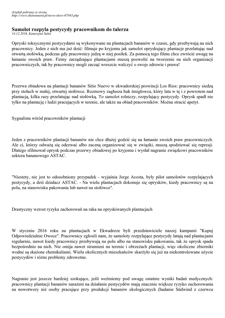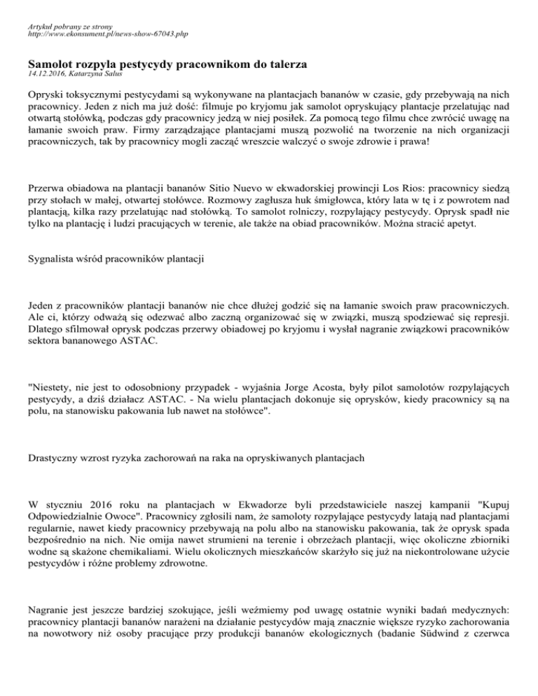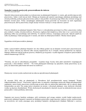 Artykuł pobrany ze strony http://www.ekonsument.pl/news-show-67043.php Samolot rozpyla pestycydy pracownikom do talerza 14.12.2016, Katarzyna Salus Opryski toksycznymi pestycydami są wykonywane na plantacjach bananów w czasie, gdy przebywają na nich pracownicy. Jeden z nich ma już dość: filmuje po kryjomu jak samolot opryskujący plantacje przelatując nad otwartą stołówką, podczas gdy pracownicy jedzą w niej posiłek. Za pomocą tego filmu chce zwrócić uwagę na łamanie swoich praw. Firmy zarządzające plantacjami muszą pozwolić na tworzenie na nich organizacji pracowniczych, tak by pracownicy mogli zacząć wreszcie walczyć o swoje zdrowie i prawa! Przerwa obiadowa na plantacji bananów Sitio Nuevo w ekwadorskiej prowincji Los Rios: pracownicy siedzą przy stołach w małej, otwartej stołówce. Rozmowy zagłusza huk śmigłowca, który lata w tę i z powrotem nad plantacją, kilka razy przelatując nad stołówką. To samolot rolniczy, rozpylający pestycydy. Oprysk spadł nie tylko na plantację i ludzi pracujących w terenie, ale także na obiad pracowników. Można stracić apetyt. Sygnalista wśród pracowników plantacji Jeden z pracowników plantacji bananów nie chce dłużej godzić się na łamanie swoich praw pracowniczych. Ale ci, którzy odważą się odezwać albo zaczną organizować się w związki, muszą spodziewać się represji. Dlatego sfilmował oprysk podczas przerwy obiadowej po kryjomu i wysłał nagranie związkowi pracowników sektora bananowego ASTAC. "Niestety, nie jest to odosobniony przypadek - wyjaśnia Jorge Acosta, były pilot samolotów rozpylających pestycydy, a dziś działacz ASTAC. - Na wielu plantacjach dokonuje się oprysków, kiedy pracownicy są na polu, na stanowisku pakowania lub nawet na stołówce". Drastyczny wzrost ryzyka zachorowań na raka na opryskiwanych plantacjach W styczniu 2016 roku na plantacjach w Ekwadorze byli przedstawiciele naszej kampanii "Kupuj Odpowiedzialnie Owoce". Pracownicy zgłosili nam, że samoloty rozpylające pestycydy latają nad plantacjami regularnie, nawet kiedy pracownicy przebywają na polu albo na stanowisku pakowania, tak że oprysk spada bezpośrednio na nich. Nie omija nawet strumieni na terenie i obrzeżach plantacji, więc okoliczne zbiorniki wodne są skażone chemikaliami. Wielu okolicznych mieszkańców skarżyło się już na niekontrolowane użycie pestycydów i różne problemy zdrowotne. Nagranie jest jeszcze bardziej szokujące, jeśli weźmiemy pod uwagę ostatnie wyniki badań medycznych: pracownicy plantacji bananów narażeni na działanie pestycydów mają znacznie większe ryzyko zachorowania na nowotwory niż osoby pracujące przy produkcji bananów ekologicznych (badanie Südwind z czerwca 2016). Certyfikaty niewiele pomagają, jeśli nie ma organizacji pracowniczych Sitio Nuevo należy do ekwadorskiej firmy Manobal, która prowadzi kilkanaście plantacji bananów. Wszystkie do niedawna miały certyfikaty Rainforest Alliance i GlobalGAP. Przesłaliśmy dowody w postaci nagranego filmu wraz z odpowiednimi informacjami do Rainforest Alliance i GlobalGAP. Rainforest Alliance zawiadomiło nas o cofnięciu certyfikatu w czerwcu (po opublikowaniu przez Oxfam badania "Sweet fruits, bitter truth"). GlobalGAP także poinformował, że Manobal nie ma już jego certyfikatu od lata 2016 roku. Pracownicy plantacji twierdzą, że ostatnio plantację odwiedziła osoba z firmy certyfikującej, która przeprowadza audyty dla Rainforest Alliance. Tymczasem Manobal nadal chwili się oboma certyfikatami na swojej stronie internetowej. Aby poprawić sytuację na plantacjach, nie można polegać jedynie na zapowiedzianych z wyprzedzeniem wizytach audytorów zewnętrznych, twierdzi Jorge Acosta: "Ten przykład raz jeszcze pokazuje, że efektywna certyfikacja jest możliwa tylko przy udziale pracowników i lokalnych związków zawodowych".