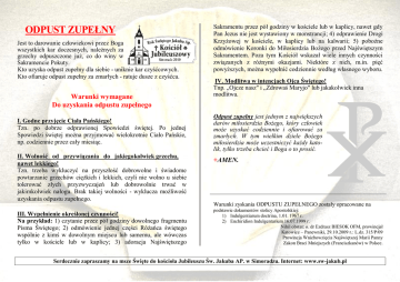 ODPUST ZUPEŁNY Jest to darowanie człowiekowi przez Boga wszystkich kar doczesnych, należnych za grzechy odpuszczone już, co do winy w Sakramencie Pokuty. Kto uzyska odpust zupełny dla siebie - uniknie kar czyśćcowych. Kto ofiaruje odpust zupełny za zmarłych - ratuje dusze z czyśćca. Warunki wymagane Do uzyskania odpustu zupełnego I. Godne przyjęcie Ciała Pańskiego! Tzn. po dobrze odprawionej Spowiedzi świętej. Po jednej Spowiedzi świętej można przyjmować wielokrotnie Ciało Pańskie, np. codziennie przez cały miesiąc. II. Wolność od przywiązania do jakiegokolwiek grzechu, nawet lekkiego! Tzn. trzeba wykluczyć na przyszłość dobrowolne i świadome powtarzanie grzechów ciężkich i lekkich, czyli nie wolno u siebie tolerować złych przyzwyczajeń lub dobrowolnie trwać w jakimkolwiek nałogu. Brak takiej wolności - wyklucza możliwość uzyskania odpustu zupełnego. III. Wypełnienie określonej czynności! Na przykład: 1) czytanie przez pół godziny dowolnego fragmentu Pisma Świętego; 2) odmówienie jednej części Różańca świętego wspólnie z kimś w dowolnym miejscu lub samemu, ale wówczas tylko w kościele lub w kaplicy; 3) adoracja Najświętszego Sakramentu przez pół godziny w kościele lub w kaplicy, nawet gdy Pan Jezus nie jest wystawiony w monstrancji; 4) odprawienie Drogi Krzyżowej w kościele, w kaplicy lub na kalwarii; 5) pobożne odmówienie Koronki do Miłosierdzia Bożego przed Najświętszym Sakramentem. Poza tym Kościół wskazał wiele innych czynności związanych z różnymi okazjami. Niektóre z nich, m.in. pięć powyższych, można wypełnić codziennie według własnego wyboru. IV. Modlitwa w intencjach Ojca Świętego! Tnp. „Ojcze nasz" i „Zdrowaś Maryjo" lub jakakolwiek inna modlitwa. Odpust zupełny jest jednym z największych darów miłosierdzia Bożego, który człowiek może uzyskać codziennie i ofiarować za zmarłych. W tym wielkim dziele Bożego miłosierdzia może uczestniczyć każdy katolik, tylko trzeba chcieć i Boga o to prosić. +AMEN. Warunki zyskania ODPUSTU ZUPEŁNEGO zostały opracowane na podstawie dokumentów stolicy Apostolskiej: 1) Indulgentiarum doctrina, 1.01. 1967 r. 2) Enchiridion Indulgentarium 16.07.1999 r. Nihil obstat: o. dr Ezdrasz BIESOK OFM, prowincjał Katowice – Panewniki, 29.10.2009 r.: L.dz. 315/P/09 Prowincja Wniebowzięcia Najświętszej Marii Panny Zakon Braci Mniejszych (Franciszkanów) w Polsce. Serdecznie zapraszamy na msze Święte do kościoła Jubileuszu Św. Jakuba AP. w Simoradzu. Internet: www.sw-jakub.pl