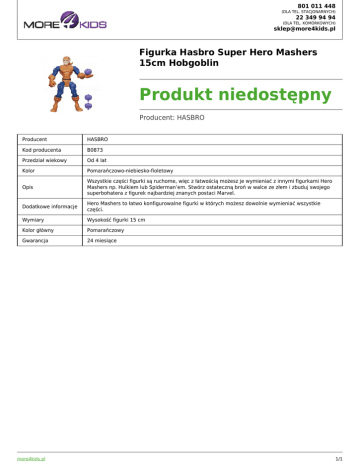 801 011 448 (DLA TEL. STACJONARNYCH) 22 349 94 94 (DLA TEL. KOMÓRKOWYCH) [email protected] Figurka Hasbro Super Hero Mashers 15cm Hobgoblin Produkt niedostępny Producent: HASBRO Producent HASBRO Kod producenta B0873 Przedział wiekowy Od 4 lat Kolor Pomarańczowo-niebiesko-fioletowy Opis Wszystkie części figurki są ruchome, więc z łatwością możesz je wymieniać z innymi figurkami Hero Mashers np. Hulkiem lub Spiderman’em. Stwórz ostateczną broń w walce ze złem i zbuduj swojego superbohatera z figurek najbardziej znanych postaci Marvel. Dodatkowe informacje Hero Mashers to łatwo konfigurowalne figurki w których możesz dowolnie wymieniać wszystkie części. Wymiary Wysokość figurki 15 cm Kolor główny Pomarańczowy Gwarancja 24 miesiące more4kids.pl 1/1