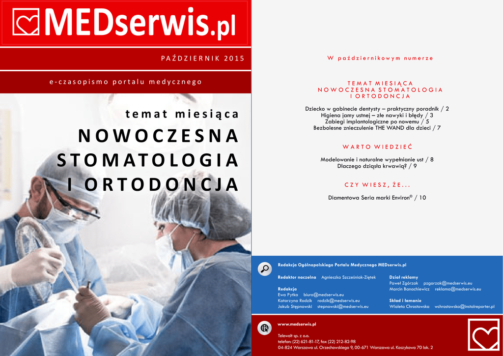 MEDserwis.pl pa ź d z i e r n i k 2015 W październikowym numerze e-czasopismo portalu medycznego temat miesiąca Nowoczesna s t o m at o l o g i a i ortodoncja TEMAT MIESIĄCA Nowoczesna stomatologia i ortodoncja Dziecko w gabinecie dentysty – praktyczny poradnik / 2 Higiena jamy ustnej – złe nawyki i błędy / 3 Zabiegi implantologiczne po nowemu / 5 Bezbolesne znieczulenie THE WAND dla dzieci / 7 Warto wiedzieć Modelowanie i naturalne wypełnianie ust / 8 Dlaczego dziąsła krwawią? / 9 Czy wiesz, że... Diamentowa Seria marki Environ® / 10 Redakcja Ogólnopolskiego Portalu Medycznego MEDserwis.pl Redaktor naczelna Agnieszka Szcześniak-Ziętek Redakcja Ewa Pytka [email protected] Katarzyna Rodzik [email protected] Jakub Stępnowski [email protected] Dział reklamy Paweł Zgórzak [email protected] Marcin Banachiewicz [email protected] Skład i łamanie Wioleta Chrostowska www.medserwis.pl Telewolt sp. z o.o. telefon: (22) 621-81-17, fax (22) 212-82-98 04-824 Warszawa ul. Orzechowskiego 9, 00-671 Warszawa ul. Koszykowa 70 lok. 2 [email protected] T EM AT MEDserwis.pl MIESI ĄC A Dziecko w gabinecie dentysty – praktyczny poradnik październik 2015 ne są co trzy-cztery miesiące. To częściej niż u dorosłych, ponieważ próchnica w zębach mlecznych rozwija się dużo szybciej. Rodzice muszą zachować czujność i zwracać uwagę na wszelkiego rodzaju przebarwienia szkliwa, ubytki i zmiany na błonie śluzowej. W przypadku wątpliwości, zawsze warto zasięgnąć porady lekarza. Po pojawieniu się „szóstek” (pierwszych stałych zębów trzono- Just yna Ma s i or wych) należy zgłosić się natychmiast do gabinetu w celu zabezpieczenia ich przed próchnicą. Dentysta przeprowadza lakowanie Jak przekonać dziecko do leczenia zębów? (uszczelnienie bruzd lakiem szczelinowym). Kiedy należy zaplanować pierwszą wizytę u stomatologa? To spotkanie zadecyduje Leczenie o stosunku do tego specjalisty w całym doro- Zdarza się, że już u dwu- lub trzylatków po- słym życiu. Wystarczy pamiętać o kilku pro- jawiają się pierwsze ubytki. Wówczas denty- stych poradach, a bolesna konieczność stanie sta podejmuje próbę leczenia. Jeżeli próch- się przyjemnym obowiązkiem. nica obejmuje zęby przednie lub gdy dziecko – Wielu rodziców nie zdaje sobie sprawy, że jest jeszcze za małe, stosuje impregnację – higienę jamy ustnej należy rozpocząć tuż po bezbolesny zabieg polegający na „malowa- urodzeniu – przyznaje Justyna Masior, lekarz niu” 40-procentowym azotanem srebra i wy- stomatolog w warszawskiej Klinice Demeter. trącaniu jonów srebra na powierzchniach Najlepiej zrobić to nawiniętym na palec ste- dotkniętych próchnicą. Jest to działanie bak- rylnym gazikiem, zamoczonym w przegoto- teriobójcze, hamujące i ograniczające rozwój wanej wodzie. Masując dziąsła, przyzwycza- próchnicy. Czynności te wykonuje się trzy jamy jednocześnie dziecko do ingerencji razy w odstępach tygodniowych, następnie w jamie ustnej. W ten sposób czyścimy rów- wspólnego mycia przed lustrem przez całą nelem, „liczy ząbki”, a na samym końcu prze- systematycznie powtarza raz na jakiś czas. nież pierwsze zęby mleczne. Można zastoso- rodzinę. Dziecko chętnie naśladuje wówczas prowadza fluoryzację – tłumaczy ekspert. – U dzieci starszych (trzy-, czteroletnich) po- wać też specjalny krążek w formie gryzacz- rodziców i rodzeństwo. – Trzeba jednak mu Zabieg ten polega na pokryciu zębów spe- dejmujemy próbę leczenia – wcześniej spo- ka (zakończonego sylikonowym włosiem) lub trochę pomóc. Maluchy do 7-8 roku życia nie cjalnym preparatem z fluorem, dzięki czemu kojnie opisujemy i wyjaśniamy po kolei czyn- szczoteczkę nakładaną na palec. Z czasem są w stanie samodzielnie prawidłowo umyć szkliwo jest mocniejsze i zabezpieczone przed ności, które wykonujemy. Przy płytkich wprowadzamy zwykłą szczoteczkę i pasty dla zębów – tłumaczy ekspertka Kliniki Demeter. działaniem bakterii i kwasów. Procedura jest ubytkach leczenie jest najczęściej bezbole- bezpieczna, bezbolesna i przyjemna. Jest to sne. Natomiast przy głębokich możemy po- dzieci wieku do 2 lat. – Trzeba przyzwyczaić pociechę do codzien- Pierwszy raz tzw. „wizyta adaptacyjna”. Przed pierwszym dać tak zwanego „komarka” – znieczulenie nego mycia zębów. Robimy to przynajmniej Pierwsza wizyta u stomatologa? – Najwięk- spotkaniem nie można mówić dziecku „Nie miejscowe, podane bardzo cienką i krótką rano (po śniadaniu) i wieczorem (po ostatnim szym błędem jest czekanie na pierwsze ubyt- bój się, to nie będzie bolało”. Maluch zwraca igłą w okolicy leczonego zęba. W przypad- posiłku). Musimy być konsekwentni, systema- ki. Najlepiej pójść do dentysty profilaktycznie uwagę na pojedyncze słowa, w tym przypad- ku maluchów nadpobudliwych, trudnych, bo- tyczni i cierpliwi. Dzięki temu dziecko potrak- w 2-3 roku życia. Stomatolog przeprowadza ku na „ból” i „strach”. Wpływa to negatywnie jących się, proponowana jest sadacja wziew- tuje to jako naturalną czynność. wówczas drobne zabiegi, bezstresowo oswa- na jego nastawienie. Jeśli nie ma niczego nie- na, czyli tak zwany gaz rozweselający. Jest Dr Justyna Masior zachęca do wprowadzenia ja i zapoznaje malucha z gabinetem i perso- pokojącego rodziców, kolejne wizyty wskaza- to mieszanina tlenu i podtlenku azotu, dzia- 2 T EM AT MEDserwis.pl MIESI ĄC A ćwiczy jej zakładanie. Sam zabieg jest bezbolesny, bezpieczny i umożliwia spokojne, bezstresowe leczenie – zapewnia dr Justyna Masior. Wybierając stomatologa, warto się zorientować, czy ma w swojej ofercie taką usługę. Odwrócenie uwagi październik 2015 Higiena jamy ustnej – złe nawyki i błędy Dentyści starają się zachęcić najmłodszych na różne sposoby. – Mamy fotel w kształcie dinozaura, kolorowe ściany, a w poczekal- E w a Pa j ą k- Ły s e k ni zaaranżowaliśmy