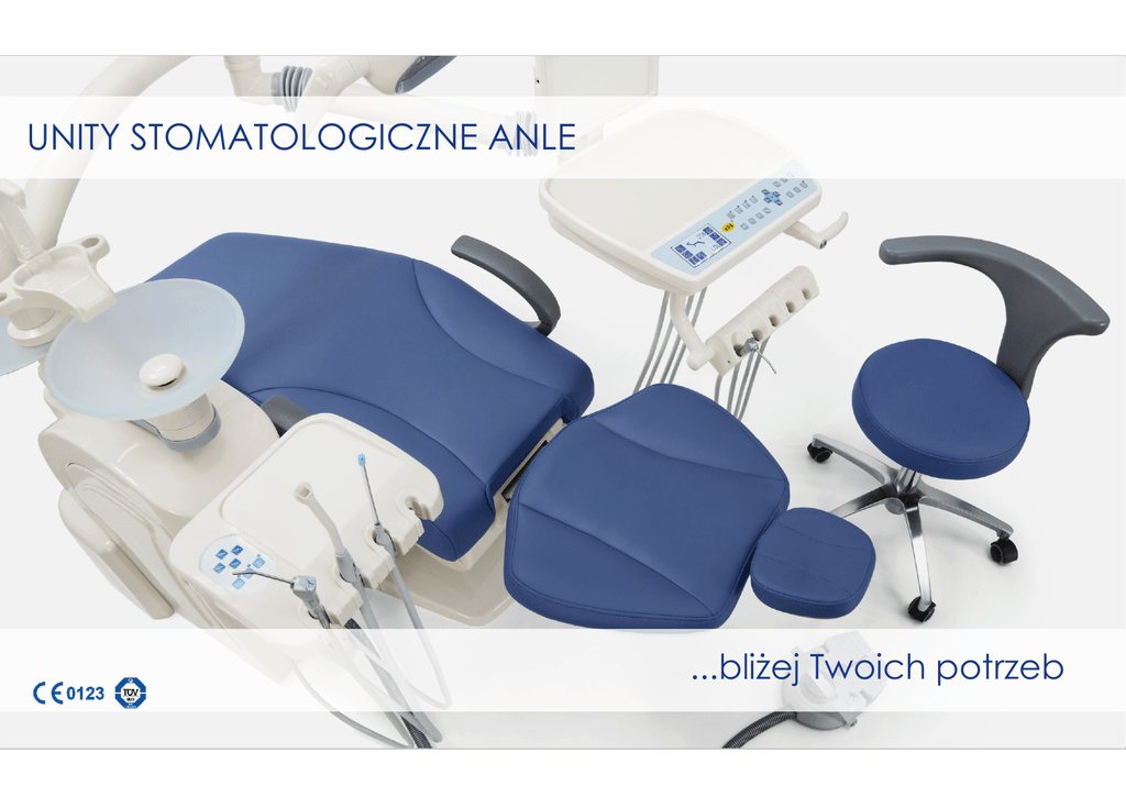 UNITY STOMATOLOGICZNE ANLE ...bli¿ej Twoich potrzeb UNITY STOMATOLOGICZNE ANLE Ergonomiczny fotel stomatologiczny • bezszwowa tapicerka dostêpna w oœmiu kolorach (opcjonalnie do wyboru tapicerka skórzana ze szwem) • 11 pozycji pamiêci, w tym pozycja „spluwaczkowa” i pozycja „zerowa” • zsynchronizowany ruch oparcia i siedziska fotela • cichy i niezawodny napêd elektromechaniczny dziêki si³ownikom duñskiej firmy Linak • mo¿liwoœæ sterowania fotelem ze stolika lekarza, z panelu asysty lub sterownikiem no¿nym • zag³ówek chirurgiczny • dwa pod³okietniki, w tym prawy odchylany • wy³¹cznik g³ówny odcinaj¹cy wodê, powietrze oraz pr¹d elektryczny • blokada fotela podczas pracy koñcówek Stolik lekarza • piêæ górnych lub dolnych (opcja) rêkawów silikonowych • wyposa¿enie standardowe: - trójdro¿na dmuchawka, - skaler piezoelektryczny Woodpecker, - trzy rêkawy pneumatyczne (w tym dwa ze œwiat³em), - koñcówki NSK: mikrosilnik pneumatyczny FX-205m, k¹tnica FX25m, turbina Pana-Max 2 • ramiê pantograficzne z hamulcem pneumatycznym umo¿liwia pewne prowadzenie, ustawienie i blokadê stolika w ustalonej pozycji • zbiorniczek na zu¿yty olej • panel sterowania wszystkimi funkcjami fotela i unitu • du¿a, obrotowa taca na narzêdzia wykonana ze stali nierdzewnej (stolik z górnymi rêkawami) • diodowy negatoskop • manometr wskazuj¹cy ciœnienie pracy koñcówek • indywidualna regulacja sprayu dla ka¿dej koñcówki • podk³adka silikonowa pod narzêdzia • mo¿liwoœæ dowolnej konfiguracji wyposa¿enia ...bli¿ej Twoich potrzeb Blok spluwaczki • obrotowa miska spluwaczki wykonana z hartowanego szk³a • odchylany blok spluwaczki • nape³nianie kubka automatycznie odmierzon¹ porcj¹ wody • sp³ukiwanie miski i nape³nianie kubka sterowane z pulpitu na stoliku lekarza, z panelu asysty lub sterownikiem no¿nym • zamkniêty obieg wody destylowanej • dodatkowa butelka na œrodek do dezynfekcji rêkawów • podgrzewanie wody do kubka Halogenowa lampa operacyjna • dwustopniowa regulacja natê¿enia œwiat³a • za³¹czanie lampy manualne lub za pomoc¹ czujnika ruchu • standardowa ¿arówka halogenowa • natê¿enie œwiat³a 25.000 lux 4 diodowa lampa operacyjna • p³ynna regulacja natê¿enia œwiat³a • za³¹czanie lampy za pomoc¹ sensora ruchu Panel asysty • konsola zamocowana na obrotowym ramieniu • sterowanie ruchami fotela oraz nape³nianiem kubka i sp³ukiwaniem miski • œlinoci¹g wodny • ssak powietrzny zasilany z kompresora • trójdro¿na dmuchawka • diodowa lampa polimeryzacyjna 10 diodowa lampa operacyjna • p³ynna regulacja natê¿enia œwiat³a • za³¹czanie lampy za pomoc¹ sensora ruchu Sterownik no¿ny Zag³ówek chirurgiczny • dwuprzegubowy zag³ówek pozwala na optymalne ustawienie g³owy pacjenta • wielofunkcyjny sterownik no¿ny umo¿liwia sterowanie fotelem, prac¹ koñcówek, uruchamia nape³nianie kubka i sp³ukiwanie miski spluwaczki • sterownik posiada funkcjê przedmuchu koñcówek, tzw. „chip-blower” UNITY STOMATOLOGICZNE ANLE Nowoczesny design, funkcjonalna konstrukcja Stabilna konstrukcja unitu z fotelem zawieszanym na bloku spluwaczki oraz ergonomiczne, ruchome ramiê z dolnymi rêkawami zapewnia lekarzowi wysoki komfort pracy. obrotowa miska spluwaczki wbudowany pojemnik na chusteczki Wyposa¿enie standardowe: • trójdro¿na dmuchawka • skaler piezoelektryczny • 3 rêkawy pneumatyczne (w tym dwa ze œwiat³em) • koñcówki NSK • diodowa lampa polimeryzacyjna • kamera wewn¹trzustna • monitor AL-388SA Stolik lekarza z elektronicznym wyœwietlaczem LCD i negatoskopem do zdjêæ panoramicznych. mo¿liwa dowolna konfiguracja wyposa¿enia unitu ...bli¿ej Twoich potrzeb Uniwersalny i praktyczny unit dla ka¿dego lekarza Obrotowo zamontowane ramiona stolika lekarza i bloku spluwaczki umo¿liwiaj¹ komfortow¹ pracê lekarzom prawo- i leworêcznym oraz zapewniaj¹ ³atwy dostêp do pacjenta lekarzowi i asyœcie. obrotowa miska spluwaczki mo¿liwoœæ obrotu stolika lekarza o 180° mo¿liwoœæ obrotu bloku spluwaczki o 180° Wyposa¿enie standardowe: • trójdro¿na dmuchawka • skaler piezoelektryczny • 3 rêkawy pneumatyczne (w tym dwa ze œwiat³em) • koñcówki NSK • diodowa lampa polimeryzacyjna • kamera wewn¹trzustna • monitor AL-388SB Doskonale sprawdza siê w gabinetach, w których z unitu korzysta wielu lekarzy. mo¿liwa dowolna konfiguracja wyposa¿enia unitu UNITY STOMATOLOGICZNE ANLE Optymalna funkcjonalnoœæ, nowoczesny wygl¹d Ergonomiczna konstrukcja, funkcjolanoœæ oraz doskona³y stosunek jakoœci do ceny sprawia, ¿e jest to najczêœciej wybierany przez lekarzy model unitu. miska spluwaczki i pó³ka wykonane z hartowanego, barwionego szk³a dostêpne kolory: przezroczysty, zielony, niebieski, br¹zowy Wyposa¿enie standardowe: • trójdro¿na dmuchawka • skaler piezoelektryczny • 3 rêkawy pneumatyczne (w tym dwa ze œwiat³em) • koñcówki NSK • diodowa lampa polimeryzacyjna • kamera wewn¹trzustna • monitor AL-398HG Stolik lekarza wyposa¿ony w piêciostopniowy mechanizm blokady rêkawów. mo¿liwa dowolna konfiguracja wyposa¿enia unitu ...bli¿ej Twoich potrzeb Doskona³a ergonomia, prosta konstrukcja, ekonomiczne rozwi¹zanie Prosta, ergonomiczna budowa zapewnia komfort pracy lekarza i doskona³y dostêp do pacjenta. G³adkie powierzchnie stolika lekarza i bloku spluwaczki u³atwiaj¹ zachowanie higieny w gabinecie. nieruchomy blok spluwaczki Dwa programy pamiêci fotela: • pozycja "zerowa" • pozycja Trendelenburga Wyposa¿enie standardowe: • trójdro¿na dmuchawka • skaler piezoelektryczny • 3 rêkawy pneumatyczne (w tym dwa ze œwiat³em) • koñcówki NSK • diodowa lampa polimeryzacyjna • kamera wewn¹trzustna • monitor AL-398AA mo¿liwa dowolna konfiguracja wyposa¿enia unitu Kompresor bezolejowy Fotelik dla lekarza • wydajnoœæ: 100 litrów / min. • zbiornik
