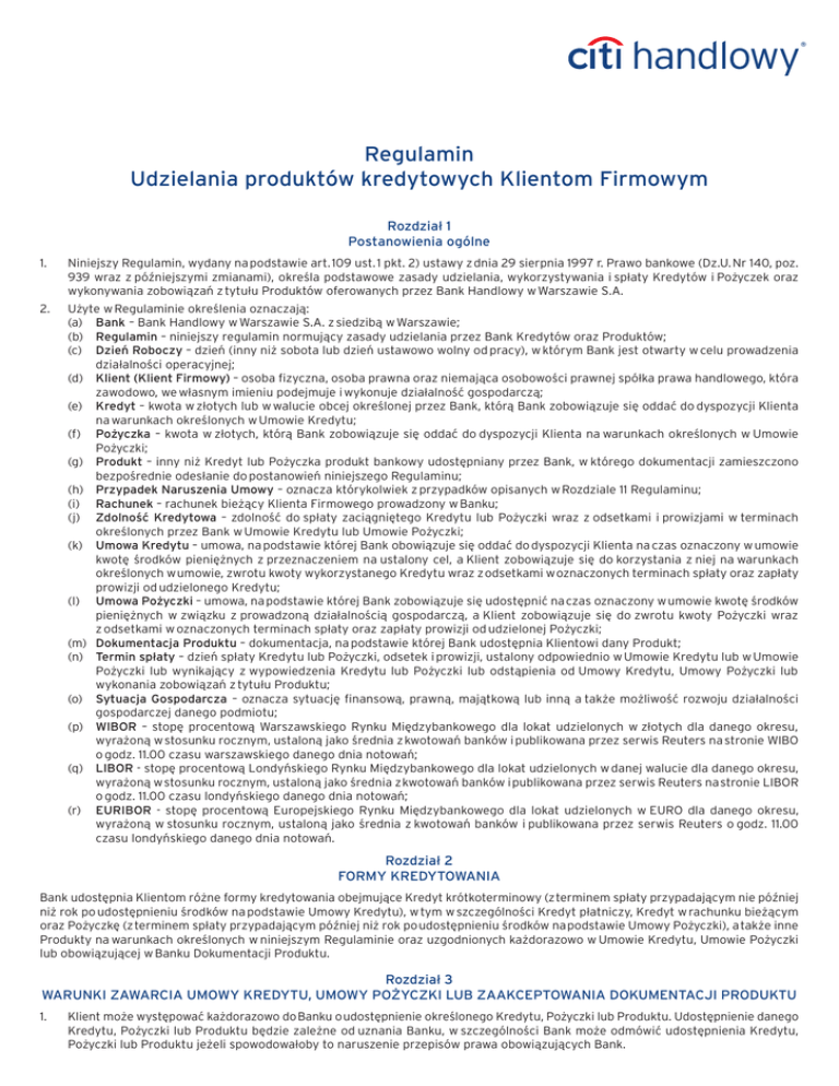Regulamin Udzielania produktów kredytowych Klientom Firmowym Rozdział 1 Postanowienia ogólne 1. Niniejszy Regulamin, wydany na podstawie art. 109 ust. 1 pkt. 2) ustawy z dnia 29 sierpnia 1997 r. Prawo bankowe (Dz.U. Nr 140, poz. 939 wraz z późniejszymi zmianami), określa podstawowe zasady udzielania, wykorzystywania i spłaty Kredytów i Pożyczek oraz wykonywania zobowiązań z tytułu Produktów oferowanych przez Bank Handlowy w Warszawie S.A. 2. Użyte w Regulaminie określenia oznaczają: (a) Bank – Bank Handlowy w Warszawie S.A. z siedzibą w Warszawie; (b) Regulamin – niniejszy regulamin normujący zasady udzielania przez Bank Kredytów oraz Produktów; (c) Dzień Roboczy – dzień (inny niż sobota lub dzień ustawowo wolny od pracy), w którym Bank jest otwarty w celu prowadzenia działalności operacyjnej; (d) Klient (Klient Firmowy) – osoba fizyczna, osoba prawna oraz niemająca osobowości prawnej spółka prawa handlowego, która zawodowo, we własnym imieniu podejmuje i wykonuje działalność gospodarczą; (e) Kredyt – kwota w złotych lub w walucie obcej określonej przez Bank, którą Bank zobowiązuje się oddać do dyspozycji Klienta na warunkach określonych w Umowie Kredytu; (f) Pożyczka – kwota w złotych, którą Bank zobowiązuje się oddać do dyspozycji Klienta na warunkach określonych w Umowie Pożyczki; (g) Produkt – inny niż Kredyt lub Pożyczka produkt bankowy udostępniany przez Bank, w którego dokumentacji zamieszczono bezpośrednie odesłanie do postanowień niniejszego Regulaminu; (h) Przypadek Naruszenia Umowy – oznacza którykolwiek z przypadków opisanych w Rozdziale 11 Regulaminu; (i) Rachunek – rachunek bieżący Klienta Firmowego prowadzony w Banku; (j) Zdolność Kredytowa – zdolność do spłaty zaciągniętego Kredytu lub Pożyczki wraz z odsetkami i prowizjami w terminach określonych przez Bank w Umowie Kredytu lub Umowie Pożyczki; (k) Umowa Kredytu – umowa, na podstawie której Bank obowiązuje się oddać do dyspozycji Klienta na czas oznaczony w umowie kwotę środków pieniężnych z przeznaczeniem na ustalony cel, a Klient zobowiązuje się do korzystania z niej na warunkach określonych w umowie, zwrotu kwoty wykorzystanego Kredytu wraz z odsetkami w oznaczonych terminach spłaty oraz zapłaty prowizji od udzielonego Kredytu; (l) Umowa Pożyczki – umowa, na podstawie której Bank zobowiązuje się udostępnić na czas oznaczony w umowie kwotę środków pieniężnych w związku z prowadzoną działalnością gospodarczą, a Klient zobowiązuje się do zwrotu kwoty Pożyczki wraz z odsetkami w oznaczonych terminach spłaty oraz zapłaty prowizji od udzielonej Pożyczki; (m) Dokumentacja Produktu – dokumentacja, na podstawie której Bank udostępnia Klientowi dany Produkt; (n) Termin spłaty – dzień spłaty Kredytu lub Pożyczki, odsetek i prowizji, ustalony odpowiednio w Umowie Kredytu lub w Umowie Pożyczki lub wynikający z wypowiedzenia Kredytu lub Pożyczki lub odstąpienia od Umowy Kredytu, Umowy Pożyczki lub wykonania zobowiązań z tytułu Produktu; (o) Sytuacja Gospodarcza – oznacza sytuację finansową, prawną, majątkową lub inną a także możliwość rozwoju działalności gospodarczej danego podmiotu; (p) WIBOR – stopę procentową Warszawskiego Rynku Międzybankowego dla lokat udzielonych w złotych dla danego okresu, wyrażoną w stosunku rocznym, ustaloną jako średnia z kwotowań banków i publikowana przez serwis Reuters na stronie WIBO o godz. 11.00 czasu warszawskiego danego dnia notowań; (q) LIBOR - stopę procentową Londyńskiego Rynku Międzybankowego dla lokat udzielonych w danej walucie dla danego okresu, wyrażoną w stosunku rocznym, ustaloną jako średnia z kwotowań banków i publikowana przez serwis Reuters na stronie LIBOR o godz. 11.00 czasu londyńskiego danego dnia notowań; (r) EURIBOR - stopę procentową Europejskiego Rynku Międzybankowego dla lokat udzielonych w EURO dla danego okresu, wyrażoną w stosunku rocznym, ustaloną jako średnia z kwotowań banków i publikowana przez serwis Reuters o godz. 11.00 czasu londyńskiego danego dnia notowań. Rozdział 2 FORMY KREDYTOWANIA Bank udostępnia Klientom różne formy kredytowania obejmujące Kredyt krótkoterminowy (z terminem spłaty przypadającym nie później niż rok po udostępnieniu środków na podstawie Umowy Kredytu), w tym w szczególności Kredyt płatniczy, Kredyt w rachunku bieżącym oraz Pożyczkę (z terminem spłaty przypadającym później niż rok po udostępnieniu środków na podstawie Umowy Pożyczki), a także inne Produkty na warunkach określonych w niniejszym Regulaminie oraz uzgodnionych każdorazowo w Umowie Kredytu, Umowie Pożyczki lub obowiązującej w Banku Dokumentacji Produktu. Rozdział 3 WARUNKI ZAWARCIA UMOWY KREDYTU, UMOWY POŻYCZKI LUB ZAAKCEPTOWANIA DOKUMENTACJI PRODUKTU 1. Klient może występować każdorazowo do Banku o udostępnienie określonego Kredytu, Pożyczki lub Produktu. Udostępnienie danego Kredytu, Pożyczki lub Produktu będzie zależne od uznania Banku, w szczególności Bank może odmówić udostępnienia Kredytu, Pożyczki lub Produktu jeżeli spowodowałoby to naruszenie przepisów prawa obowiązujących Bank. 2. Bank przed udzieleniem Kredytu, Pożyczki lub Produktu, bierze pod uwagę między innymi: (a) Sytuację Gospodarczą Klienta oraz jego Zdolność Kredytową; (b) cel Kredytu oraz warunki wykorzystania i spłaty; (c) proponowane i możliwe do przyjęcia przez Bank zabezpieczenia spłaty Kredytu, Pożyczki wraz z odsetkami i prowizjami; (d) dotychczasową współpracę z Klientem, w tym obsługę zadłużenia w Banku; (e) dotychczasową współpracę Klienta z innymi bankami oraz kontrahentami handlowymi; (f) ocenę obsługi zobowiązań podatkowych oraz innych zobowiązań i świadczeń publicznych; (g) wyniki inspekcji u Klienta. 3. Zawarcie z Klientem Umowy Kredytu, Umowy Pożyczki lub akceptacja przez Bank Dokumentacji Produktu b
