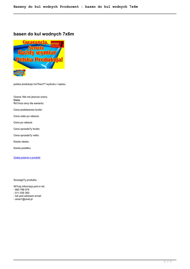Baseny do kul wodnych Producent : basen do kul wodnych 7x6m basen do kul wodnych 7x6m polska produkcja mo?liwo?? wydruku i napisu. Ocena: Nie ma jeszcze oceny Cena Ró?nica ceny dla wariantu Cena podstawowa brutto: Cena netto po rabacie: Cena po rabacie Cena sprzeda?y brutto: Cena sprzeda?y netto: Kwota rabatu: Kwota podatku: Zadaj pytanie o produkt Szczegó?y produktu Wi?cej informacji pod nr tel: - 660 798 074 - 511 035 393 - lub pod adresem email: - [email protected] 1 / 1 Powered by TCPDF (www.tcpdf.org)