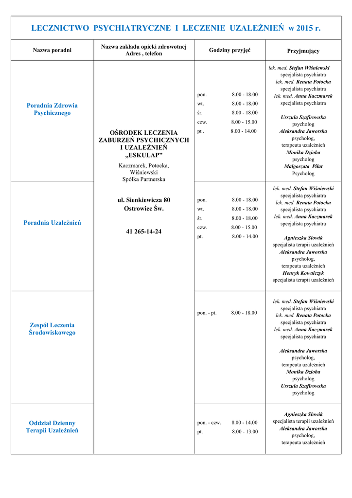 LECZNICTWO PSYCHIATRYCZNE I LECZENIE UZALEŻNIEŃ w 2015 r. Nazwa poradni Nazwa zakładu opieki zdrowotnej Adres , telefon Poradnia Zdrowia Psychicznego OŚRODEK LECZENIA ZABURZEŃ PSYCHICZNYCH I UZALEŻNIEŃ „ESKULAP” Godziny przyjęć pon. 8.00 - 18.00 wt. 8.00 - 18.00 śr. 8.00 - 18.00 czw. 8.00 - 15.00 pt . 8.00 - 14.00 Kaczmarek, Potocka, Wiśniewski Spółka Partnerska ul. Sienkiewicza 80 Ostrowiec Św. Poradnia Uzależnień 41 265-14-24 pon. 8.00 - 18.00 wt. 8.00 - 18.00 śr. 8.00 - 18.00 czw. 8.00 - 15.00 pt. 8.00 - 14.00 pon. - pt. 8.00 - 18.00 Zespół Leczenia Środowiskowego Przyjmujący lek. med. Stefan Wiśniewski specjalista psychiatra lek. med. Renata Potocka specjalista psychiatra lek. med. Anna Kaczmarek specjalista psychiatra Urszula Szafirowska psycholog Aleksandra Jaworska psycholog, terapeuta uzależnień Monika Dzioba psycholog Małgorzata Piłat Psycholog lek. med. Stefan Wiśniewski specjalista psychiatra lek. med. Renata Potocka specjalista psychiatra lek. med. Anna Kaczmarek specjalista psychiatra Agnieszka Słowik specjalista terapii uzależnień Aleksandra Jaworska psycholog, terapeuta uzależnień Henryk Kowalczyk specjalista terapii uzależnień lek. med. Stefan Wiśniewski specjalista psychiatra lek. med. Renata Potocka specjalista psychiatra lek. med. Anna Kaczmarek specjalista psychiatra Aleksandra Jaworska psycholog, terapeuta uzależnień Monika Dzioba psycholog Urszula Szafirowska psycholog Oddział Dzienny Terapii Uzależnień pon. - czw. 8.00 - 14.00 pt. 8.00 - 13.00 Agnieszka Słowik specjalista terapii uzależnień Aleksandra Jaworska psycholog, terapeuta uzależnień Poradnia Zdrowia Psychicznego pon. 10.00 - 20.00 wt. 7.00 - 15.00 śr. czw. Świętokrzyski Ośrodek Terapii 7.00 - 14.00 11.00 - 14.00 pt. 7.00 - 14.00 pon. 10.00 - 18.30 wt. 12.00 - 20.00 śr. 7.00 - 18.30 czw. 7.30 - 20.00 pt. 7.00 - 10.00 ul. Denkowska 8 Ostrowiec Św. Poradnia Leczenia Uzależnień Zespół Leczenia Środowiskowego Poradnia Psychologiczna 41 263-39-36 HARMONOGRAM TYGODNIOWY pon. 12.00 - 20.00 wt. 12.00 - 18.00 śr. 13.00 - 18.00 czw. lek. med. Agnieszka Maj – Lenartowicz specjalista psychiatra lek. med. Zbigniew Pastuszka specjalista psychiatra 7.00 - 11.00 Renata Zagożdżon psycholog, psychoterapeuta Katarzyna Kutera psycholog , terapeuta uzależnień lek. med. Agnieszka Maj – Lenartowicz specjalista psychiatra Katarzyna Kutera psycholog, specjalista terapii uzależnień Małgorzata Kraus certyfikowany specjalista psychoterapii uzależnień i substancji psychoaktywnych, pedagog lek. med. Agnieszka Maj – Lenartowicz specjalista psychiatra Renata Zagożdżon psycholog, psychoterapeuta Monika Gałązkiewicz psychoterapeuta Renata Zagożdżon psycholog, psychoterapeuta Katarzyna Kutera psycholog, terapeuta uzależnień Ilona Zagożdżon psycholog, Ewa Wieczorek psycholog, psychoterapeuta Monika Gałązkiewicz psychoterapeuta Sporządził: Wydział Zdrowia i Spraw Społecznych Starostwa Powiatowego w Ostrowcu Św.