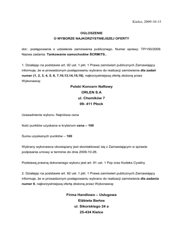 Kielce, 2009-10-15 OGLOSZENIE O WYBORZE NAJKORZYSTNIEJSZEJ OFERTY dot.: postępowania o udzielenie zamówienia publicznego. Numer sprawy: TP/150/2009. Nazwa zadania: Tankowanie samochodów ŚCRMiTS.. 1. Działając na podstawie art. 92 ust. 1 pkt. 1 Prawa zamówień publicznych Zamawiający informuje, Ŝe w prowadzonym postępowaniu wybrano do realizacji zamówienia dla zadań numer (1, 2, 3, 4, 5, 6, 7,10,13,14,15,16), najkorzystniejszą ofertę złoŜoną przez Wykonawcę: Polski Koncern Naftowy ORLEN S.A ul. Chemików 7 09- 411 Płock Uzasadnienie wyboru: NajniŜsza cena Ilość punktów uzyskana w kryterium cena – 100 Suma uzyskanych punktów – 100 Wybrany wykonawca obowiązany jest skontaktować się z Zamawiającym w sprawie podpisania umowy w terminie do dnia 2009-10-26. Podstawą prawną dokonanego wyboru jest art. 91 ust. 1 Pzp oraz Kodeks Cywilny 2. Działając na podstawie art. 92 ust. 1 pkt. 1 Prawa zamówień publicznych Zamawiający informuje, Ŝe w prowadzonym postępowaniu wybrano do realizacji zamówienia dla zadania numer 8, najkorzystniejszą ofertę złoŜoną przez Wykonawcę: Firma Handlowo – Usługowa ElŜbieta Bartos ul. Sikorskiego 24 a 25-434 Kielce Uzasadnienie wyboru: NajniŜsza cena Ilość punktów uzyskana w kryterium cena – 100 Suma uzyskanych punktów – 100 Wybrany wykonawca obowiązany jest skontaktować się z Zamawiającym w sprawie podpisania umowy w terminie do dnia 2009-10-26. Podstawą prawną dokonanego wyboru jest art. 91 ust. 1 Pzp oraz Kodeks Cywilny 3. Działając na podstawie art. 92 ust. 1 pkt. 1 Prawa zamówień publicznych Zamawiający informuje, Ŝe w prowadzonym postępowaniu wybrano do realizacji zamówienia dla zadania numer 9, najkorzystniejszą ofertę złoŜoną przez Wykonawcę: STEMAR Jacek Serwicki ul. Krywki 14 a 27-200 Starachowice Uzasadnienie wyboru: NajniŜsza cena Ilość punktów uzyskana w kryterium cena – 100 Suma uzyskanych punktów – 100 Wybrany wykonawca obowiązany jest skontaktować się z Zamawiającym w sprawie podpisania umowy w terminie do dnia 2009-10-26. Podstawą prawną dokonanego wyboru jest art. 91 ust. 1 Pzp oraz Kodeks Cywilny 4. Działając na podstawie art. 92 ust. 1 pkt. 1 Prawa zamówień publicznych Zamawiający informuje, Ŝe w prowadzonym postępowaniu wybrano do realizacji zamówienia dla zadania numer 11, najkorzystniejszą ofertę złoŜoną przez Wykonawcę: Przedsiębiorstwo WielobranŜowe „HURTEX” sp. z.o.o. ul. Pakosz 72 25-040 Kielce Uzasadnienie wyboru: NajniŜsza cena Ilość punktów uzyskana w kryterium cena – 100 Suma uzyskanych punktów – 100 Wybrany wykonawca obowiązany jest skontaktować się z Zamawiającym w sprawie podpisania umowy w terminie do dnia 2009-10-26. Podstawą prawną dokonanego wyboru jest art. 91 ust. 1 Pzp oraz Kodeks Cywilny 5. Działając na podstawie art. 92 ust. 1 pkt. 1 Prawa zamówień publicznych Zamawiający informuje, Ŝe w prowadzonym postępowaniu wybrano do realizacji zamówienia dla zadania numer 12, najkorzystniejszą ofertę złoŜoną przez Wykonawcę: Stacje Paliw „ANGIELSCY” Sp. j. Małgorzata Angielska – Ślusarska Włodzimierz Angielski, Mirosław Angielski Śladków Mały 26-020 Chmielnik Uzasadnienie wyboru: NajniŜsza cena Ilość punktów uzyskana w kryterium cena – 100 Suma uzyskanych punktów – 100 Wybrany wykonawca obowiązany jest skontaktować się z Zamawiającym w sprawie podpisania umowy w terminie do dnia 2009-10-26. Podstawą prawną dokonanego wyboru jest art. 91 ust. 1 Pzp oraz Kodeks Cywilny W prowadzonym postępowaniu złoŜono następujące oferty dla zadań numer (1. 2, 3, 4, 5, 6, 7, 10, 13, 14, 15, 16): 1. Polski Koncern Naftowy ORLEN S. A., 09-411 Płock, ul. Chemików 7 (oferta nr 1) Ilość punktów uzyskana w kryterium cena – 100 Suma uzyskanych punktów – 100 W prowadzonym postępowaniu złoŜono następujące oferty dla zadania numer 8 1. Firma Handlowo – Usługowa ElŜbieta Bartos, 25-434 Kielce, ul. Sikorskiego 24 a (oferta nr 4) Ilość punktów uzyskana w kryterium cena – 100 Suma uzyskanych punktów – 100 2. Polski Koncern Naftowy ORLEN S. A., 09- 411 Płock, ul. Chemików 7 (oferta nr 1) Ilość punktów uzyskana w kryterium cena – 94,66 Suma uzyskanych punktów – 94,66 W prowadzonym postępowaniu złoŜono następujące oferty dla zadania numer 9 1. STEMAR Jacek Serwicki, 27-200 Starachowice, ul. Krywki 14 a (oferta nr 3) Ilość punktów uzyskana w kryterium cena – 100 Suma uzyskanych punktów – 100 2. Polski Koncern Naftowy ORLEN S. A., 09- 411 Płock, ul. Chemików 7 (oferta nr 1) Ilość punktów uzyskana w kryterium cena – 96,45 Suma uzyskanych punktów – 96,45 W prowadzonym postępowaniu złoŜono następujące oferty dla zadania numer 11 1. Przedsiębiorstwo WielobranŜowe „HURTEX” Sp. z.o.o., 25-040 Kielce, ul. Pakosz 72 (oferta nr 5) Ilość punktów uzyskana w kryterium cena – 100 Suma uzyskanych punktów – 100 2. Polski Koncern Naftowy ORLEN S. A., 09- 411 Płock, ul. Chemików 7 (oferta nr 1) Ilość punktów uzyskana w kryterium cena – 99,40 Suma uzyskanych punktów – 99,40 W prowadzonym postępowaniu złoŜono następujące oferty dla zadania numer 12 1. Stacje Paliw „ANGIELSCY” Sp. j. Małgorzata Angielska – Ślusarska, Włodzimierz Angielski, Mirosław Angielski, 26-020 Chmielnik, Śladków Mały (oferta nr 2) Ilość punktów uzyskana w kryterium cena – 100 Suma uzyskanych punktów – 100 2. Polski Koncern Naftowy ORLEN S. A., 09- 411 Płock, ul. Chemików 7 (oferta nr 1) Ilość punktów uzyskana w kryterium cena – 98,65 Suma uzyskanych punktów – 98,65 3. Działając na podstawie art. 92 ust. 1 pkt. 2 Prawa zamówień publicznych Zamawiający informuje, Ŝe w prowadzonym postępowaniu nie zostały odrzucone Ŝadne oferty. 4. Działając na podstawie art. 92 ust. 1 pkt. 3 Prawa zamówień publicznych Zamawiający informuje, Ŝe w prowadzonym postępowaniu nie zostali wykluczeni Ŝadni wykonawcy. Środki ochrony pr