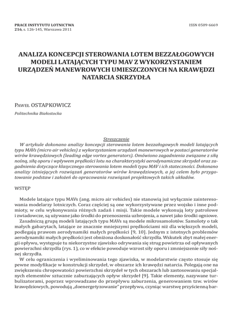PRACE iNSTYTUTU LOTNiCTWA 216, s. 126-145, Warszawa 2011 ISSN 0509-6669 ANALiZA KONCEPCJi STEROWANiA LOTEM BEZZAŁOGOWYCH MODELi LATAJĄCYCH TYPU MAV Z WYKORZYSTANiEM URZĄDZEŃ MANEWROWYCH UMiESZCZONYCH NA KRAWĘDZi NATARCiA SKRZYDŁA PaWeł OSTaPKOWICZ Politechnika Białostocka Streszczenie W artykule dokonano analizy koncepcji sterowania lotem bezzałogowych modeli latających typu MAVs (micro air vehicles) z wykorzystaniem urządzeń manewrowych w postaci generatorów wirów krawędziowych (leading edge vortex generators). Omówiono zagadnienia związane z siłą nośną, siłą oporu i wpływem prędkości lotu na charakterystyki aerodynamiczne skrzydeł oraz zagadnienia dotyczące klasycznego sterowania lotem modeli typu MAV i ich stateczności. Dokonano analizy istniejących rozwiązań generatorów wirów krawędziowych, a jej celem było przygotowanie podstaw i założeń do opracowania rozwiązań projektowych takich układów. WSTĘP Modele latające typu MaVs (ang. micro air vehicles) nie stanowią już wyłącznie zainteresowania modelarzy lotniczych. Coraz częściej są one wykorzystywane przez wojsko i inne podmioty, w celu wykonywania różnych zadań i misji. Takie modele wykonują loty patrolowe i zwiadowcze, są używane jako środki do przenoszenia uzbrojenia, a nawet jako środki ogniowe. Zasadniczą grupą modeli latających typu MaVs są modele mikrosamolotów. Samoloty o tak małych gabarytach, latające ze znacznie mniejszymi prędkościami niż dla większych modeli, podlegają prawom aerodynamiki małych prędkości [9, 10]. Jednym z istotnych problemów aerodynamiki małych prędkości jest obniżona doskonałość skrzydła. Wskutek zbyt małej energii opływu, występuje tu niekorzystne zjawisko odrywania się strug powietrza od opływanych powierzchni skrzydła (rys. 1), co w efekcie powoduje wzrost siły oporu i zmniejszenie siły nośnej skrzydła. W celu ograniczenia i wyeliminowania tego zjawiska, w modelarstwie często stosuje się pewne modyfikacje w konstrukcji skrzydeł, w obszarze ich krawędzi natarcia. Polegają one na zwiększeniu chropowatości powierzchni skrzydeł w tych obszarach lub zastosowaniu specjalnych elementów sztucznie zaburzających opływ skrzydeł [9]. Takie elementy, nazywane turbulizatorami, poprzez wprowadzane do przepływu zaburzenia, generowaniem tzw. wirów krawędziowych, powodują „doenergetyzowanie” przepływu, czyniąc warstwę przyścienną bar- aNalIZa KONCePCJI STerOWaNIa lOTeM beZZałOgOWyCh MOdelI laTaJąCyCh... 127 dziej odporną na oderwanie (rys. 2). Turbulizatory powodują wprawdzie pewne opory, ale polepszenie odporności strugi na oderwanie umożliwia uniknięcie dużo większego oporu całkowitego. W efekcie uzyskuje się znaczne zmniejszenie siły oporu i zwiększenie siły nośnej skrzydła. rys. 1. Opływ skrzydła w zakresie podkrytycznych wartości liczby reynoldsa (Re) [11] rys. 2. Opływ skrzydła w zakresie podkrytycznych wartości liczby reynoldsa (Re) z zastosowaniem turbulizatora [11] Turbulizatory można podzielić na dwie kategorie rozwiązań: – pasywne - z nieruchomymi elementami roboczymi, – aktywne - z ruchomymi elementami roboczymi. Na szczególną uwagę zasługują układy z turbulizatorami aktywnymi, które stwarzają potencjalną możliwość sterowania i regulacji wartości siły nośnej skrzydła. Układy takie mogą być zatem zastosowane w celu poprawy stateczności lotu, a nawet jako urządzenia manewrowe do sterowania lotem modeli typu MaV. Sterowanie lotem mikrosamolotów stanowi nadal dość istotny problem, szczególnie w aspekcie poprawy ich manewrowości. Tradycyjne rozwiązania, z wykorzystaniem klasycznych sterów, są mało efektywne. Przy niewielkich prędkościach lotu modeli typu MaV konieczne jest bowiem zastosowanie dużych powierzchni sterowych, co niekorzystnie wpływa na dynamikę całego układu. W niniejszym opracowaniu na wstępie przedstawiono ogólne zagadnienia dotyczące: siły nośnej, siły oporu, sterowania lotem modeli typu MaV i ich statecznością. Następnie przedstawiono opis przykładowych rozwiązań układów z turbulizatorami pasywnymi i aktywnymi, z uwzględnieniem ich charakterystyk aerodynamicznych. Celem analizy jest przygotowanie podstaw i założeń do opracowania rozwiązań projektowych takich układów. 128 PaWeł OSTaPKOWICZ 1. SIła NOŚNa I SIła OPOrU Podstawowym warunkiem ustalonego lotu poziomego modelu jest jednoczesne istnienie równowagi: pomiędzy siłą ciężkości modelu i wytworzoną siłą nośną oraz pomiędzy siłą ciągu wytwarzaną przez obracające się śmigło i siłą oporu (rys. 3). Uzyskanie lotu z przyspieszeniem poziomym będzie wymagało zwiększenia siły ciągu względem siły oporu. Natomiast w locie wznoszącym, gdy siła ciągu śmigła i siła oporu są równoległe do toru lotu nachylonego pod pewnym kątem do poziomu, siła nośna nie równoważy całkowitej siły ciężkości modelu, lecz jedynie jej składową prostopadłą do toru lotu, zaś siła ciągu śmigła równoważy lub pokonuje nie tylko siłę oporu, ale również składową siły ciężkości modelu, równoległą do toru lotu [1]. Siła nośna pojawia się w wyniku powstania różnicy ciśnień nad i pod skrzydłem ustawionym pod pewnym kątem α (określanym jako kąt natarcia) w stosunku do kierunku przepływających strug powietrza (rys. 4). Siła nośna wyrażana jest następującą zależnością: FZ = C Z ⋅ S ⋅ ⋅ 2 2 (1) gdzie: CZ – współczynnik nośności; S – pole powierzchni skrzydła; ρ – gęstość powietrza; υ – prędkość. Siła oporu, która hamuje ruch samolotu, jest wynikiem działania sił tarcia strug powietrza o powierzchnie skrzydeł i kadłuba oraz oporu aerodynamicznego związanego z kształtem bryły samolotu i jej wielkości (rys. 4). Siła oporu wyrażana jest następującą zależnością: FX = C X ⋅ S ⋅ ⋅ 2 2 (2) gdzie: CX – współczynnik oporu. Obie siły są składowym