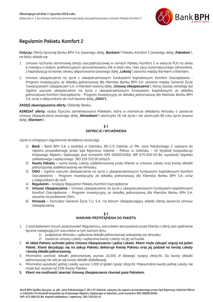 Obowiązuje od dnia 1 stycznia 2016 roku Załącznik nr 1 do Umowy rachunku terminowej lokaty oszczędnościowej w ramach Pakietu Komfort 2 Regulamin Pakietu Komfort 2 Dotyczy: Oferty łączonej Banku BPH S.A. (zwanego dalej „Bankiem”) Pakietu Komfort 2 (zwanego dalej „Pakietem”), na który składa się: 1. Umowa rachunku terminowej lokaty oszczędnościowej w ramach Pakietu Komfort 2 w walucie PLN na okres 6 miesięcy o stałym, preferencyjnym oprocentowaniu 4% w skali roku i bez opcji automatycznego odnowienia, z kapitalizacją na koniec okresu deponowania (zwanego dalej „Lokatą”) zawarta między Bankiem a Klientem, 2. Umowa ubezpieczenia na życie z ubezpieczeniowymi funduszami kapitałowymi Komfort Oszczędzania Program Inwestycyjny ze składką jednorazową dla Klientów Banku BPH S.A. zawarta między Generali Życie Towarzystwem Ubezpieczeń S.A. a Klientem (zwana dalej „Umową Ubezpieczenia”), której zasady określają też Ogólne warunki ubezpieczenia na życie z ubezpieczeniowymi funduszami kapitałowymi ze składką jednorazową Komfort Oszczędzania - Program Inwestycyjny ze składką jednorazową dla Klientów Banku BPH S.A. wraz z załącznikami do nich (zwane dalej „OWU”). ZASIĘG obowiązywania oferty: Oddziały Banku. ADRESAT oferty: osoba fizyczna zainteresowana Pakietem, która w momencie składania Wniosku o zawarcie Umowy Ubezpieczenia (zwanego dalej „Wnioskiem”) ukończyła 18 rok życia i nie ukończyła 80 roku życia (zwana dalej „Klientem”). §1 DEFINICJE I WYJAŚNIENIA Użyte w niniejszym regulaminie określenia oznaczają: 1) 2) 3) 4) 5) 6) Bank – Bank BPH S.A. z siedzibą w Gdańsku, 80-175 Gdańsk, ul. Płk. Jana Pałubickiego 2, wpisana do rejestru prowadzonego przez Sąd Rejonowy Gdańsk – Północ w Gdańsku – VII Wydział Gospodarczy Krajowego Rejestru Sądowego pod numerem KRS 0000010260, NIP 675-000-03-84, wysokość kapitału zakładowego i wpłaconego 383 339 555,00 złotych, Kwota Pakietu – suma kwoty Lokaty zadeklarowanej przez Klienta w umowie Lokaty oraz kwoty składki jednorazowej zadeklarowanej we Wniosku; OWU - Ogólne warunki ubezpieczenia na życie z ubezpieczeniowymi funduszami kapitałowymi Komfort Oszczędzania – Program Inwestycyjny ze składką jednorazową dla Klientów Banku BPH S.A. wraz z załącznikami do nich. Regulamin - niniejszy Regulamin Pakietu Komfort Oszczędzania Umowa Ubezpieczenia – Umowa ubezpieczenia na życie z ubezpieczeniowymi funduszami kapitałowymi Komfort Oszczędzania – Program inwestycyjny ze składką jednorazową dla Klientów Banku BPH S.A. zawarta na podstawie OWU. Wniosek – formularz Generali Życie T.U. S.A., na którym Ubezpieczający składa ofertę zawarcia Umowy Ubezpieczenia. §2 WARUNKI PRZYSTĄPIENIA DO PAKIETU 1. 2. 3. 4. 5. Z zastrzeżeniem innych postanowień Regulaminu, warunkiem skorzystania przez Klienta z oferty jest spełnienie łącznie następujących warunków w tym samym dniu: 1) podpisanie Wniosku i opłacenie składki jednorazowej wskazanej we Wniosku 2) zawarcie umowy Lokaty i wpłacenie kwoty Lokaty na jej rachunek. W skład Pakietu wchodzi jedna Umowa Ubezpieczenia i jedna Lokata. Klient może zakupić więcej niż jeden Pakiet. Klient decydując się na zakup Pakietu deklaruje Kwotę Pakietu oraz jej podział na kwotę Lokaty i kwotę składki jednorazowej. Minimalna wartość składki jednorazowej wynosi 10.000 zł (dziesięć tysięcy złotych). Do kwoty składki jednorazowej nie wlicza się kwoty składki dodatkowej. Minimalna wysokość jednej Lokaty wynosi 1.000 zł (jeden tysiąc złotych). Maksymalna kwota jednej Lokaty nie może być wyższa niż 25% Kwoty Pakietu. Klient ma możliwość zawrzeć Umowę Ubezpieczenia również poza Pakietem. Bank BPH Spółka Akcyjna, ul. płk. Jana Pałubickiego 2, 80-175 Gdańsk, wpisany do rejestru prowadzonego przez Sąd Rejonowy Gdańsk-Północ w Gdańsku VII Wydział Gospodarczy Krajowego Rejestru Sądowego w Gdańsku, pod numerem KRS 0000010260. NIP: 675-000-03-84. Kapitał zakładowy i wpłacony: 383.339.555 zł. Obowiązuje od dnia 1 stycznia 2016 roku Załącznik nr 1 do Umowy rachunku terminowej lokaty oszczędnościowej w ramach Pakietu Komfort 2 6. Klient ma możliwość zawarcia umowy rachunku terminowej lokaty oszczędnościowej na okres 6 miesięcy poza Pakietem, jednak w takim przypadku środki zgromadzone na rachunku tej lokaty będą oprocentowane stawką przewidzianą w standardowej ofercie Banku. §3 OPROCENTOWANIE LOKATY W PAKIECIE 1. 2. Z zastrzeżeniem ust. 2 środki pieniężne zgromadzone na Lokacie są oprocentowane według stawki stałej w wysokości: 1,1% w stosunku rocznym. W przypadku łącznego spełnienia przez Klienta warunków opisanych w § 2 ust.1-4 oraz obowiązywania Umowy Ubezpieczenia przez co najmniej 30 dni od daty jej zawarcia, wówczas stawka oprocentowania preferencyjnego Lokaty wyniesie 4,0% w skali roku w całym Okresie umownym (oprocentowanie stałe). §4 ZASADY OBOWIĄZUJĄCE W PRZYPADKU REZYGNACJI Z JEDNEGO Z PRODUKTÓW W PAKIECIE 1. 2. 3. 4. 5. 6. Brak wpłaty środków przez Klienta na rachunek Lokaty nie ma wpływu na opłaconą Umowę Ubezpieczenia. Rozwiązanie przez Klienta umowy Lokaty przed terminem zapadalności nie ma wpływu na opłaconą Umowę ubezpieczenia. Rozwiązanie Lokaty przed upływem Okresu umownego skutkuje obniżeniem stawki oprocentowania za dotychczasową część Okresu umownego do dnia poprzedzającego rozwiązanie Lokaty do wysokości: 1) 0% w skali roku, jeśli wypłata następuje najpóźniej 30-ego dnia od dnia otwarcia Lokaty; 2) 0,1% w skali roku, jeśli wypłata następuje po 30-tym dniu od dnia otwarcia Lokaty. W przypadku zawarcia Lokaty oraz jednoczesnego braku zawarcia Umowy Ubezpieczenia lub braku opłacenia przez Klienta składki jednorazowej wskazanej we Wniosku lub jej opłacenia kwotą inną niż wskazana we Wniosku, Lokata będzie prowadzona na warunkach oprocentowania określonych w § 3 ust. 1 Re