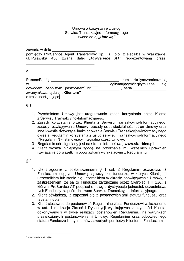 Umowa o korzystanie z usług Serwisu Transakcyjno-Informacyjnego zwana dalej „Umową” zawarta w dniu _____________________ pomiędzy ProService Agent Transferowy Sp. z ul. Puławska 436 zwaną dalej „ProService _________________________________ o.o. z siedzibą w Warszawie, AT” reprezentowaną przez: a Panem/Panią _________________________________ zamieszkałym/zamieszkałą w _______________________________, legitymującym/legitymującą się 1 dowodem osobistym/ paszportem nr______________ , seria ________________ zwanym/zwaną dalej „Klientem” o treści następującej §1 1. Przedmiotem Umowy jest uregulowanie zasad korzystania przez Klienta z Serwisu Transakcyjno-Informacyjnego. 2. Zasady korzystania przez Klienta z Serwisu Transakcyjno-Informacyjnego, zasady rozwiązywania Umowy, zasady odpowiedzialności stron Umowy oraz inne kwestie dotyczące funkcjonowania Serwisu Transakcyjno-Informacyjnego określa Regulamin korzystania z usług serwisu Transakcyjno-Informacyjnego (”Regulamin”) - stanowiący integralną część Umowy. 3. Regulamin udostępniany jest na stronie internetowej www.skarbiec.pl 4. Klient wyraża niniejszym zgodę na przyznanie mu wszelkich uprawnień i związanie go wszelkimi obowiązkami wynikającymi z Regulaminu. §2 1. Klient zgodnie z postanowieniami § 1 ust. 2 Regulamin oświadcza, iż Funduszami objętymi Umową są wszystkie fundusze, w których Klient jest uczestnikiem lub stanie się uczestnikiem w okresie obowiązywania Umowy, z zastrzeżeniem, że są to Fundusze zarządzane przez Skarbiec TFI S.A., z którymi ProService AT podpisał umowę o dystrybucje jednostek uczestnictwa tych Funduszy za pośrednictwem Serwisu Transakcyjno-Informacyjnego. 2. Klient oświadcza, iż zapoznał się z postanowieniami statutu funduszu oraz tabelami opłat. 3. Klient stosownie do postanowień Regulaminu zleca Funduszowi wskazanemu w ust. 1 realizację Zleceń i Dyspozycji wynikających z czynności Klienta, dokonywanych w trybie realizacji postanowień Regulaminu, na warunkach przewidzianych postanowieniami Umowy, Regulaminu oraz odpowiedniego statutu Funduszu i innych umów zawartych pomiędzy Klientem i Funduszami, 1 Niepotrzebne skreślić 4. Klient przyjmuje do wiadomości i zgadza się na to, aby należne mu środki z tytułu realizacji Zlecenia Odkupienia przelewane były na prowadzony na jego rzecz rachunek/ rachunki wskazane w załączniku do Umowy. 5. Niniejszym Klient upoważnia Towarzystwo do uzyskania od banku prowadzącego rachunek/ rachunki wskazane w Umowie wszystkich informacji dotyczących posiadacza tych rachunków i wyraża zgodę na to, aby wypłata środków należnych mu z tytułu realizacji Zlecenia Odkupienia, na rachunek wskazany w Umowie, uzależniona była od dostarczenia przez Klienta Towarzystwu oświadczenia banku prowadzącego rachunek, na który ma być dokonana wypłata, iż posiadaczem tego rachunku jest osoba, która zawarła Umowę, o ile Towarzystwo uzna to za niezbędne. §3 1. Wszelkie pojęcia niezdefiniowane w Umowie mają znaczenie nadane im w postanowieniach Regulaminu oraz odpowiedniego statutu Funduszu i innych umów zawartych pomiędzy Klientem i Funduszem. 2. Umowa wchodzi w życie nie później niż w następnym dniu roboczym po dniu otrzymania przez ProService AT prawidłowej i podpisanej przez Klienta Umowy. 3. Przez prawidłową Umowę rozumie się umowę, która zawiera wszelkie wymagane dla danego Klienta dane i dokumenty określone w Regulaminie, Załączniku do Regulaminu oraz Załączniku do Umowy „Dane Klienta”, a także inne, jeśli ich dostarczenia zażąda ProService AT. 4. Datą aktywacji usługi Serwisu Transakcyjno-Informacyjnego jest dzień wejścia w życie Umowy. 5. Umowa została sporządzona w dwóch jednobrzmiących egzemplarzach po jednym dla każdej ze stron. 6. Załącznik do Umowy „Dane Klienta” stanowi jej integralną część. 7. Niniejszym Klient upoważnia ProService AT do udostępnienia danych zawartych w Umowie Skarbiec TFI S.A., o ile udostępnienie danych będzie niezbędne do prawidłowego wykonywania obowiązków przez Skarbiec TFI S.A. nałożonych przepisami prawa, statutami Funduszy i Regulaminem. Klient ProService AT Załącznik do Umowy DANE KLIENTA Klient Indywidualny Imię * Drugie imię Nazwisko * Adres: E-mail * Data urodzenia * Płeć * PESEL NIP Typ dokumentu tożsamości * Numer dokumentu tożsamości * Obywatelstwo * Status dewizowy * Kraj certyfikatu rezydencji Data wystawienia certyfikatu rezydencji Adres stały Ulica * Dom * Lokal kod pocztowy * miejscowość * Kraj * Telefon fax Adres korespondencyjny Ulica * Dom * Lokal kod pocztowy * Miejscowość * Kraj * telefon fax Rachunki Bankowe Numer rachunku* Waluta, w której prowadzony jest rachunek* Beneficjent* Tytuł przelewu *) pola niezbędne do wypełnienia