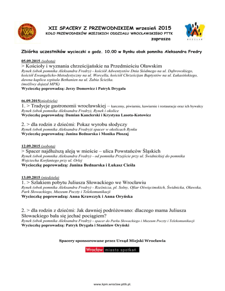 XII SPACERY Z PRZEWODNIKIEM wrzesień 2015 KOŁO PRZEWODNIKÓW MIEJSKICH ODDZIAŁU WROCŁAWSKIEGO PTTK zaprasza Zbiórka uczestników wycieczki o godz. 10.00 w Rynku obok pomnika Aleksandra Fredry 05.09.2015 (sobota) > Kościoły i wyznania chrześcijańskie na Przedmieściu Oławskim Rynek (obok pomnika Aleksandra Fredry) - kościół Adwentystów Dnia Siódmego na ul. Dąbrowskiego, kościół Ewangelicko-Metodystyczny na ul. Worcella, kościół Chrześcijan Baptystów na ul. Łukasińskiego, dawna kaplica szpitala Bethanien na ul. Żabia Ścieżka. (możliwy dojazd MPK) Wycieczkę poprowadzą: Jerzy Domowicz i Patryk Drygała 06.09.2015(niedziela) 1. > Tradycje gastronomii wrocławskiej – karczmy, piwiarnie, kawiarnie i restauracje oraz ich bywalcy Rynek (obok pomnika Aleksandra Fredry), Rynek i okolice Wycieczkę poprowadzą: Damian Kanclerski i Krystyna Lasota-Kotowicz 2. > dla rodzin z dziećmi: Pokaz wyrobu słodyczy Rynek (obok pomnika Aleksandra Fredry)i spacer w okolicach Rynku Wycieczkę poprowadzą: Janina Bednarska i Monika Płoszaj 12.09.2015 (sobota) > Spacer najdłuższą aleją w mieście – ulica Powstańców Śląskich Rynek (obok pomnika Aleksandra Fredry) - od pomnika Przejście przy ul. Świdnickiej do pomnika Wojciecha Korfantego przy ul. Orlej Wycieczkę poprowadzą: Janina Bednarska i Łukasz Cieśla 13.09.2015 (niedziela) 1. > Szlakiem pobytu Juliusza Słowackiego we Wrocławiu Rynek (obok pomnika Aleksandra Fredry) - Rzeźnicza, pl. Solny, Ofiar Oświęcimskich, Świdnicka, Oławska, Park Słowackiego, Muzeum Poczty i Telekomunikacji Wycieczkę poprowadzą: Anna Krawczyk i Anna Oryńska 2. > dla rodzin z dziećmi: Jak dawniej podróżowano: dlaczego mama Juliusza Słowackiego bała się jechać pociągiem? Rynek (obok pomnika Aleksandra Fredry) - spacer do Parku Słowackiego i Muzeum Poczty i Telekomunikacji Wycieczkę poprowadzą: Patryk Drygała i Stanisław Oryński Spacery sponsorowane przez Urząd Miejski Wrocławia www.kpm.wroclaw.pttk.pl.