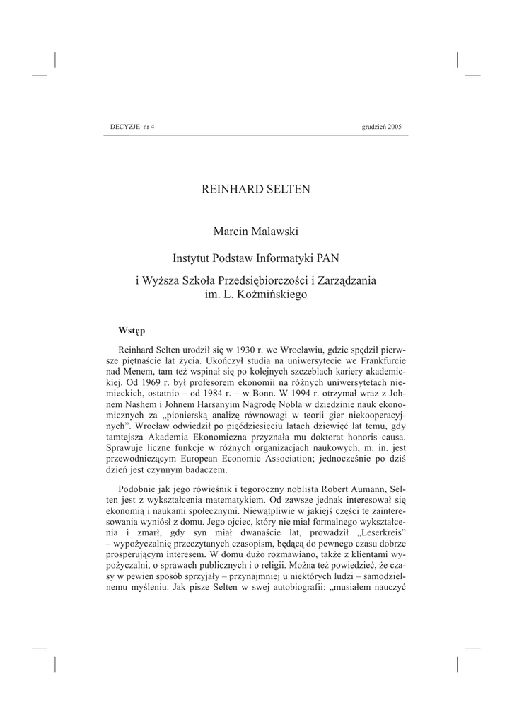 DECYZJE nr 4 grudzień 2005 REINHARD SELTEN Marcin Malawski Instytut Podstaw Informatyki PAN i Wyższa Szkoła Przedsiębiorczości i Zarządzania im. L. Koźmińskiego Wstęp Reinhard Selten urodził się w 1930 r. we Wrocławiu, gdzie spędził pierwsze piętnaście lat życia. Ukończył studia na uniwersytecie we Frankfurcie nad Menem, tam też wspinał się po kolejnych szczeblach kariery akademickiej. Od 1969 r. był profesorem ekonomii na różnych uniwersytetach niemieckich, ostatnio – od 1984 r. – w Bonn. W 1994 r. otrzymał wraz z Johnem Nashem i Johnem Harsanyim Nagrodę Nobla w dziedzinie nauk ekonomicznych za „pionierską analizę równowagi w teorii gier niekooperacyjnych”. Wrocław odwiedził po pięćdziesięciu latach dziewięć lat temu, gdy tamtejsza Akademia Ekonomiczna przyznała mu doktorat honoris causa. Sprawuje liczne funkcje w różnych organizacjach naukowych, m. in. jest przewodniczącym European Economic Association; jednocześnie po dziś dzień jest czynnym badaczem. Podobnie jak jego rówieśnik i tegoroczny noblista Robert Aumann, Selten jest z wykształcenia matematykiem. Od zawsze jednak interesował się ekonomią i naukami społecznymi. Niewątpliwie w jakiejś części te zainteresowania wyniósł z domu. Jego ojciec, który nie miał formalnego wykształcenia i zmarł, gdy syn miał dwanaście lat, prowadził „Leserkreis” – wypożyczalnię przeczytanych czasopism, będącą do pewnego czasu dobrze prosperującym interesem. W domu dużo rozmawiano, także z klientami wypożyczalni, o sprawach publicznych i o religii. Można też powiedzieć, że czasy w pewien sposób sprzyjały – przynajmniej u niektórych ludzi – samodzielnemu myśleniu. Jak pisze Selten w swej autobiografii: „musiałem nauczyć 76 SYLWETKA się polegać na własnych przemyśleniach zamiast na oficjalnej propagandzie czy opinii publicznej. Wpłynęło to istotnie na mój rozwój intelektualny i było jednym z powodów, dla których pod koniec szkoły średniej zacząłem interesować się ekonomią”. Na studiach zetknął się z teorią gier i na jej temat pisał pracę magisterską i później doktorską. Jego praca naukowa właściwie od początku szła dwutorowo. Z jednej strony zajmował się czysto teoretycznymi problemami, przede wszystkim związanymi z udoskonaleniem pojęcia równowagi Nasha, i za te badania – w szczególności za fundamentalne prace [5] i [7] – otrzymał Nagrodę Nobla. Z drugiej poświęcił bardzo wiele czasu i uwagi, a także starań organizacyjnych, ekonomii eksperymentalnej – doświadczeniom laboratoryjnym, w których badane osoby rozgrywają gry wymagające od nich podejmowania decyzji natury ekonomicznej. Z tego powodu lubi określać się jako „metodyczny dualista”, a jego pogląd można w uproszczeniu streścić tak: Trzeba rozwijać tradycyjną, normatywną teorię gier, zajmującą się interaktywnymi decyzjami doskonale racjonalnych podmiotów. Trzeba jednak zawsze pamiętać o tym, że założenia tej teorii, w szczególności to o maksymalizacji oczekiwanej użyteczności, zazwyczaj bardzo odbiegają od rzeczywistości. Ponieważ zaś konkurencyjne teorie ograniczonej racjonalności mają na ogół charakter czysto spekulatywny, konieczne są badania eksperymentalne, dzięki którym można będzie przynajmniej w jakiejś części te teorie zweryfikować. Równowaga doskonała Dziś, gdy o równowadze Nasha uczy się obowiązkowo większość studentów ekonomii, może się wydawać dziwne, że jeszcze kilkanaście lat po wprowadzeniu tego pojęcia przez Nasha (por. [4]) było ono niezbyt rozpropagowane i interesowało głównie matematyków. Było tak po części zapewne dlatego, że wiele gier ma dużo różnych równowag i wobec tego stwierdzenie, że racjonalni gracze wybiorą strategie równowagi, często ma małą wartość prognostyczną. Selten jako pierwszy wyodrębnił dla gier w postaci ekstensywnej tzn. przedstawionych jako drzewa wszystkich możliwych przebiegów – klasę równowag doskonałych. Są to takie układy strategii, które nie tylko są równowagami całej gry, ale także wyznaczają równowagi we wszystkich jej podgrach, tj. fragmentach drzewa zawierających konkretną sytuację w grze i wszystkie, które mogą wystąpić w dalszej rozgrywce. Do równowagi doskonałej prowadzi w szczególności metoda indukcji wstecznej, polegająca na analizie drzewa gry z pełną informacją „od końca”. SYLWETKA 77 Jest ona znacznie starsza niż samo pojęcie równowagi Nasha – już w 1913 użył jej Ernst Zermelo do dowodu, że np. szachy są grą zamkniętą. Jednak równowaga doskonała ma zastosowanie także w bardzo wielu grach z niepełną informacją, w których gracze bądź podejmują część decyzji jednocześnie, bądź w pewnych sytuacjach nie wiedzą, jakie decyzje wcześniej podjęli inni gracze. Znakomitym przykładem jest wieloetapowy model duopolu z bezwładnością popytu w pracy [5] (być może ostatniej tak obficie cytowanej pracy ekonomicznej napisanej w języku innym niż angielski). W modelu tym firmy konkurują ceną, ustalając w każdym momencie ceny niezależnie od siebie, sprzedaż firmy w danym okresie zależy tylko od ceny podyktowanej przez nią, ale jeżeli jej cena będzie wyższa niż konkurenta, to w następnym etapie część jej klientów przejdzie do konkurenta. Ta gra ma bardzo wiele równowag Nasha, ale tylko jedną doskonałą, która wyznacza konkretną ścieżkę cen i zysków. Podobnie jest w bardzo wielu grach występujących w analizie ekonomicznej. Na przykład w szeroko stosowanych modelach przetargu z naprzemiennymi ofertami typowa sytuacja jest taka, że każdy podział dobra można otrzymać w jakiejś równowadze, ale tylko jeden w równowadze doskonałej. Nawet w prostym przetargu ultymatywnym (o którym pisaliśmy w artykule [2] w poprzednim numerze Decyzji) ograniczenie się do równowag doskonałych pozwala wytypować jeden lub najwyżej