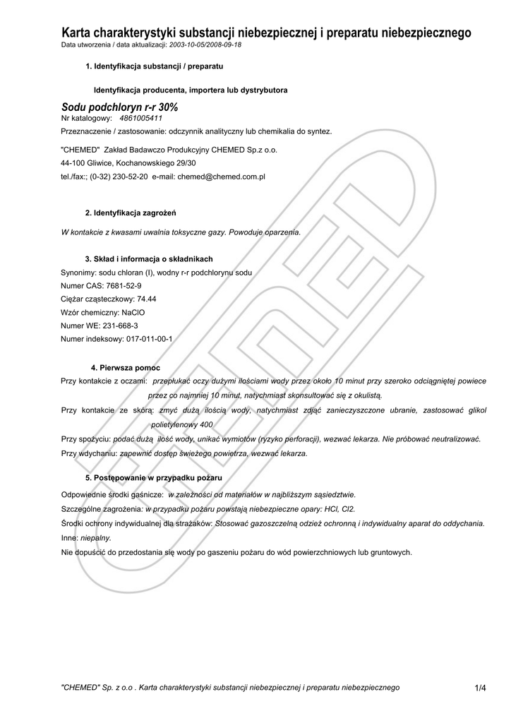 Karta charakterystyki substancji niebezpiecznej i preparatu niebezpiecznego Data utworzenia / data aktualizacji: 2003-10-05/2008-09-18 1. Identyfikacja substancji / preparatu Identyfikacja producenta, importera lub dystrybutora Sodu podchloryn r-r 30% Nr katalogowy: 4861005411 Przeznaczenie / zastosowanie: odczynnik analityczny lub chemikalia do syntez. "CHEMED" Zakład Badawczo Produkcyjny CHEMED Sp.z o.o. 44-100 Gliwice, Kochanowskiego 29/30 tel./fax:; (0-32) 230-52-20 e-mail: [email protected] 2. Identyfikacja zagrożeń W kontakcie z kwasami uwalnia toksyczne gazy. Powoduje oparzenia. 3. Skład i informacja o składnikach Synonimy: sodu chloran (I), wodny r-r podchlorynu sodu Numer CAS: 7681-52-9 Ciężar cząsteczkowy: 74.44 Wzór chemiczny: NaClO Numer WE: 231-668-3 Numer indeksowy: 017-011-00-1 4. Pierwsza pomoc Przy kontakcie z oczami: przepłukać oczy dużymi ilościami wody przez około 10 minut przy szeroko odciągniętej powiece przez co najmniej 10 minut, natychmiast skonsultować się z okulistą. Przy kontakcie ze skórą: zmyć dużą ilością wody, natychmiast zdjąć zanieczyszczone ubranie, zastosować glikol polietylenowy 400 Przy spożyciu: podać dużą ilość wody, unikać wymiotów (ryzyko perforacji), wezwać lekarza. Nie próbować neutralizować. Przy wdychaniu: zapewnić dostęp świeżego powietrza, wezwać lekarza. 5. Postępowanie w przypadku pożaru Odpowiednie środki gaśnicze: w zależności od materiałów w najbliższym sąsiedztwie. Szczególne zagrożenia: w przypadku pożaru powstają niebezpieczne opary: HCl, Cl2. Środki ochrony indywidualnej dla strażaków: Stosować gazoszczelną odzież ochronną i indywidualny aparat do oddychania. Inne: niepalny. Nie dopuścić do przedostania się wody po gaszeniu pożaru do wód powierzchniowych lub gruntowych. "CHEMED" Sp. z o.o . Karta charakterystyki substancji niebezpiecznej i preparatu niebezpiecznego 1/4 Sodu podchloryn r-r 30% 6. Postępowanie w przypadku niezamierzonego uwolnienia do środowiska Nie wdychać par/aerozoli. Unikać zanieczyszczenia substancją. Zabrać przy pomocy substancji absorbującej ciecze. Przekazać do likwidacji. Oczyścić zanieczyszczony teren. Nie dopuścić do dostania się do wód, ścieków i gleby . Do pomieszczeń zamkniętych zapewnić dostęp świeżego powietrza. 7. Postępowanie z substancją / preparatem i jej / jego magazynowanie Obchodzenie się z substancją: Zapewnić skuteczną wymianę powietrza (wentylacja). Postępować zgodnie z zasadami dobrej praktyki przemysłowej oraz ogólnymi zasadami bezpieczeństwa i higieny pracy z substancjami chemicznymi. Stosować środki ochrony osobistej zgodnie z pkt.8. Nie opróżniać do kanalizacji. Postępować zgodnie z zasadami obchodzenia się z substancjami żrącymi. Magazynowanie: szczelne opakowania, dobrze wentylowane pomieszczenie. Temperatura od +4 do +15 °C. Rozporzadzenie Ministra Zdrowia z dnia 14 marca 2003 r. w sprawie sposobu oznakowania miejsc, rurociagów oraz pojemników i zbiorników słu¿acych do przechowywania lub zawierajacych substancje niebezpieczne lub preparaty niebezpieczne (Dz.U.03.61.552) 8. Kontrola narażenia i środki ochrony indywidualnej Parametry kontroli (NDS, NDSCh, NDSP): Stosować odpowiednią wentylację wywiewną, miejscową i ogólną zapewniającą utrzymanie stężenia produktu w powietrzu poniżej określonych limitów (minimum 10-krotna wymiana powietrza na godzinę). Zaleca się wyposażenie miejsca pracy w wodny natrysk do płukania oczu oraz prysznic. Środki ochrony indywidualnej powinny być tak zaprojektowane i wykonane aby wykluczały zagrożenie i inne niedogodności w przewidywanych warunkach użytkowania, chroniące przed chemikaliami. Dz. U. nr 217, Rozporządzenie z dnia 29 listopada 2002 (poz. 1833); Dz. U. nr 80, Rozporządzenie z dnia 31 marca 2003 (poz. 725), Dz. U. nr212(poz. 1769), Rozporządzenie Ministra Gospodarki i Pracy z dnia 10 października 2005 Środki ochrony indywidualnej: ochrona dróg oddechowych: konieczna gdy tworzą się pary/aerozole – maska przeciwgazowa ochrona oczu: konieczna - okulary ochronne typu gogle ochrona rąk: konieczna – rękawice ochronne, chroniące przed chemikaliami (znak CE) ochrona ciała: konieczna – ubranie kwasoodporne środki ochronne i higieny: natychmiast zmienić zanieczyszczone ubranie. Pracować pod wyciągiem. Wymyć ręce i twarz po pracy z tą substancją. Rozporzadzenie Ministra Zdrowia z dnia 30 grudnia 2004 r. w sprawie bezpieczenstwa i higieny pracy zwiazanej z wystepowaniem w miejscu pracy czynników chemicznych (Dz.U.05.11.86) "CHEMED" Sp. z o.o . Karta charakterystyki substancji niebezpiecznej i preparatu niebezpiecznego 2/4 Sodu podchloryn r-r 30% 9. Własności fizykochemiczne Forma: ciecz lepkość dynamiczna: 2,6 mPas (20°C) Kolor: bezbarwna do jasnożółtego lepkość kinematyczna: Zapach: chloru Ciśnienie par: około 25 hPa (20°C) pH: 11,5 – 12,5 (20 °C) Gęstość: 1,26 g/cm3 (20°C) Temperatura topnienia: -16°C Ciężar nasypowy: nie dotyczy Temperatura wrzenia: 96-99°C Rozpuszczalność: Temperatura samozapłonu: nie dotyczy w wodzie: rozpuszczalny Temperatura zapłonu: nie dotyczy w rozpuszczalnikach organicznych: brak danych Granice wybuchowości: nie dotyczy log P(w/o): górna: dolna: 10. Stabilność i reaktywność Warunki których należy unikać: podwyższona temperatura. Materiały których należy unikać: sole amonowe, metanol, pierwszorzędowe aminy alifatyczne (tworzy wybuchowe niestabilne aminy), wybuchowa reakcja z kwasem mrówkowym Niebezpieczne produkty rozkładu: chlorowodór, chlor. Następne dane: czuły na światło. 11. Informacje toksykologiczne Informacje toksykologiczne: LD50(doustnie, szczur): 8200 mg/kg (na czysta substancje). Pozostałe dane: substancja działa silnie destrukcyjnie na błony śluzowe górnych dróg oddechowych, oczu i skóry.; przy spożyciu: 12. Informacje ekologiczne Toksyczny dla organizmów wodnych. Nie dopuścić do dostan