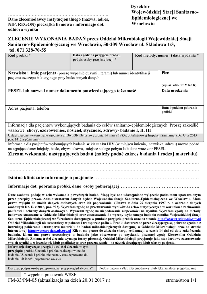 ………………………………………………………….. Dane zleceniodawcy instytucjonalnego (nazwa, adres, NIP, REGON) pieczątka firmowa / informacje dot. odbioru wyniku Dyrektor Wojewódzkiej Stacji SanitarnoEpidemiologicznej we Wrocławiu ZLECENIE WYKONANIA BADAŃ przez Oddział Mikrobiologii Wojewódzkiej Stacji Sanitarno-Epidemiologicznej we Wrocławiu, 50-209 Wrocław ul. Składowa 1/3, tel. 071 328-70-55 Kod próbki * Data i godzina przyjęcia próbki, podpis osoby przyjmującej * Kod metody, numer i data wydania * Nazwisko i imię pacjenta (proszę wypełnić dużymi literami) lub numer identyfikacji Płeć pacjenta /szczepu bakteryjnego przy braku innych danych (wpisać właściwe M lub K) PESEL lub nazwa i numer dokumentu potwierdzającego tożsamość Data urodzenia Adres pacjenta, telefon Data i godzina pobrania próbki Informacja dla pacjentów wykonujących badania do celów sanitarno-epidemiologicznych. Proszę zakreślić właściwe: chory, ozdrowieniec, nosiciel, styczność, zdrowy- badanie I, II, III Usługi zlecone wykonywane zgodnie z art.36 p.3b i 3c ustawy z dnia 14 marca 1985r. o Państwowej Inspekcji Sanitarnej (Dz. U. z 2015 poz. 1412 z późn. zm.) Informacja dla pacjentów wykonujących badania w kierunku HIV (w miejscu imienia, nazwiska, adresu) można podać następujące dane: inicjały, hasło, obywatelstwo, miejsce stałego pobytu lub dane wraz z nr PESEL. Zlecam wykonanie następujących badań (należy podać zakres badania i rodzaj materiału) ………………………………………………………………………………………………………………… ………………………………………………………………………………………………………………… Istotne klinicznie informacje o pacjencie ………………….…………………………………… Informacje dot. pobrania próbki, dane osoby pobierającej …………………………………………. Dane osobowe podaję w celu wykonania powyższych badań. Mogą być one udostępnione wyłącznie podmiotom upoważnionym przez przepisy prawa. Administratorem danych będzie Wojewódzka Stacja Sanitarno-Epidemiologiczna we Wrocławiu. Mam prawo wglądu do moich danych osobowych oraz ich poprawiania. (Ustawa z dnia 29 sierpnia 1997 r. o ochronie danych osobowych Dz. U. z 2016, poz. 922). Wyrażam zgodę na przetwarzanie wyników do celów statystycznych w warunkach zachowania poufności i ochrony danych osobowych. Wyrażam zgodę na niepodawanie niepewności na wyniku. Wyrażam zgodę na metody badawcze stosowane w Oddziale Mikrobiologii oraz zastosowanie do wyceny wykonanego badania cennika Wojewódzkiej Stacji Sanitarno-Epidemiologicznej we Wrocławiu dostępnego w punkcie przyjęcia próbek oraz na stronie http://wssewroclaw.pis.gov.pl Oddział Mikrobiologii nie uczestniczy w poborze i transporcie próbek. Próbki dostarczone przez zlecającego są pobrane zgodnie z instrukcją pobierania i transportu materiału do badań mikrobiologicznych dostępnej w Oddziale Mikrobiologii oraz na stronie internetowej http://wssewroclaw.pis.gov.pl Klient ma prawo do złożenia skargi, reklamacji w czasie 14 dni od daty zakończenia badania. Klient ma prawo uczestniczyć w badaniu jako obserwator po uzyskaniu pisemnej zgody Kierownika Oddziału Mikrobiologii. Zmiana treści zlecenia wymaga formy pisemnej. Oddział Mikrobiologii przyjmuje jako standardowe zastosowanie swoich wyników w lecznictwie i/lub profilaktyce oraz przeznaczenie - na użytek zlecającego i/lub własny pacjenta. Informacje dotyczące przeglądu całości zlecenia w tym przeglądu próbki Zlecenie i próbka zaakceptowane do badania / Zlecenie i próbka nie zostały zaakceptowane do badania lub inne* (niepotrzebne skreślić) Decyzja, podpis osoby przeprowadzającej przegląd zlecenia* Podpis pacjenta i/lub zleceniodawcy i/lub lekarza zlecającego badanie * wypełnia pracownik WSSE FM-33/PM-05 (aktualizacja na dzień 20.01.2017 r.) strona/stron 1/1