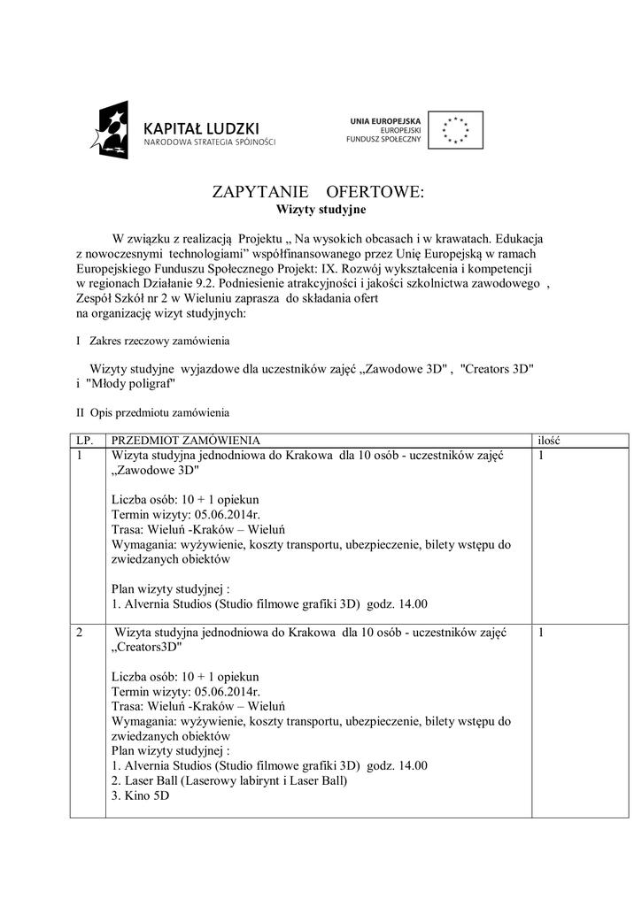 ZASYTANIE OFERTOWE WIZYTA STUDYJNA 2014 Kraków