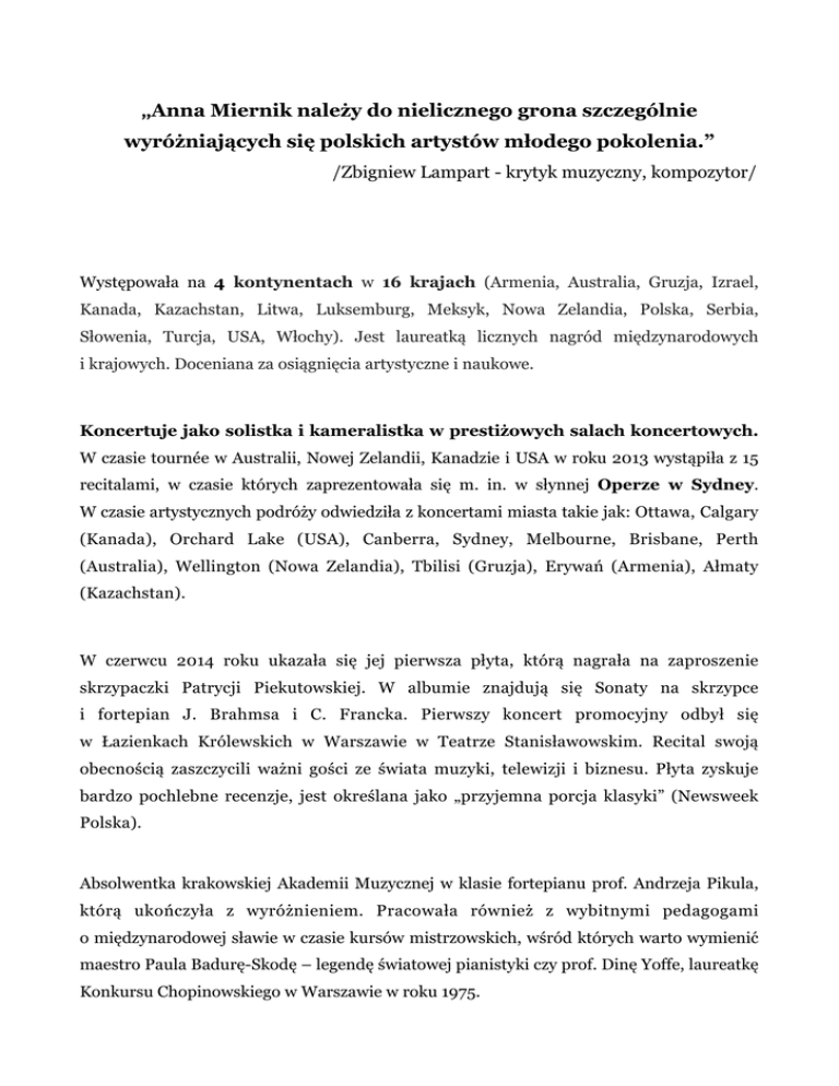 ! „Anna Miernik należy do nielicznego grona szczególnie wyróżniających się polskich artystów młodego pokolenia.” /Zbigniew Lampart - krytyk muzyczny, kompozytor/ ! ! Występowała na 4 kontynentach w 16 krajach (Armenia, Australia, Gruzja, Izrael, Kanada, Kazachstan, Litwa, Luksemburg, Meksyk, Nowa Zelandia, Polska, Serbia, Słowenia, Turcja, USA, Włochy). Jest laureatką licznych nagród międzynarodowych i krajowych. Doceniana za osiągnięcia artystyczne i naukowe. ! Koncertuje jako solistka i kameralistka w prestiżowych salach koncertowych. W czasie tournée w Australii, Nowej Zelandii, Kanadzie i USA w roku 2013 wystąpiła z 15 recitalami, w czasie których zaprezentowała się m. in. w słynnej Operze w Sydney. W czasie artystycznych podróży odwiedziła z koncertami miasta takie jak: Ottawa, Calgary (Kanada), Orchard Lake (USA), Canberra, Sydney, Melbourne, Brisbane, Perth (Australia), Wellington (Nowa Zelandia), Tbilisi (Gruzja), Erywań (Armenia), Ałmaty (Kazachstan). ! W czerwcu 2014 roku ukazała się jej pierwsza płyta, którą nagrała na zaproszenie skrzypaczki Patrycji Piekutowskiej. W albumie znajdują się Sonaty na skrzypce i fortepian J. Brahmsa i C. Francka. Pierwszy koncert promocyjny odbył się w Łazienkach Królewskich w Warszawie w Teatrze Stanisławowskim. Recital swoją obecnością zaszczycili ważni gości ze świata muzyki, telewizji i biznesu. Płyta zyskuje bardzo pochlebne recenzje, jest określana jako „przyjemna porcja klasyki” (Newsweek Polska). Absolwentka krakowskiej Akademii Muzycznej w klasie fortepianu prof. Andrzeja Pikula, którą ukończyła z wyróżnieniem. Pracowała również z wybitnymi pedagogami o międzynarodowej sławie w czasie kursów mistrzowskich, wśród których warto wymienić maestro Paula Badurę-Skodę – legendę światowej pianistyki czy prof. Dinę Yoffe, laureatkę Konkursu Chopinowskiego w Warszawie w roku 1975. Artystka dużo uwagi poświęca promocji polskiej muzyki oraz rodzimej kultury poza granicami kraju. W jej repertuarze znajdują się utwory ponad 20 polskich kompozytorów, których dzieła regularnie włącza do programów koncertów na całym świecie. Pianistka wykonuje kompozycje reprezentujące różne epoki, gatunki i style. Fascynuje ją również muzyka najnowsza oraz możliwość zaprezentowania i zainspirowania publiczności dziełami, których nigdy wcześniej nie mieli okazji usłyszeć. Zrealizowała kilka prawykonań, wśród których znalazły się także utwory dedykowane jej samej. Jej koncerty były transmitowane i retransmitowane przez wiele stacji radiowych i telewizyjnych, a recenzje z koncertów ukazują się w prasie międzynarodowej (Sydney Morning Herald, The Epoch Times Ottawa). Za dotychczasowe osiągnięcia artystyczne i naukowe pianistka otrzymała liczne nagrody w tym stypendia Ministerstwa Kultury i Dziedzictwa Narodowego oraz Ministra Nauki i Szkolnictwa Wyższego. ! Więcej informacji na: www.annamiernik.com ! ! ! ! ! ! ! ! !