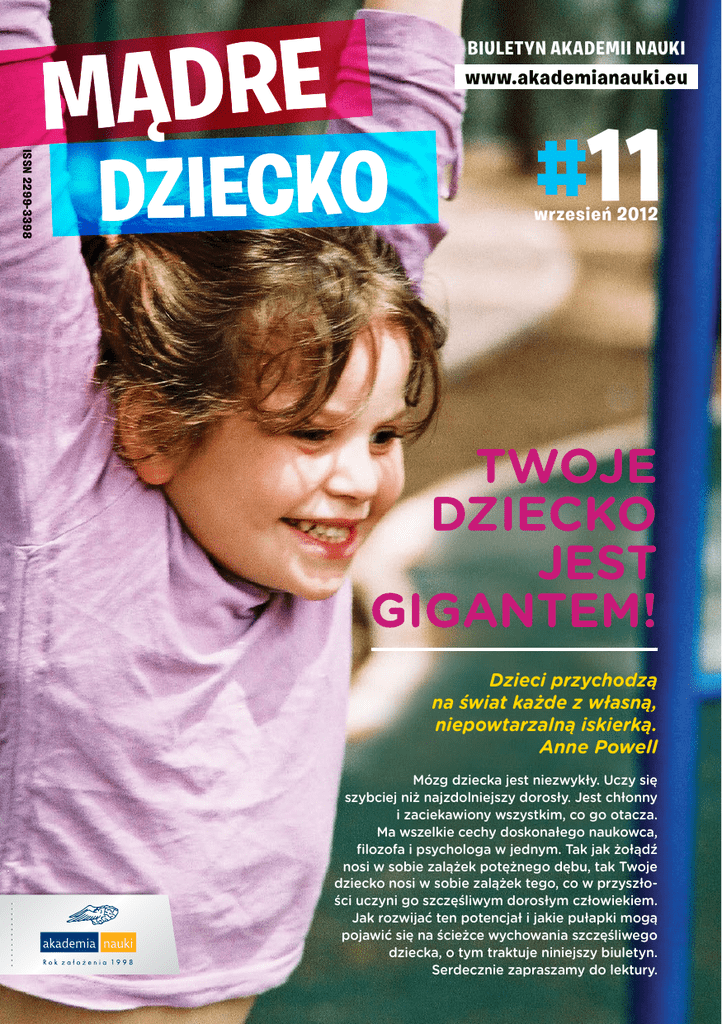 ISSN 2299-3398 mądre BIULETYN AKADEMII NAUKI www.akademianauki.eu dziecko #11 wrzesień 2012 TwOJE DZIECKO jest gigantem! Dzieci przychodzą na świat każde z własną, niepowtarzalną iskierką. Anne Powell Mózg dziecka jest niezwykły. Uczy się szybciej niż najzdolniejszy dorosły. Jest chłonny i zaciekawiony wszystkim, co go otacza. Ma wszelkie cechy doskonałego naukowca, filozofa i psychologa w jednym. Tak jak żołądź nosi w sobie zalążek potężnego dębu, tak Twoje dziecko nosi w sobie zalążek tego, co w przyszłości uczyni go szczęśliwym dorosłym człowiekiem. Jak rozwijać ten potencjał i jakie pułapki mogą pojawić się na ścieżce wychowania szczęśliwego dziecka, o tym traktuje niniejszy biuletyn. Serdecznie zapraszamy do lektury. Geny czy Środowisko? Któregoś razu poszliśmy z córką na festiwal nauki. Zatrzymaliśmy się koło dziewczynki, która pokazywała wyhodowane przez siebie roślinki. Z pasją tłumaczyła, że każde ziarenko, które zasadziła miało ten sam materiał genetyczny. Z ziarna, które zostało zasadzone w bogatej glebie, wyrosła piękna, silna roślina, natomiast z ziarna, które włożono w glebę ubogą, wyrosła roślina wiotka i słaba. Obydwa ziarna miały ten sam potencjał wzrostu, jednak eksperyment dziewczynki pokazał, że sam potencjał nie wystarczył – potrzebna była również odpowiednia gleba i woda. Dziś wśród genetyków panuje względna zgoda, że połowa naszych potencjałów jest w naszych genach i żadne środowisko tego nie zmieni. Ale genetycy są również zgodni, że jesteśmy w stanie wpłynąć na zachowanie naszych dzieci w dużo większym stopniu, niż większość ludzi sądzi. Tworząc określone środowiska, dziecko może rozwijać niemal każdy aspekt swoich talentów umysłowych. Przez odpowiednio skonstruowane treningi można stymulować zarówno ich pamięć, jak i kreatywność. Wykonując eksperymenty naukowe (stawiając hipotezy i obserwując wyniki), dzieci rozwijają swoją ciekawość świata, a czytając książki, nie tylko poszerzają swoją wiedzę (inteligencję skrystalizowaną), ale również podnoszą sprawność komunikacji werbalnej. Geny są ważne, ale bez bogatej gleby/środowiska, trudno jest dziecku poszerzać własne talenty i możliwości. O prawdziwości tego twierdzenia może świadczyć fakt, że od dziesięcioleci nasz iloraz inteligencji stale rośnie. Od 1947 do 2002 roku przeciętne IQ amerykańskich dzieci wzrosło o 18 punktów. Bogate i złożone środowisko wpływa na inteligencję dzieci! Mózg dziecka a Wychowanie Bogate Środowisko – inteligentny mózg Człowiek ma najdłuższe dzieciństwo na planecie (może z wyjątkiem wielorybów). To za sprawą naszych mózgów, dużych, pięknych i niezwykle złożonych, które nosimy w naszych czaszkach. Media często przedstawiają nasz potencjał intelektualny jako coś trwałego. Niektórzy rodzą się inteligentni, a inni nie. To założenie jest kojąco prostoduszne, ale inteligencja jest dużo bardziej złożona, niż się to na pierwszy rzut oka wydaje. O nieprawdziwości tej tezy może świadczyć fakt, że od dziesięcioleci nasz iloraz inteligencji stale rośnie. Od 1947 do 2002 roku przeciętne IQ amerykańskich dzieci wzrosło o 18 punktów. Bogate i złożone środowisko wpływa na inteligencję dzieci! To dla nas rodziców bardzo ważna informacja – to, co zrobimy w czasie pierwszych pięciu lat życia naszych pociech, będzie miało ogromny wpływ na ich dorosłe życie. Wiemy to chociażby z wyników eksperymentu, który nosi nazwę High/Scope Perry. W eksperymencie tym badaniami zostało objętych 123 afroamerykańskich dzieci pochodzących z ubogich domów, u których stwierdzono duży współczynnik ryzyka niepowodzeń szkolnych. Po wstępnej selekcji badano dzieci testem inteligencji Stanforda-Bineta i wybierano te, których IQ mieściło się w przedziale między 70 a 85. Według ewolucjonistów nasze mózgi zawdzięczamy energii, którą zaoszczędziliśmy, kiedy nauczyliśmy się chodzić na dwóch nogach (zamiast na czterech). Miało to jednak również swoją cenę – chodzenie na dwóch nogach spowodowało zwężenie kanału miednicy. Biolodzy uważają, że wywołało to swoisty konflikt między szerokością kanału rodnego a wielkością główki dziecka (a zatem i jego mózgu). Gdyby główka była za duża, to poród sprawiałby potworny ból i byłby niebezpieczny dla rodzącej kobiety albo dziecko nie mogłoby przyjść na świat. Dlatego ludzkie dzieci rodzą się, zanim ich główki nadmiernie się rozrosną, i przychodzą na świat z mózgami, 2 Czwartoklasista przyniósł do domu świadectwo. Ojciec je przejrzał i z poważną miną zapytał: „I jak wyjaśnisz te dwóje i jedynki?”. Syn niewzruszony odpowiedział : „Ty mi powiedz: geny czy wychowanie?”. których rozwój tak na dobrą sprawę dopiero się rozpoczyna (w odróżnieniu od mózgów zwierząt, które w momencie urodzenia w 90 procentach są już rozwinięte). Mały mózg, schowany w główce naszego ślicznego bobaska, zanim dojrzeje potrzebuje przez wiele lat wsparcia ze strony bardziej doświadczonych mózgów. Nasz uroczy bobas, potrzebuje również środowiska, które umożliwi mu rozwinięcie umiejętności (zarówno intelektualnych, jak i emocjonalnych) pozwalających w przyszłości stać się szczęśliwym dorosłym człowiekiem. Udzielanie wsparcia i tworzenie bogatego środowiska rozwoju dla mózgu naszego oseska nazywamy wychowaniem. Wydawca: Akademia Nauki M. Hoffman A. Nowacka S. J. Adres redakcji: ul. Ratajczaka 35, 61-816 Poznań, Redaktor naczelny: Marek Hoffman Następnie podzielono losowo uczniów na dwie grupy – w jednej wprowadzono nowatorski program rozwoju przedszkolaków High/ Scope, druga była grupą kontrolną. Uczestników eksperymentu obserwowano aż do ich czterdziestych szóstych urodzin. Dzieci, które brały udział w programie, spisywały się lepiej niż dzieci z 