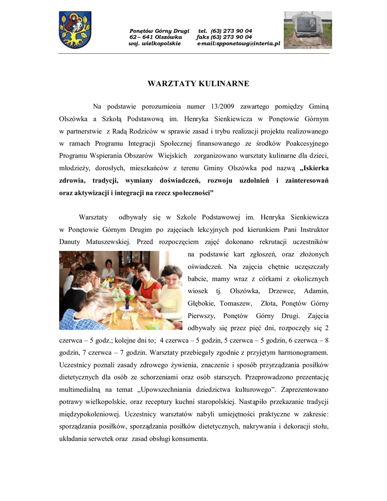 Ponętów Górny Drugi 62 – 641 Olszówka woj. wielkopolskie tel. (63) 273 90 04 faks (63) 273 90 04 e-mail:[email protected] WARZTATY KULINARNE Na podstawie porozumienia numer 13/2009 zawartego pomiędzy Gminą Olszówka a Szkołą Podstawową im. Henryka Sienkiewicza w Ponętowie Górnym w partnerstwie z Radą Rodziców w sprawie zasad i trybu realizacji projektu realizowanego w ramach Programu Integracji Społecznej finansowanego ze środków Poakcesyjnego Programu Wspierania Obszarów Wiejskich zorganizowano warsztaty kulinarne dla dzieci, młodzieży, dorosłych, mieszkańców z terenu Gminy Olszówka pod nazwą „Iskierka zdrowia, tradycji, wymiany doświadczeń, rozwoju uzdolnień i zainteresowań oraz aktywizacji i integracji na rzecz społeczności” Warsztaty odbywały się w Szkole Podstawowej im. Henryka Sienkiewicza w Ponętowie Górnym Drugim po zajęciach lekcyjnych pod kierunkiem Pani Instruktor Danuty Matuszewskiej. Przed rozpoczęciem zajęć dokonano rekrutacji uczestników na podstawie kart zgłoszeń, oraz złożonych oświadczeń. Na zajęcia chętnie uczęszczały babcie, mamy wraz z córkami z okolicznych wiosek tj. Olszówka, Głębokie, Tomaszew, Pierwszy, Ponętów Drzewce, Adamin, Złota, Ponętów Górny Górny Drugi. Zajęcia odbywały się przez pięć dni, rozpoczęły się 2 czerwca – 5 godz.; kolejne dni to; 4 czerwca – 5 godzin, 5 czerwca – 5 godzin, 6 czerwca – 8 godzin, 7 czerwca – 7 godzin. Warsztaty przebiegały zgodnie z przyjętym harmonogramem. Uczestnicy poznali zasady zdrowego żywienia, znaczenie i sposób przyrządzania posiłków dietetycznych dla osób ze schorzeniami oraz osób starszych. Przeprowadzono prezentację multimedialną na temat „Upowszechniania dziedzictwa kulturowego”. Zaprezentowano potrawy wielkopolskie, oraz receptury kuchni staropolskiej. Nastąpiło przekazanie tradycji międzypokoleniowej. Uczestnicy warsztatów nabyli umiejętności praktyczne w zakresie: sporządzania posiłków, sporządzania posiłków dietetycznych, nakrywania i dekoracji stołu, układania serwetek oraz zasad obsługi konsumenta. Istotnym elementem warsztatów był pokaz kulinarny na turnieju zorganizowanym z okazji Zielonych Świątek. Na poszczególnych stoiskach zaprezentowano przygotowane potrawy i umiejętności praktyczne. stoisko I – układnie serwetek wraz z instruktarzem, stoisko II – nakrycie i dekoracja stołu, stoisko III – potrawy wielkopolskie, stoisko IV – dania mięsne i zupy, stoisko V – sałatki i surówki, stoisko VI – przekąski zimne i gorące, stoisko VII – ciasta i słodkie smakołyki. Uczestnicy turnieju mogli degustować przygotowane przysmaki, zapytać o receptury oraz sposób przyrządzania. Na potrzeby warsztatów kulinarnych opracowano broszurę „Receptury potraw przyrządzanych na warsztatach kulinarnych w ramach realizacji usługi pod nazwą „Iskierka zdrowia, tradycji i wymiany doświadczeń”. Uczestniczki 30 godzinnych warsztatów kulinarnych otrzymały Certyfikaty. O pysznościach i smakołykach jakie prezentowały uczestniczki warsztatów kulinarnych można było przeczytać w tygodniku lokalnym 16-22 czerwca 2009 24 (5600) INDEX: 34771X PRZEGLĄD KOLSKI