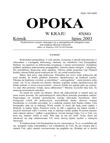 ISSN 1505-0890 OPOKA W KRAJU Kórnik 45(66) lipiec 2003 Wydawnictwo seryjne, ukazujące się w nieregularnych odstępach czasu pod redakcją Macieja Giertycha Adres: ul. Parkowa 19/8, 62-035 Kórnik. -------------------------------------------------------------------------------------------------------Co teraz? Referendum przegraliśmy. Z woli narodu, wyrażonej w sposób zdecydowany w referendum z wymaganą frekwencją, staniemy się członkiem Unii Europejskiej. Daliśmy się namówić na dobrowolną rezygnację z naszej suwerenności. Zostaliśmy poddani nachalnej jednostronnej propagandzie, istnemu praniu mózgów, i ulegliśmy. Nie potrafiliśmy skutecznie temu zapobiec. Główny punkt programu Ligi Polskich Rodzin, obrona Polski przed wejściem do UE, nie został zrealizowany. Mamy dziś nowy etap polityczny. Potrzebna jest nowa wizja polityczna jak teraz działać, by bronić polskich interesów. Spodziewamy się trudnych czasów. Nikomu nie będziemy wytykać „a mówiliśmy”, „ostrzegaliśmy”. „sami jesteście sobie winni” itd. To by niczemu nie służyło. Musimy wspólnie szukać najwłaściwszej dla Polski polityki w nowej rzeczywistości. „Jeszcze Polska nie zginęła póki my żyjemy. Co nam obca przemoc wzięła, mocą odbierzemy!” Musimy wyzwolić taką moc, by utraconą suwerenność odzyskać. Na naród nie wolno się obrażać. Skoro tak zadecydował, to musiał mieć po temu ważne powody. Do najważniejszych zaliczyłbym potrzebę posiadania nadziei. Pogarszająca się sytuacja ekonomiczna szarego obywatela, bezrobocie, afery korupcyjne wśród elit politycznych, niewydolność służby zdrowia, rosnąca biurokracja, to wszystko powoduje, że o nadzieję ostatnio było bardzo trudno. Unia Europejska stała się tą nadzieją. Wielu uznało, że może jak będą nami rządzić z Brukseli, to będzie lepiej. Ponieważ wiem, że nikt z zagranicy nie będzie myślał o naszych interesach tylko o swoich, więc te nadzieje szybko padną. Po prostu musimy sami zakasać rękawy i zadbać o gospodarczy rozwój naszego kraju. Czy w Unii, czy poza nią, musimy zrobić to sami. Nikt tego za nas nie zrobi. Teraz, skoro już zakończył się etap reklamowania UE, może łatwiej będzie myśleć o własnych interesach. W każdym kraju Unii Europejskiej są tzw. eurosceptycy. To ci, co podobnie jak my, przegrali walkę referendalną o nie wchodzenie do Unii. Są oni rosnącą siłą w ramach Unii, gdyż stopień rozczarowania nią pogłębia się. Działają oni w dwóch 1 kierunkach. Po pierwsze są antyfederalistami, czyli walczą o to, by nie powiększać kompetencji władz centralnych Unii kosztem państw narodowych. Zwalczają samą ideę wspólnej konstytucji Europy. Domagają się, by przed wejściem w życie była poddana referendom we wszystkich krajach członkowskich, w nadziei, że któryś ją odrzuci i wobec tego nie wejdzie w życie. Nie chcą wspólnego prezydenta, wspólnego ministra spraw zagranicznych, wspólnego wojska (wystarcza im NATO) itd. Ci co nie weszli do strefy euro walczą, by pozostać poza nią. Po drugie walczą o to, by redukować już istniejące uzależnienie państw narodowych od decyzji centralnych, czyli o wyzwalanie się spod kontroli brukselskiej. W szczególności chcą likwidacji wspólnej polityki rolnej. W sposób oczywisty jako polscy eurosceptycy dołączymy do tego obozu i będziemy z nim współpracować na rzecz obrony państw narodowych i ich prerogatyw. W dziedzinie wyzwalania się spod obcej kurateli mamy szczególne doświadczenie. To Polska potrafiła stawić czoło kurateli moskiewskiej i wypracować rosnący zakres swobody w ramach bloku sowieckiego. Przeciwstawiliśmy się kolektywizacji w rolnictwie, obroniliśmy godne miejsce dla Kościoła, nie daliśmy się wciągnąć w wojny kolonialne (Angola, Nikaragua), zachowaliśmy szczątkowy, ale zdolny do regeneracji zakres prywatnej inicjatywy (handel, rzemiosło) i wreszcie naszą postawą rozwaliliśmy cały system. (Dziś świat pamięta upadek muru berlińskiego, ale zapomina, że odbył on się za parawanem Polski). Dokonaliśmy tego metodą pokojową. Także i teraz będziemy musieli w sposób pokojowy szukać sposobów na przywracanie suwerenności Polsce i zapewne też innym krajom - bo zawsze postawa Polski ma wpływ sięgający daleko poza jej granice. Wreszcie jestem przekonany, że prędzej czy później (mam nadzieję, że szybko) Unia się rozleci. Dumne narody europejskie nie wytrzymają zapędów centralistycznych Brukseli. Już z okazji wojny w Iraku widać było poważne pęknięcia. W Parlamencie Europejskim działają wielonarodowe grupy polityczne (chadecy, socjaliści, zieloni itd.), a nie kluby narodowościowe, ale gdy nowy przewodniczący UE Sylvio Berlusconi obraził posła niemieckiego zaraz widzieliśmy mobilizacje po linii podziałów narodowych, a nie orientacji politycznych. W Unii Europejskiej znajdzie się teraz spora grupa państw byłego bloku sowieckiego, z jednej strony borykających się z problemami własnej transformacji, a z drugiej próbujących coś dla siebie wyszarpać z kasy brukselskiej. Nie będzie nam łatwo, ale działając wspólnie może uda się więcej załatwić dla siebie w Brukseli, niż w pojedynkę. Polska jest największym krajem w tej grupie, naszym więc zadaniem musi być zorganizowanie wspólnego nacisku na zastane w Brukseli struktury w naszym wspólnym interesie. Duże kraje już należące do Unii (Niemcy, Francja, Anglia, Włochy) będą próbowały wziąć pod swoje opiekuńcze skrzydła poszczególnych nowych członków, by przy pomocy ich głosów załatwiać swoje interesy. Możemy temu zapobiec przez trzymanie się razem i wspólne walczenie o interesy wynikające z naszej specyfiki. Nasze rolnictwo, na ogół ekstensywne, tradycyjne, w małym zakresie stosujące chemię, trzeba będzie bronić przed losem, jaki spotkało rolnictwo krajów 15 w wyniku wspólnej polityki rolnej preferującej pr