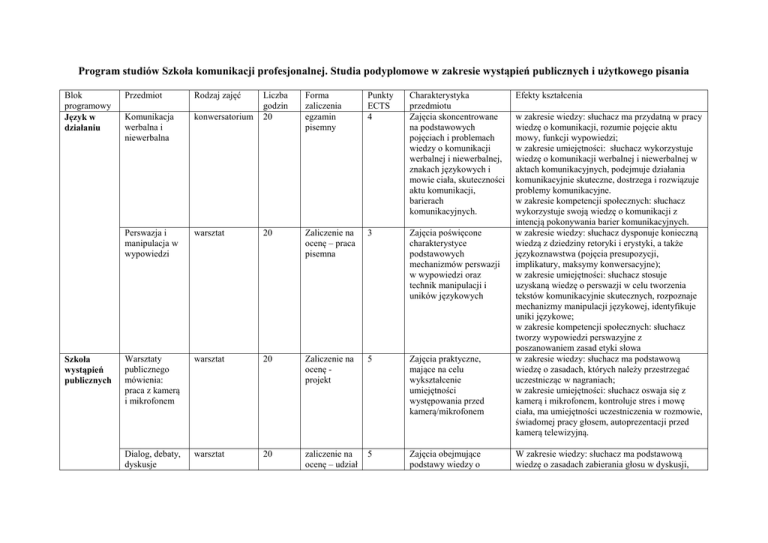 Program studiów Szkoła komunikacji profesjonalnej. Studia podyplomowe w zakresie wystąpień publicznych i użytkowego pisania Blok programowy Język w działaniu Szkoła wystąpień publicznych Przedmiot Rodzaj zajęć konwersatorium Liczba godzin 20 Forma zaliczenia egzamin pisemny Punkty ECTS 4 Charakterystyka przedmiotu Zajęcia skoncentrowane na podstawowych pojęciach i problemach wiedzy o komunikacji werbalnej i niewerbalnej, znakach językowych i mowie ciała, skuteczności aktu komunikacji, barierach komunikacyjnych. Komunikacja werbalna i niewerbalna Perswazja i manipulacja w wypowiedzi warsztat 20 Zaliczenie na ocenę – praca pisemna 3 Zajęcia poświęcone charakterystyce podstawowych mechanizmów perswazji w wypowiedzi oraz technik manipulacji i uników językowych Warsztaty publicznego mówienia: praca z kamerą i mikrofonem warsztat 20 Zaliczenie na ocenę projekt 5 Zajęcia praktyczne, mające na celu wykształcenie umiejętności występowania przed kamerą/mikrofonem Dialog, debaty, dyskusje warsztat 20 zaliczenie na ocenę – udział 5 Zajęcia obejmujące podstawy wiedzy o Efekty kształcenia w zakresie wiedzy: słuchacz ma przydatną w pracy wiedzę o komunikacji, rozumie pojęcie aktu mowy, funkcji wypowiedzi; w zakresie umiejętności: słuchacz wykorzystuje wiedzę o komunikacji werbalnej i niewerbalnej w aktach komunikacyjnych, podejmuje działania komunikacyjnie skuteczne, dostrzega i rozwiązuje problemy komunikacyjne. w zakresie kompetencji społecznych: słuchacz wykorzystuje swoją wiedzę o komunikacji z intencją pokonywania barier komunikacyjnych. w zakresie wiedzy: słuchacz dysponuje konieczną wiedzą z dziedziny retoryki i erystyki, a także językoznawstwa (pojęcia presupozycji, implikatury, maksymy konwersacyjne); w zakresie umiejętności: słuchacz stosuje uzyskaną wiedzę o perswazji w celu tworzenia tekstów komunikacyjnie skutecznych, rozpoznaje mechanizmy manipulacji językowej, identyfikuje uniki językowe; w zakresie kompetencji społecznych: słuchacz tworzy wypowiedzi perswazyjne z poszanowaniem zasad etyki słowa w zakresie wiedzy: słuchacz ma podstawową wiedzę o zasadach, których należy przestrzegać uczestnicząc w nagraniach; w zakresie umiejętności: słuchacz oswaja się z kamerą i mikrofonem, kontroluje stres i mowę ciała, ma umiejętności uczestniczenia w rozmowie, świadomej pracy głosem, autoprezentacji przed kamerą telewizyjną. W zakresie wiedzy: słuchacz ma podstawową wiedzę o zasadach zabierania głosu w dyskusji, w dyskusji Szkoła pisania debatowaniu i dyskutowaniu oraz obszerną część warsztatową Emisja głosu warsztat 20 zaliczenie na ocenę – aktywny udział w warsztacie 3 Zajęcia poświęcone kształtowaniu umiejętności w zakresie mówienia Zasady organizacji wypowiedzi konwersatorium 20 zaliczenie na ocenę – praca pisemna 4 Zajęcia przygotowujące słuchaczy do tworzenia użytkowych tekstów pisemnych warsztat zawodowego pisania warsztat 30 zaliczenie na ocenę – praca roczna/projekt 6 Warsztatowe zajęcia z użytkowego pisania argumentowania, uczestniczenia w dialogu, organizowania debaty w zakresie umiejętności: słuchacz skutecznie uczestniczy w dyskusji, zajmuje stanowisko i konstruuje argumenty, organizuje debatę i/lub bierze w niej udział w zakresie kompetencji społecznych: słuchacz uczestniczy w dialogu respektując wymogi etyki słowa W zakresie wiedzy: słuchacz ma elementarną wiedzę o powstawaniu dźwięków mowy i typowych błędach popełnianych w emisji głosu; w zakresie umiejętności: słuchacz skutecznie, wyraźnie i płynnie mówi w sposób respektujący wymogi higieny głosu, bez zbędnego wysiłku, z właściwą dykcją, zachowując wygodną i funkcjonalną postawę ciała. W zakresie wiedzy: słuchacz dysponuje funkcjonalną wiedzą o stylu, kompozycji wypowiedzi, gatunkach mowy, sytuacji komunikacyjnej. W zakresie umiejętności: słuchacz stosuje w praktyce wiedzę dotyczącą stylu, kompozycji, funkcji i gatunku wypowiedzi. W zakresie umiejętności: słuchacz tworzy poprawne, funkcjonalne (informacyjne, promocyjne, perswazyjne), skuteczne teksty respektując wymogi wskazanej konwencji; słuchacz poprawia i przekształca teksty, streszcza i redaguje teksty cudze, dokonuje zmian mających na celu przekształcenie stylu, funkcji, gatunku mowy.