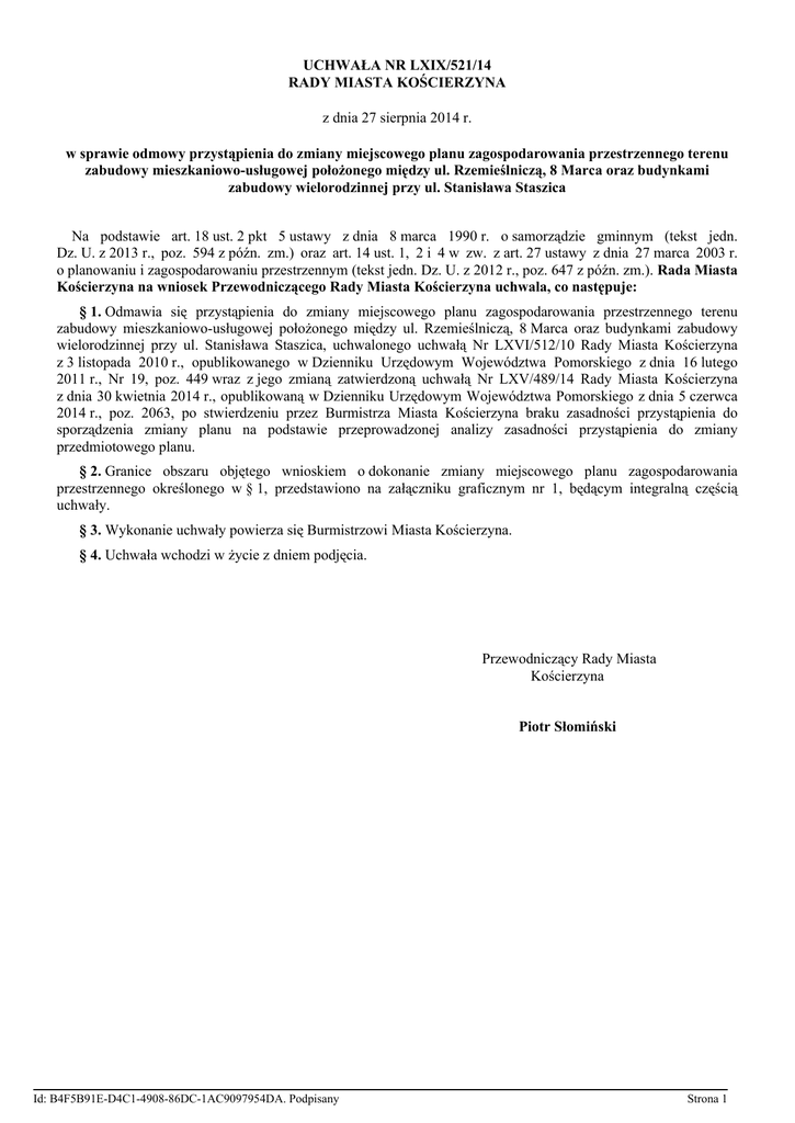 UCHWAŁA NR LXIX/521/14 RADY MIASTA KOŚCIERZYNA z dnia 27 sierpnia 2014 r. w sprawie odmowy przystąpienia do zmiany miejscowego planu zagospodarowania przestrzennego terenu zabudowy mieszkaniowo-usługowej położonego między ul. Rzemieślniczą, 8 Marca oraz budynkami zabudowy wielorodzinnej przy ul. Stanisława Staszica Na podstawie art. 18 ust. 2 pkt 5 ustawy z dnia 8 marca 1990 r. o samorządzie gminnym (tekst jedn. Dz. U. z 2013 r., poz. 594 z późn. zm.) oraz art. 14 ust. 1, 2 i 4 w zw. z art. 27 ustawy z dnia 27 marca 2003 r. o planowaniu i zagospodarowaniu przestrzennym (tekst jedn. Dz. U. z 2012 r., poz. 647 z późn. zm.). Rada Miasta Kościerzyna na wniosek Przewodniczącego Rady Miasta Kościerzyna uchwala, co następuje: § 1. Odmawia się przystąpienia do zmiany miejscowego planu zagospodarowania przestrzennego terenu zabudowy mieszkaniowo-usługowej położonego między ul. Rzemieślniczą, 8 Marca oraz budynkami zabudowy wielorodzinnej przy ul. Stanisława Staszica, uchwalonego uchwałą Nr LXVI/512/10 Rady Miasta Kościerzyna z 3 listopada 2010 r., opublikowanego w Dzienniku Urzędowym Województwa Pomorskiego z dnia 16 lutego 2011 r., Nr 19, poz. 449 wraz z jego zmianą zatwierdzoną uchwałą Nr LXV/489/14 Rady Miasta Kościerzyna z dnia 30 kwietnia 2014 r., opublikowaną w Dzienniku Urzędowym Województwa Pomorskiego z dnia 5 czerwca 2014 r., poz. 2063, po stwierdzeniu przez Burmistrza Miasta Kościerzyna braku zasadności przystąpienia do sporządzenia zmiany planu na podstawie przeprowadzonej analizy zasadności przystąpienia do zmiany przedmiotowego planu. § 2. Granice obszaru objętego wnioskiem o dokonanie zmiany miejscowego planu zagospodarowania przestrzennego określonego w § 1, przedstawiono na załączniku graficznym nr 1, będącym integralną częścią uchwały. § 3. Wykonanie uchwały powierza się Burmistrzowi Miasta Kościerzyna. § 4. Uchwała wchodzi w życie z dniem podjęcia. Przewodniczący Rady Miasta Kościerzyna Piotr Słomiński Id: B4F5B91E-D4C1-4908-86DC-1AC9097954DA. Podpisany Strona 1 Id: B4F5B91E-D4C1-4908-86DC-1AC9097954DA. Podpisany Strona 2 Uzasadnienie Dla fragmentu miasta Kościerzyna położonego w Kościerzynie pomiędzy ul. Rzemieślniczą, ul. 8 Marca, ul. Stanisława Staszica obowiązuje miejscowy plan zagospodarowania przestrzennego. Po przeanalizowaniu wniosków z dnia 24 czerwca 2014 r. złożonych do Rady Miasta Kościerzyna o dokonanie zmiany przedmiotowego miejscowego planu zagospodarowania przestrzennego dla działek oznaczonych nr geodezyjnymi:350/19, 350/50, 350/76, 417/7, 239/13, 270/20, 239/16 obręb 6 stwierdzono, iż na etapie sporządzania zmiany miejscowego planu zagospodarowania przestrzennego terenu zabudowy mieszkaniowo-usługowej położonego pomiędzy ul. Rzemieślniczą, 8 Marca oraz budynkami zabudowy wielorodzinnej przy ul. Stanisława Staszica w Kościerzynie – która została podjęta uchwałą Nr LXV/489/14 Rady Miasta Kościerzyna z dnia 30 kwietnia 2014 r. (publ. Dz. Urz. Woj. Pom. poz. 2063 z dnia 5 czerwca 2014 r.) ci sami wnioskodawcy dwukrotnie składali pisma podobnej treści. Nie został jednak dotrzymany przez wnioskujących ustawowy termin składania uwag do wyłożonegodo publicznego wglądu projektu zmiany planu. Mimo powyższego urbaniści już na tym etapie wnikliwie rozpatrzyli przedmiotowe wnioski, jednakże nie znalazły one ich aprobaty, o czym właściciele zostali powiadomieni. Burmistrz Miasta Kościerzyna wykonał analizę dotyczącą zasadności przystąpienia do sporządzenia zmiany planu i stopnia zgodności przewidywanych rozwiązań z ustaleniami studium. Z jej ustaleń wynika, że uwaga wnioskodawcówodnosi się do terenów już zainwestowanych w pierzei ulicy Rzemieślniczej. Należy podkreślić, że zabudowa wzdłuż ulicy powstała w oparciu o nieobowiązujący już plan regulacyjny uchwalony w latach 90-tych. W planie tym został zaprojektowany jednolity układ zabudowy, który został zrealizowany i obecna forma tej zabudowy pomimo nielicznych przebudów zachowała swój charakter. Jest to zabudowa mieszkaniowo-usługowa ukształtowana wokół ciągu pieszego z ukształtowanym placem. Zabudowa to trzykondygnacyjne budynki gdzie partery stanowią funkcje usługowe, a kolejne kondygnacje to funkcje mieszkalne lub rzadziej również usługi. Wszystkie budynki mają dachy dwuspadowe o jednakowych kątach nachylenia połaci dachowych. Nieliczne obiekty zostały przebudowane w stosunku do pierwotnego założenia, są to jednak stosunkowo nieingerujące mocno w ogólny charakter budynków detale (dodatkowe wejścia, schody, doświetlenia wnętrz). Nie były natomiast poddawane przebudowie główne parametry tej zabudowy, w szczególności zaś nie zwiększano wysokości tych obiektów jak również kształtu dachów głównych brył. Te parametry mają zasadnicze znaczenie dla odbioru całego założenia w przestrzeni i otoczeniu. Jakkolwiek wokół wspomnianej zabudowy, kształtującej pierzeję ul. Rzemieślniczej znajduje się zabudowa bardzo zróżnicowana. Od budynków historycznych wzdłuż ul. 8 Marca, przez zabudowę mieszkaniowo-usługową dwu-, trzykondygnacyjną o różnych formach architektonicznych, aż po typowe budynki wielorodzinne z wielkiej płyty realizowane w latach 80-tych ( o wysokości ok. 15m). Należy jednak podkreślić, że to właśnie jednolity charakter zabudowy wzdłuż ul. Rzemieślniczej jest atutem tej części miasta. Obowiązujący plan miejscowy oraz jego zmiana zostały skonstruowane w taki sposób, aby jak najpełniej zachować charakter tego miejsca zwłaszcza w odniesieniu do tych parametrów zabudowy, które determinują jego odbiór, to jest wysokość zabudowy i kształt dachu, jak również rozplanowane obiekty w rzucie. Przystępując uchwałą Nr XXXVIII/293/12 dnia 28 listopada 2012 r. do zmiany planu nie było żadnych przesłanek, aby ten stan zmienić i dopuszczać do ingerencji w podstawowe obowiązujące ustalen
