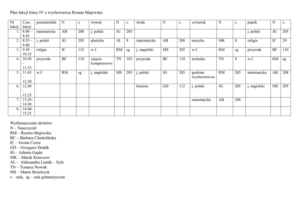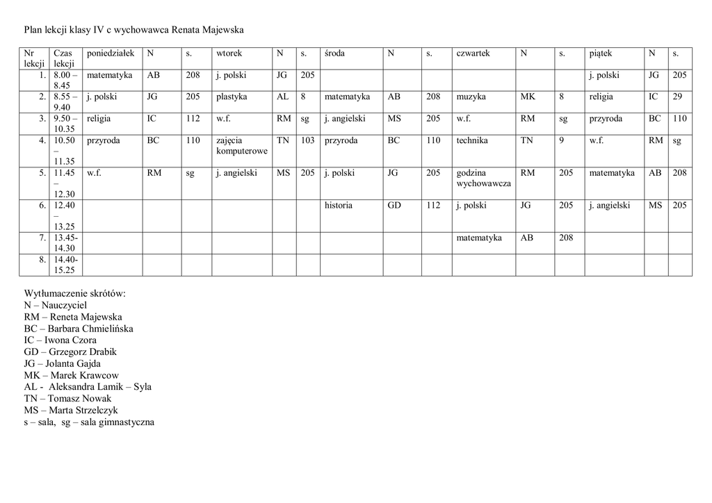 Plan lekcji klasy IV c wychowawca Renata Majewska Nr Czas lekcji lekcji 1. 8.00 – 8.45 2. 8.55 – 9.40 3. 9.50 – 10.35 4. 10.50 – 11.35 5. 11.45 – 12.30 6. 12.40 – 13.25 7. 13.4514.30 8. 14.4015.25 poniedziałek N s. wtorek N s. matematyka AB 208 j. polski JG 205 j. polski JG 205 plastyka AL 8 matematyka AB 208 muzyka MK religia IC 112 w.f. RM sg j. angielski MS 205 w.f. przyroda BC 110 zajęcia TN komputerowe 103 przyroda BC 110 w.f. RM sg j. angielski 205 j. polski JG historia GD Wytłumaczenie skrótów: N – Nauczyciel RM – Reneta Majewska BC – Barbara Chmielińska IC – Iwona Czora GD – Grzegorz Drabik JG – Jolanta Gajda MK – Marek Krawcow AL - Aleksandra Lamik – Syla TN – Tomasz Nowak MS – Marta Strzelczyk s – sala, sg – sala gimnastyczna MS środa N s. czwartek N s. piątek N s. j. polski JG 205 8 religia IC 29 RM sg przyroda BC 110 technika TN 9 w.f. RM sg 205 godzina wychowawcza RM 205 matematyka AB 208 112 j. polski JG 205 j. angielski MS 205 matematyka AB 208